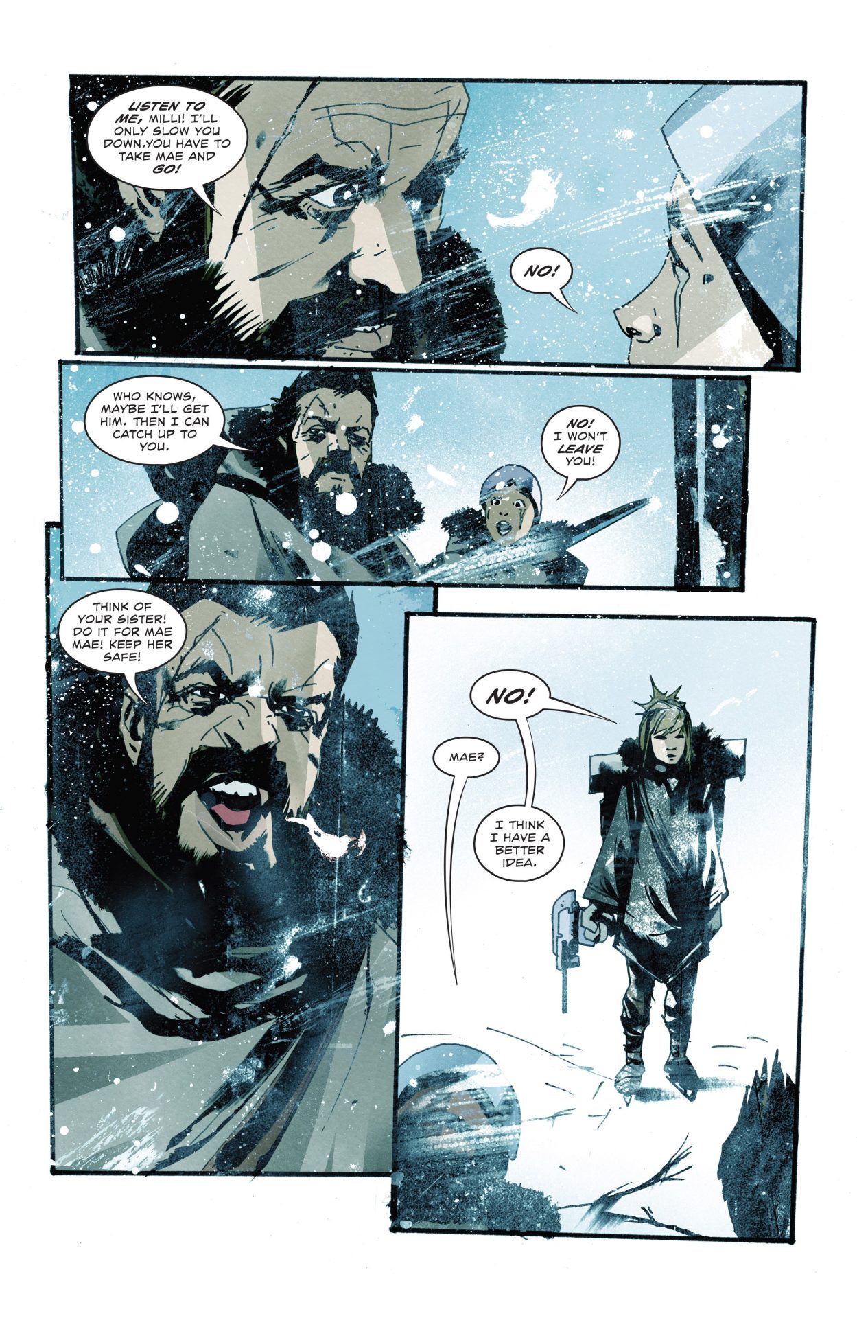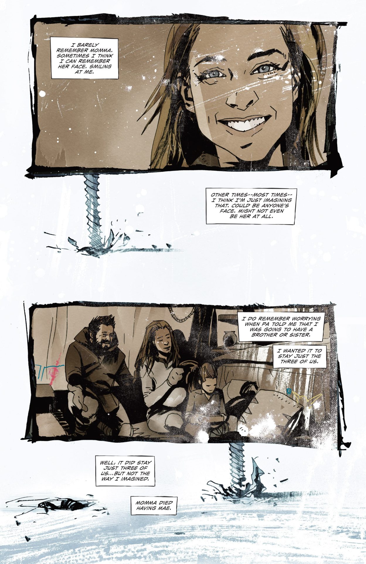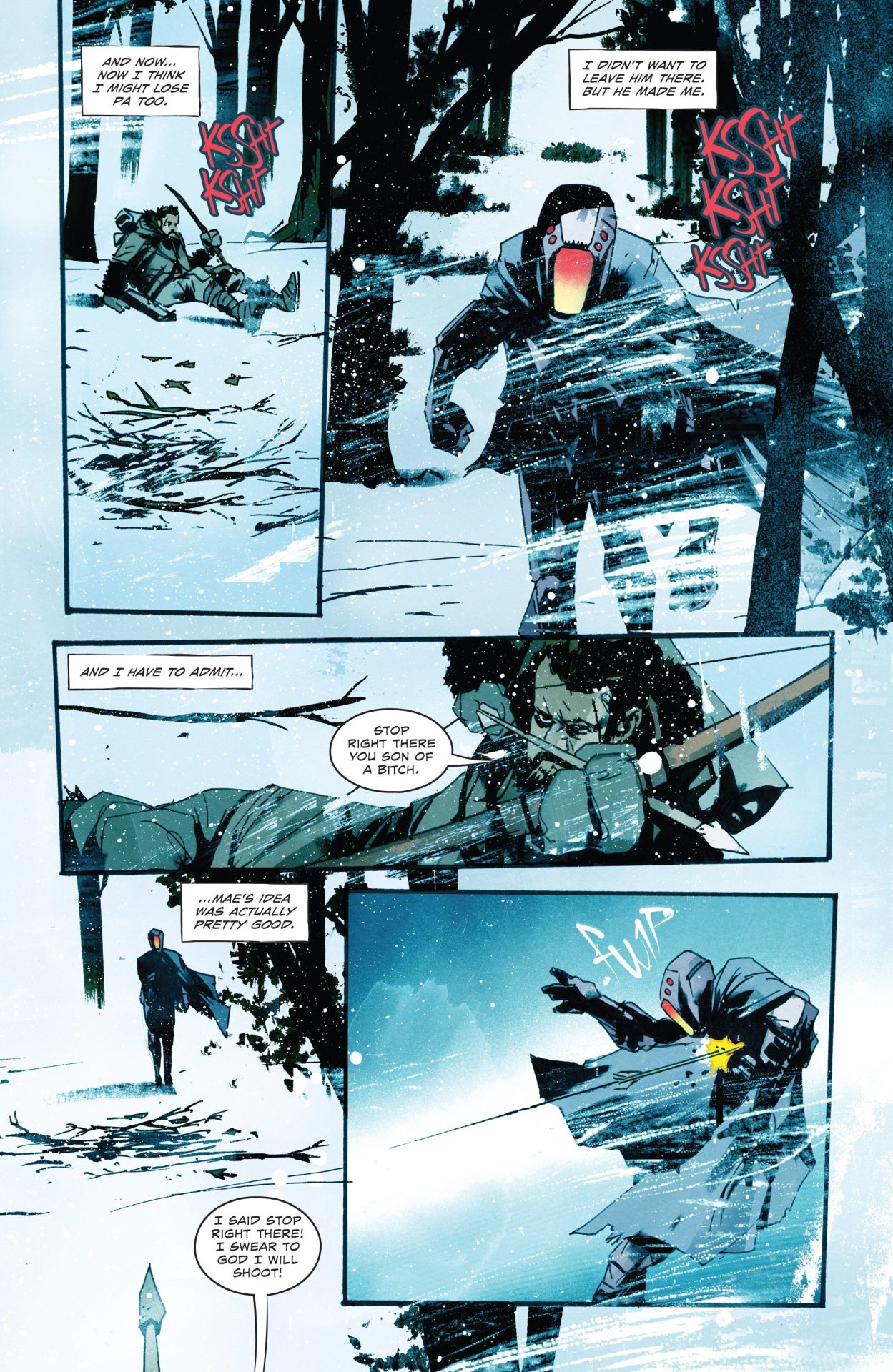 The first issue ended with the shock revelation that their entire village has been slaughtered. In Snow Angels #2, Millie, Mae Mae, and their father come face-to-face with the killer Snowman for the first time! It’s a tense issue as the trio must hide or face being murdered by the unknown entity and force. Why did the Snowman kill so many? One of the three rules were broken but we don’t know by who or what. It’s just a part of the mystery of the story.