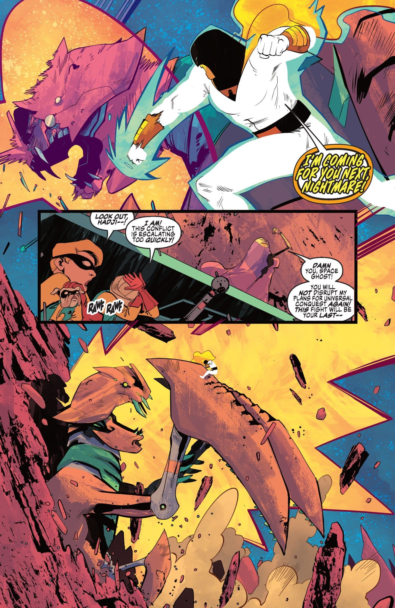 After evading an entire battalion of security at Area 51, Dr. Quest, Race Bannon, Jan, and Jace finally figure out how to get a signal through to Space Ghost. The good news is that the Guardian of the Spaceways is able to use it to open a portal that takes the Phantom Cruiser back to Earth. The bad news is that the portal also brings one of Dr. Nightmare’s mechanical beasts with it!