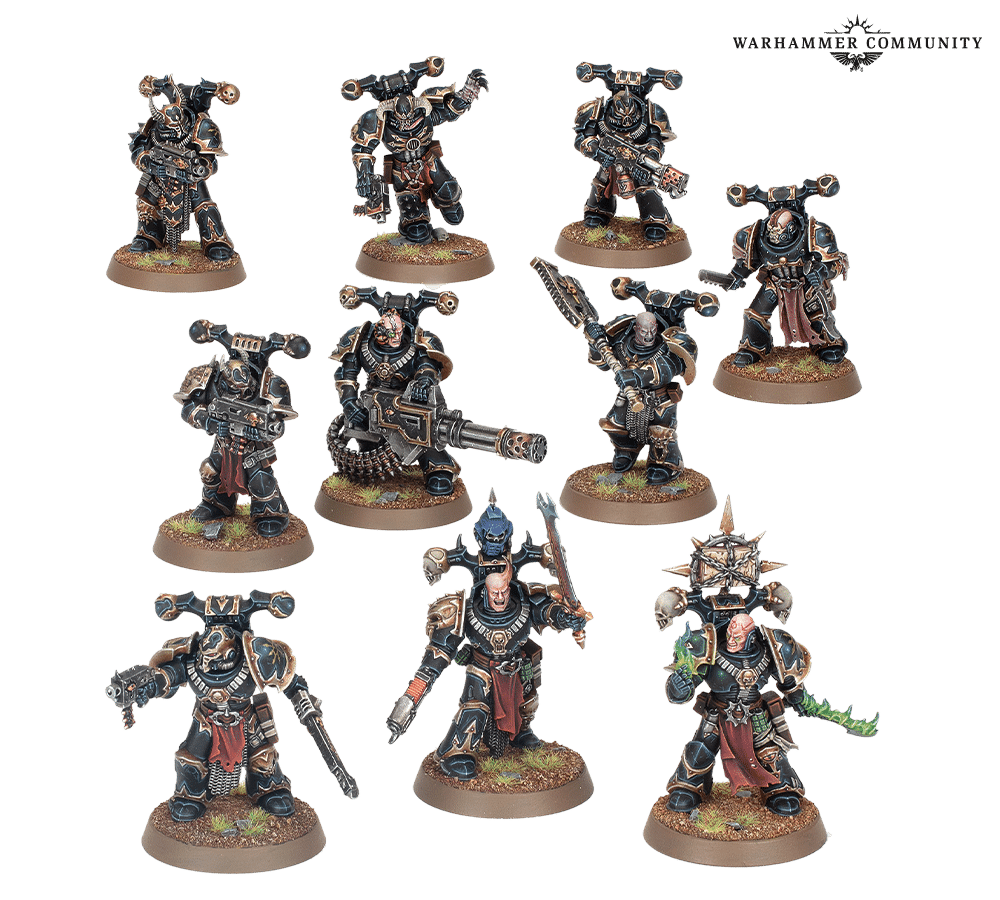 Chaos Space Marines Repacks are three kits previously seen in Kill Team will now be available in Warhammer 40,000 packaging. The Chaos Space Marine Legionaries builds a unit of 10 fearsome Heretic Astartes with 18 head options, 22 interchangeable shoulder pads, an assortment of special and heavy weapons, and enough parts to equip the squad for either ranged or melee combat. The box also comes with a Chaos Space Marines transfer sheet.