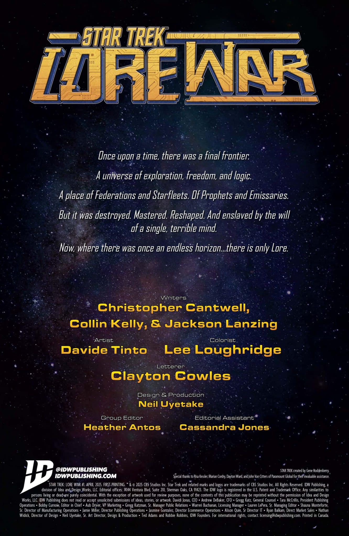 From the Eisner-nominated writers of Star Trek, Jackson Lanzing & Collin Kelly; the critically acclaimed writer of Star Trek: Defiant, Christopher Cantwell; the Eisner-nominated writer of Shaxs’ Best Day, Ryan North; and artists Davide Tinto and Derek Charm comes the next big Star Trek event!