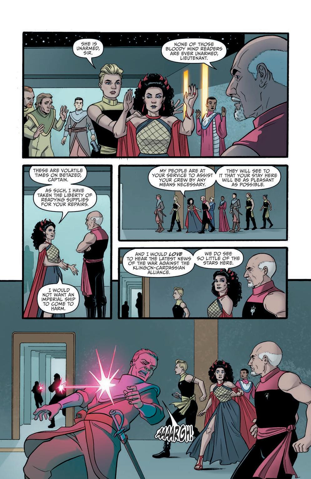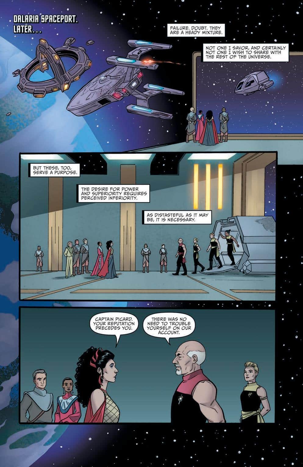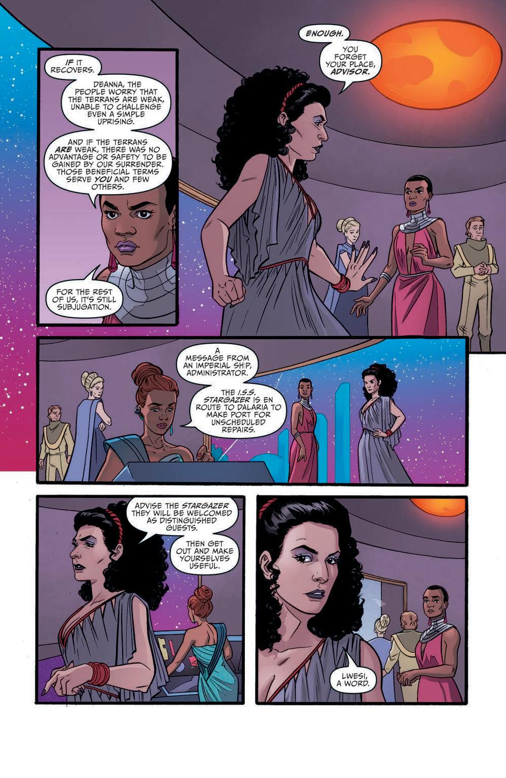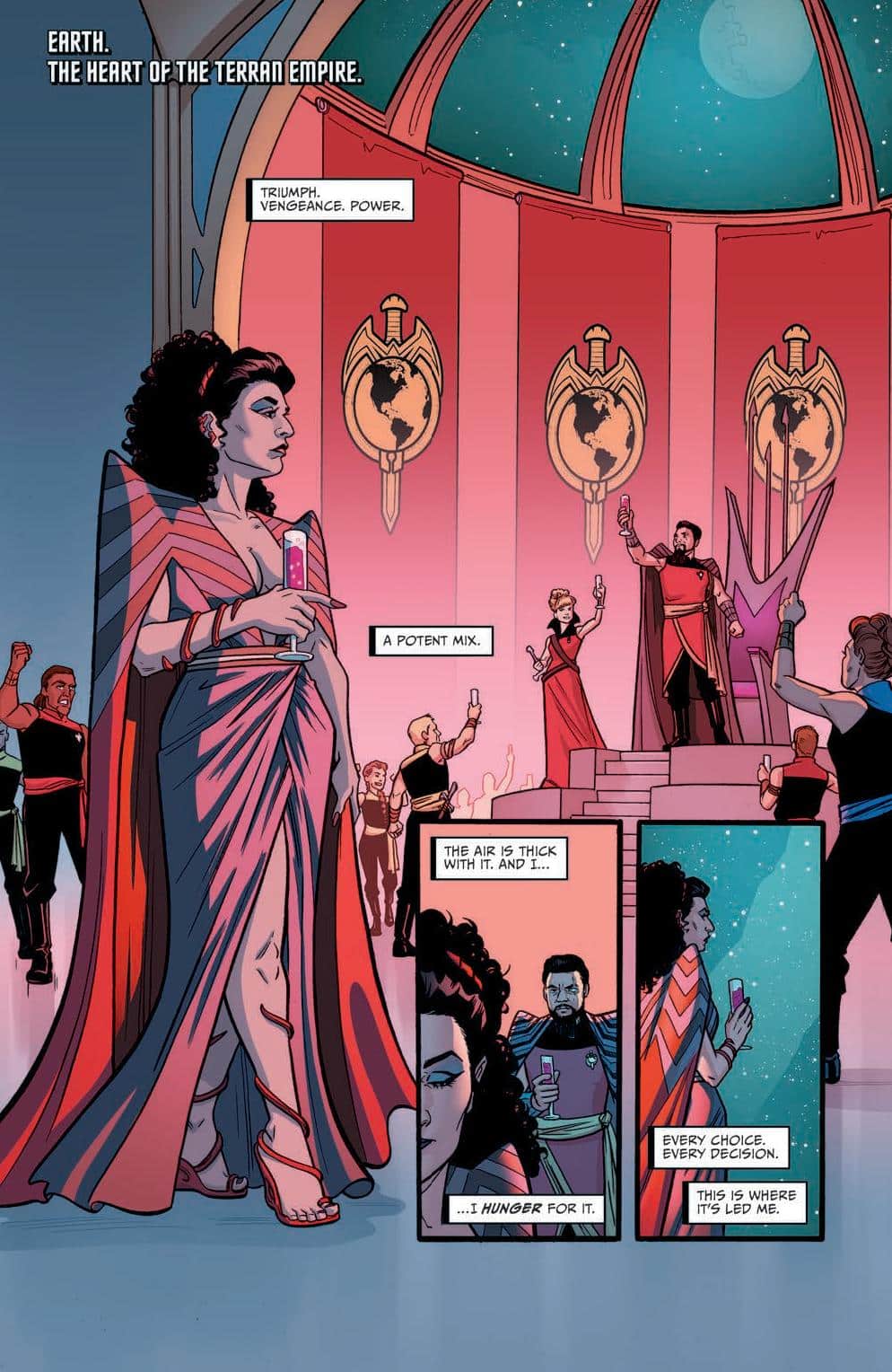 We find Troi back on Earth as she reflects on what got her here, and exactly what she had to sacrifice, as we begin back on Betazed, where we find her giving up her people as a pawn piece to the Empire. We soon find out just how skilled a mind she is, as she meticulously manipulates Picard and the crew of the Stargazer to take out the insurrectionists defying her rule as administrator. The final stroke that imbued her to Picard is her betrayal of her closest advisor, showing that she would do anything for power. By the issue’s end, this version of Troi will do anything to grab power, including murder.
