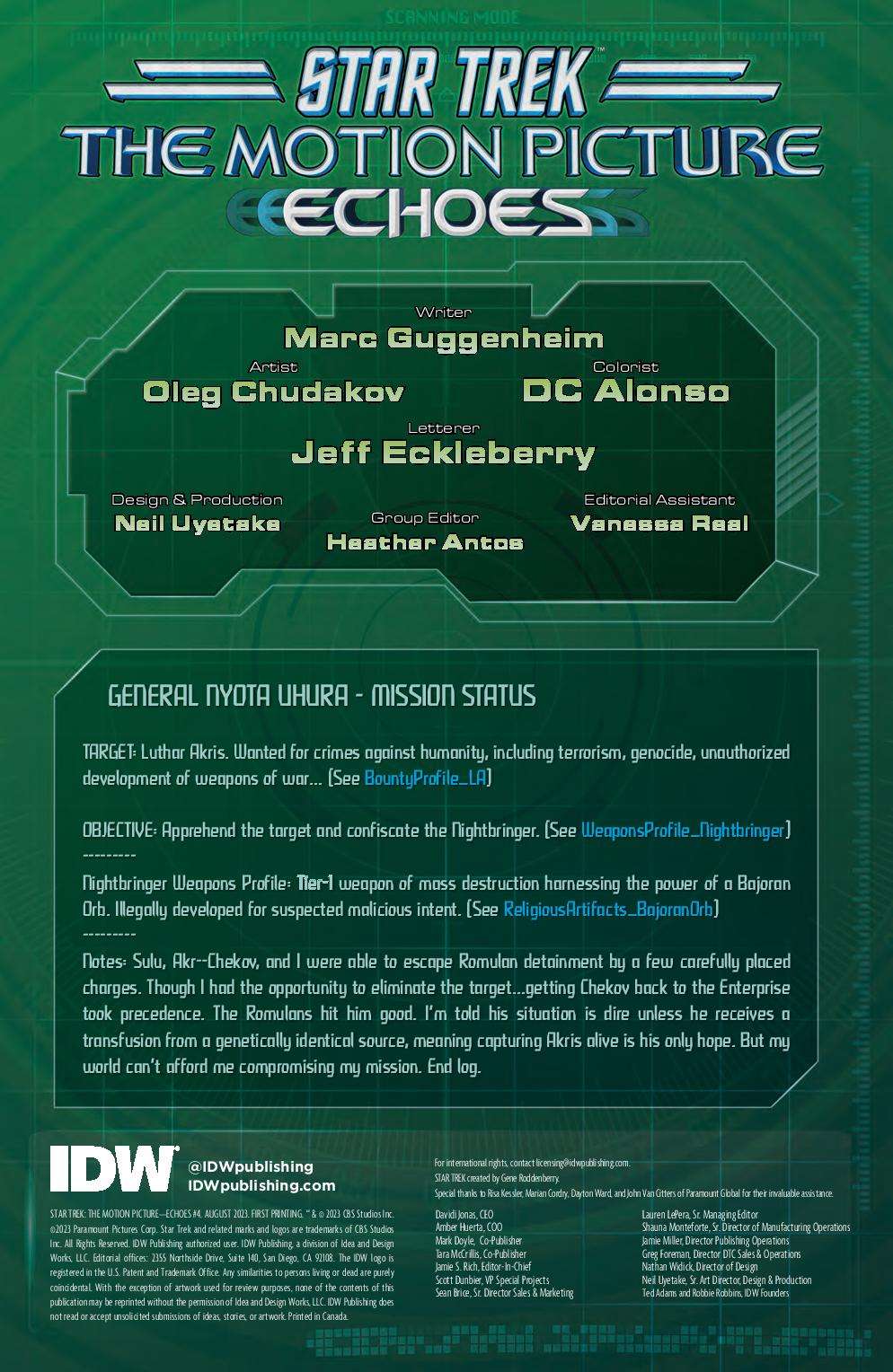 Peace hangs in the balance with Akris and the Romulans’ plans to test the devastating Nightbringer weapon on an innocent population and with the Enterprise crew’s actions treading the line of the Federation-Romulan peace treaty. Meanwhile, Nyota has gone rogue after finding the crew’s actions too passive for her liking. Can Nyota and Kirk set aside their differences to ensure a peaceful resolution and avoid sparking the next intergalactic war? Find out in the finale of Star Trek: The Motion Picture: Echoes!
