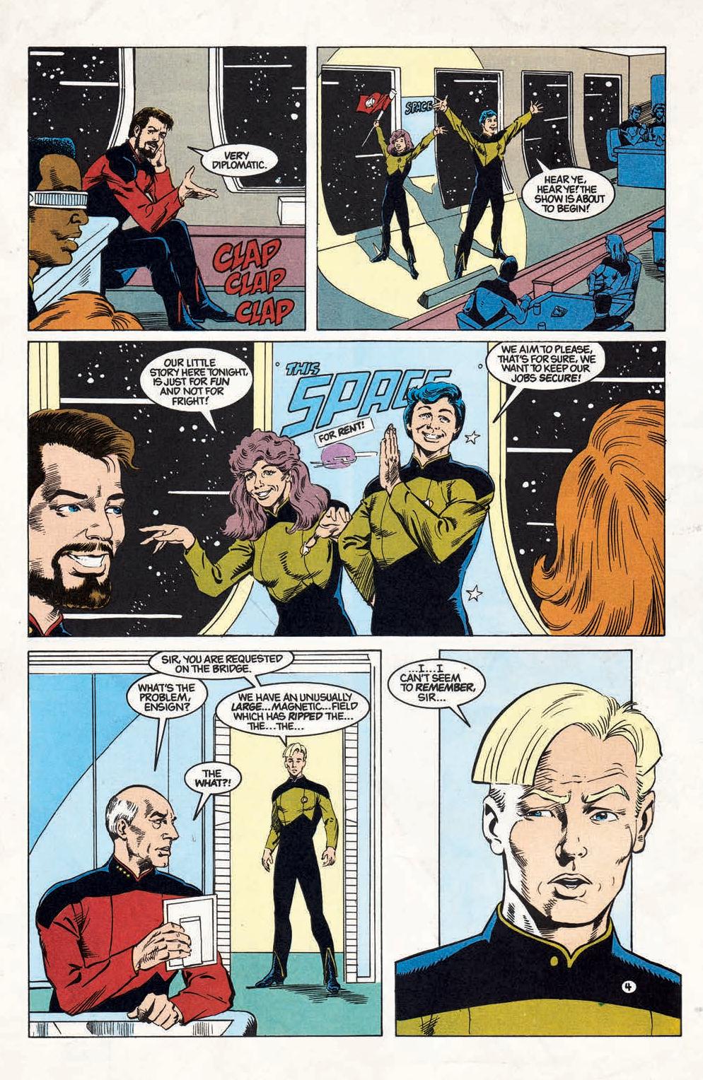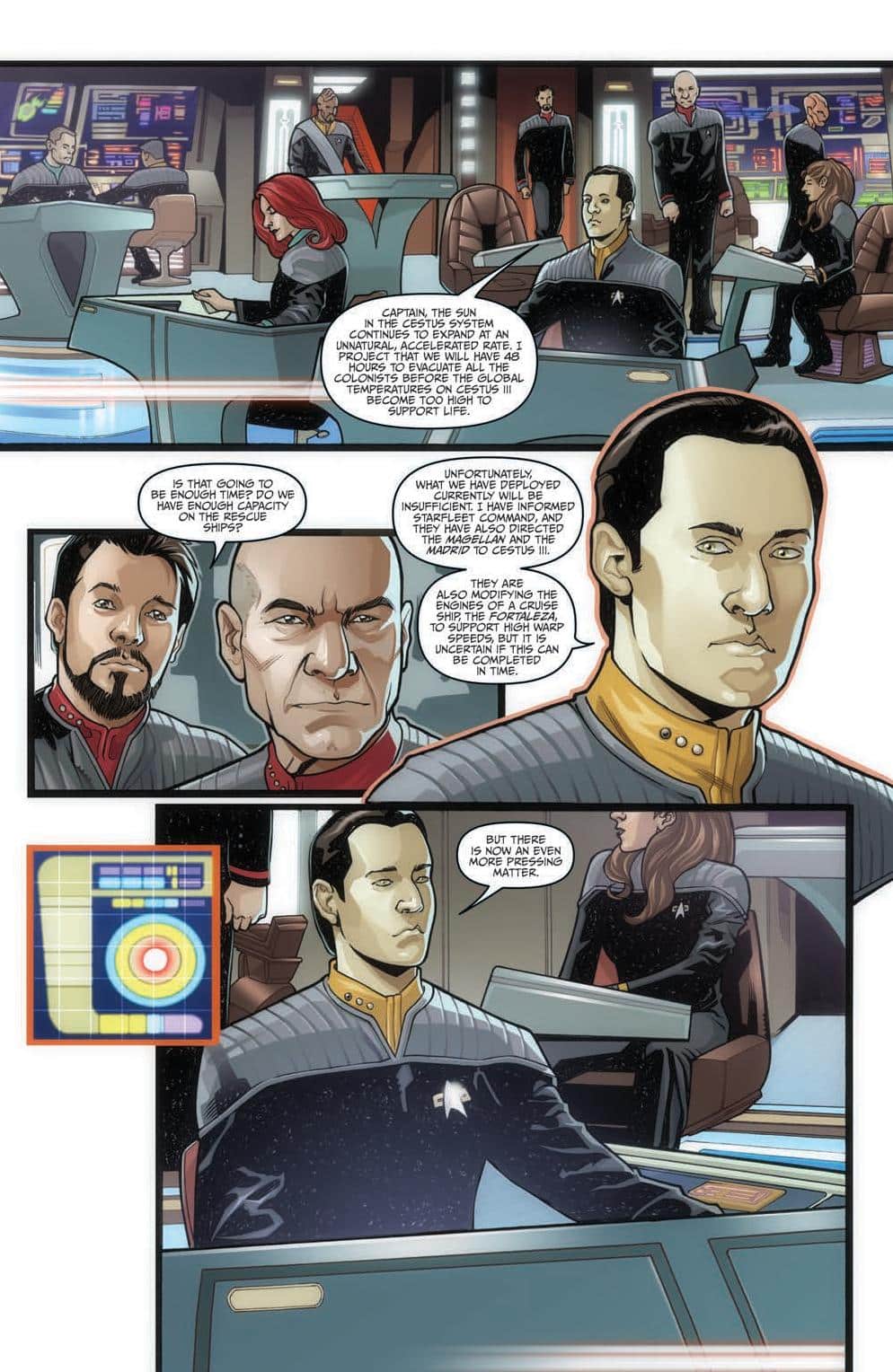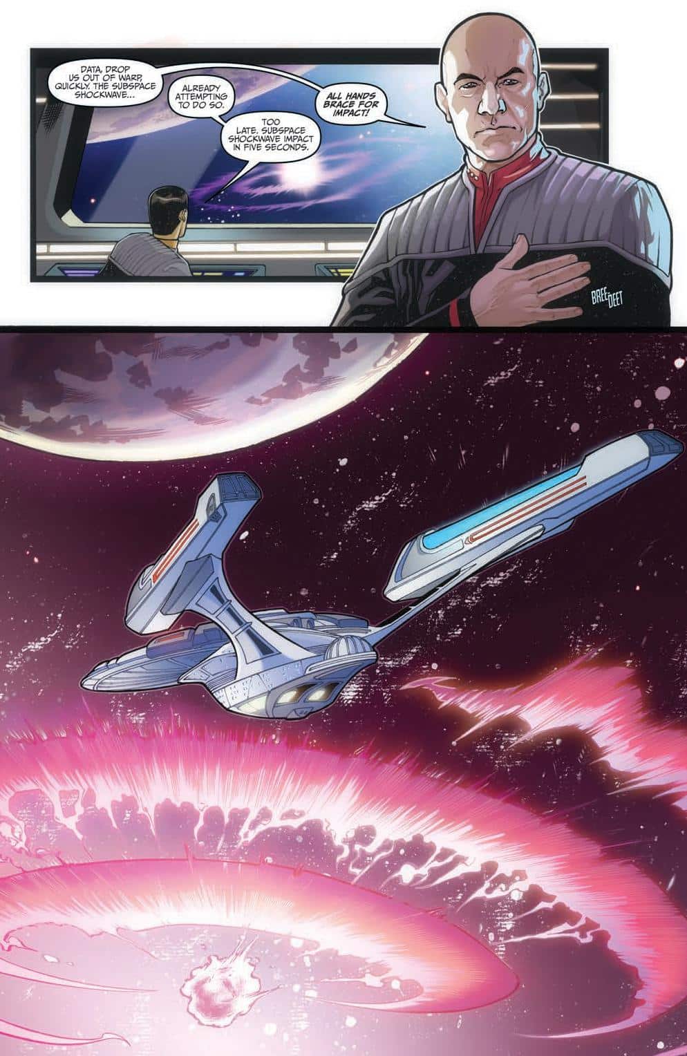 We find Riker as he approaches Picard, who is reminiscing of something that happened long ago, as the rest of the crew enjoys a command party. Picard is soon summoned to the bridge, where a disturbance that then Enterprise is approaching, which has a strange physiological effect on him, as we soon find out that Q is behind it all, appearing as a circus showman to the crew. As Q takes a particular fact about Jean-Luc and decides to take him on an excursion to the past, 2332 to be exact, back to his childhood home. As we find out in this time, his parents are still alive and he meets a younger version of himself and looks to playfully torture him along the way. Meanwhile, the crew tries to figure where the two have gone, where Data finds the first clue. As every choice Jean –Luc makes in the past, affects pivotal details in the present, affecting the crew and the federation, as he tries to save his brother. By the issue’s end, Jean-Luc eventually realizes that even if he can change the past, not everything is meant to be corrected.