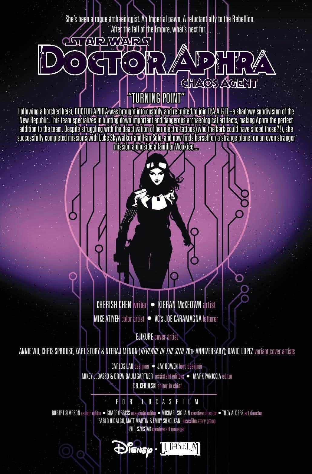 Doctor Aphra makes her way through the galaxy in the era of the New Republic! The rogue archaeologist must team up with Luke Skywalker to track down a rare artifact! And what will she do when her tattoos no longer function?!