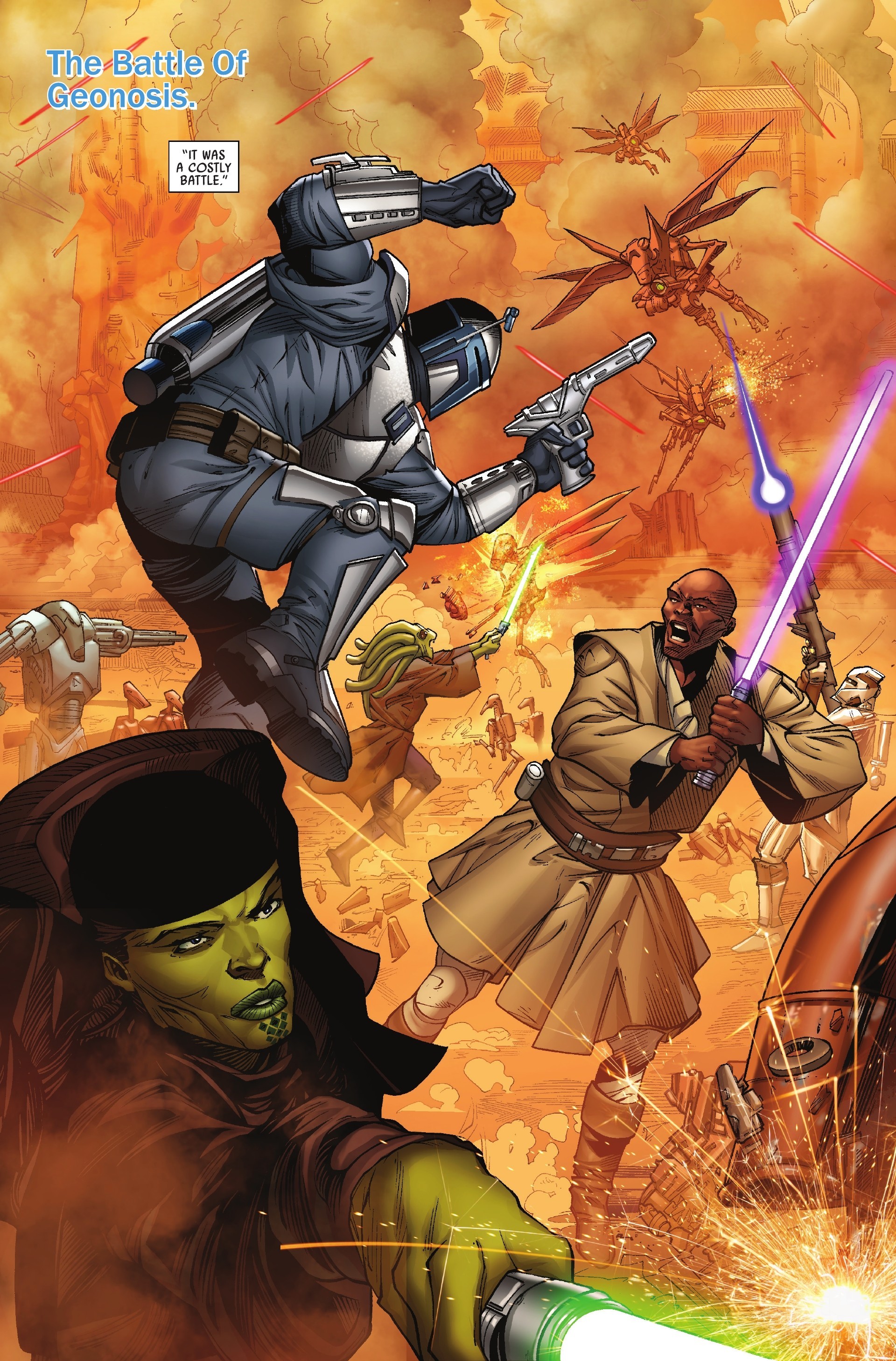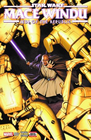 As a Star Wars fan who grew up in the Prequel Era, the purple lightsaber wielding Jedi as played by Samuel L. Jackson, Mace Windu, has always been one of my favorite characters. He gets his own solo miniseries in Star Wars: Jedi of the Republic – Mace Windu #1, and Matt Owens’ comic isn’t a breakaway hit with a generic mission to a Separatist planet called Hissrich with a small band of Jedi yadda yadda. The planet is supposed to have a hostile natural environment, but the only threats so far are a platoon of battle droids and sort of intriguing, sort of underwhelming Big Bad. His writing for the characters themselves isn’t bad with the usual confident Master Windu doubting himself after so many Jedi lost their lives at the Geonosis, and Ki-Adi-Mundi and Yoda providing supporting in the early council scenes. He’s not bad at banter either with the blind, mostly pacifist Prosset providing some dry one-liners as comic relief to go with his ass kicking.
