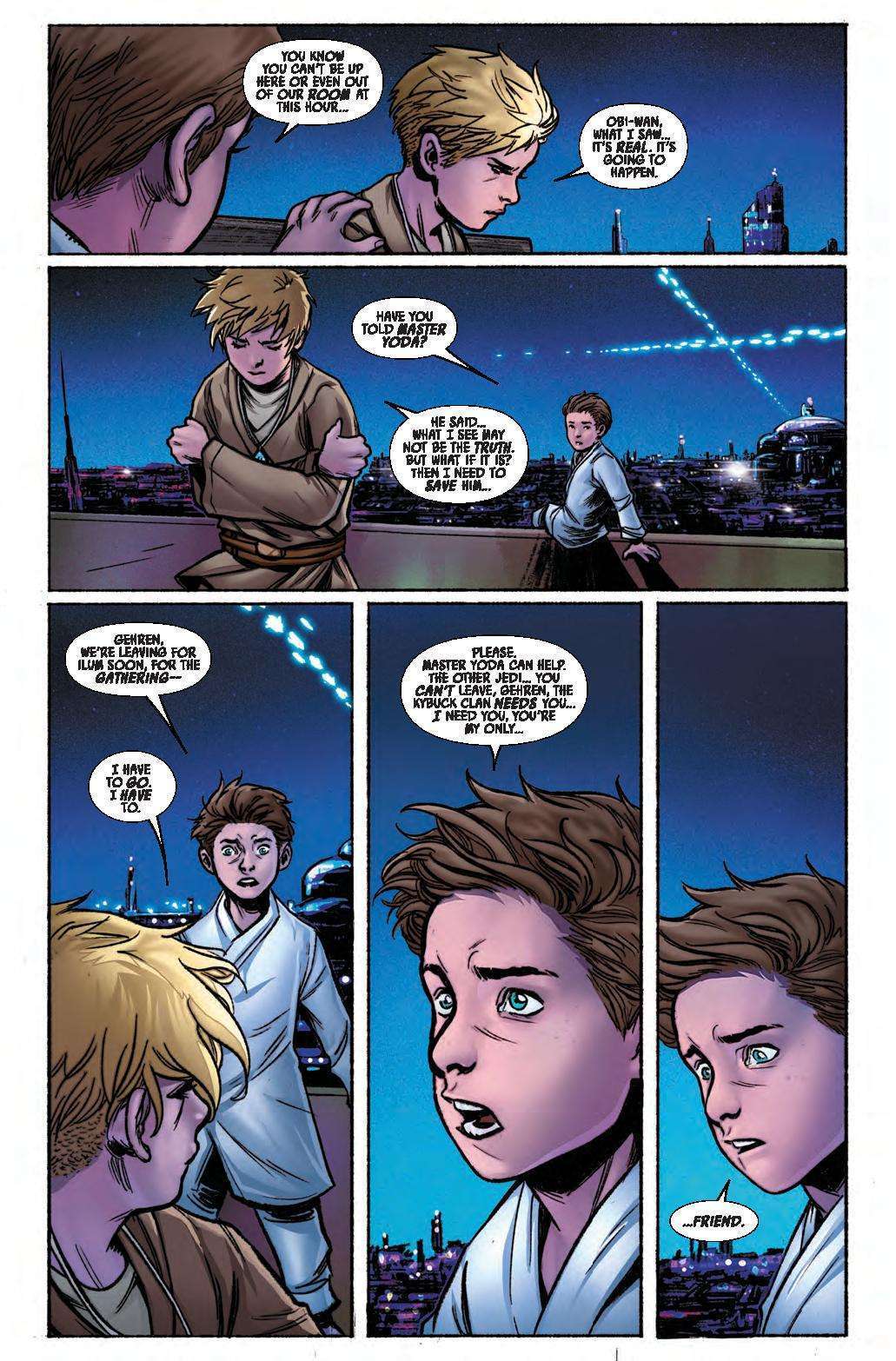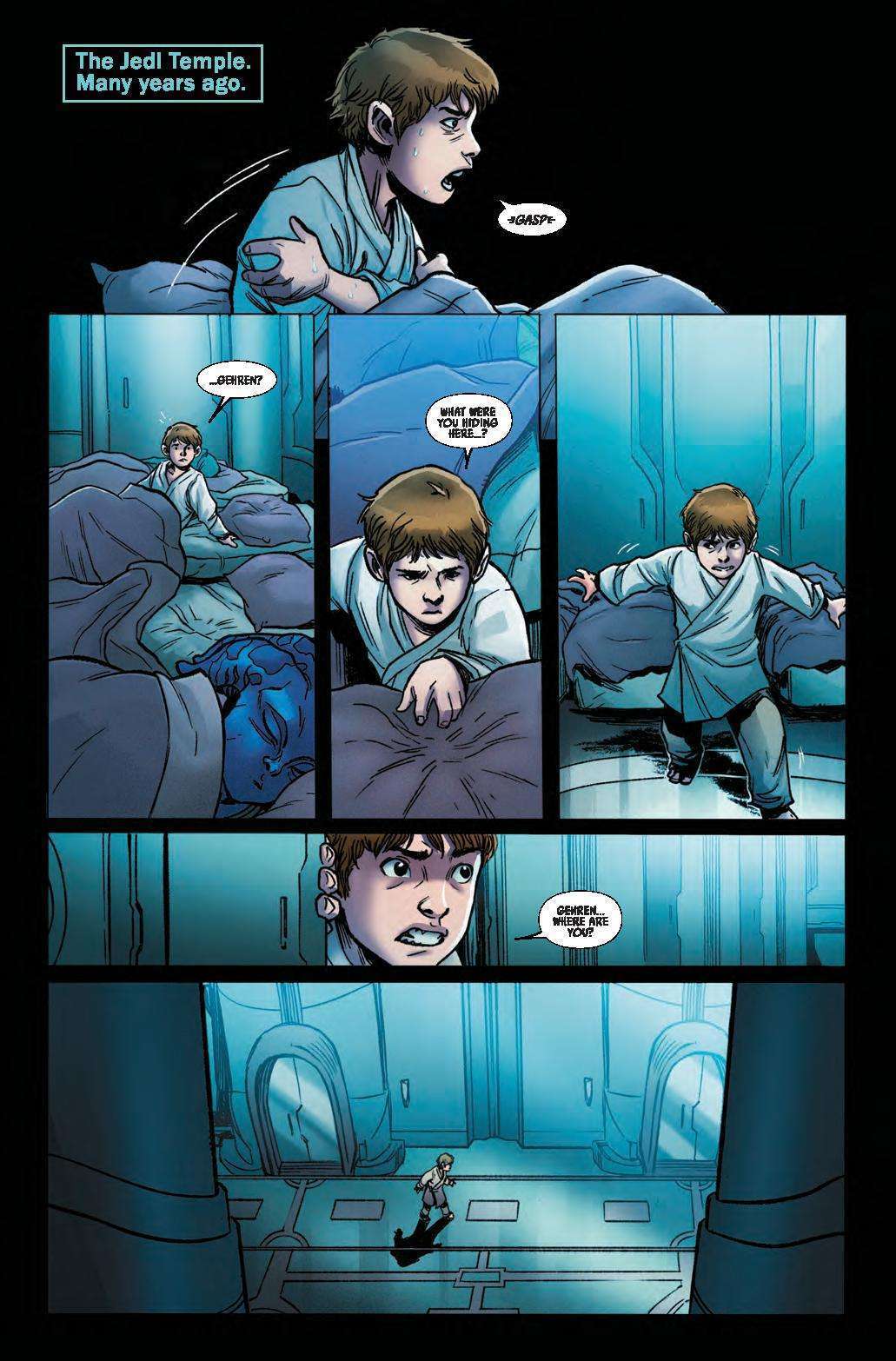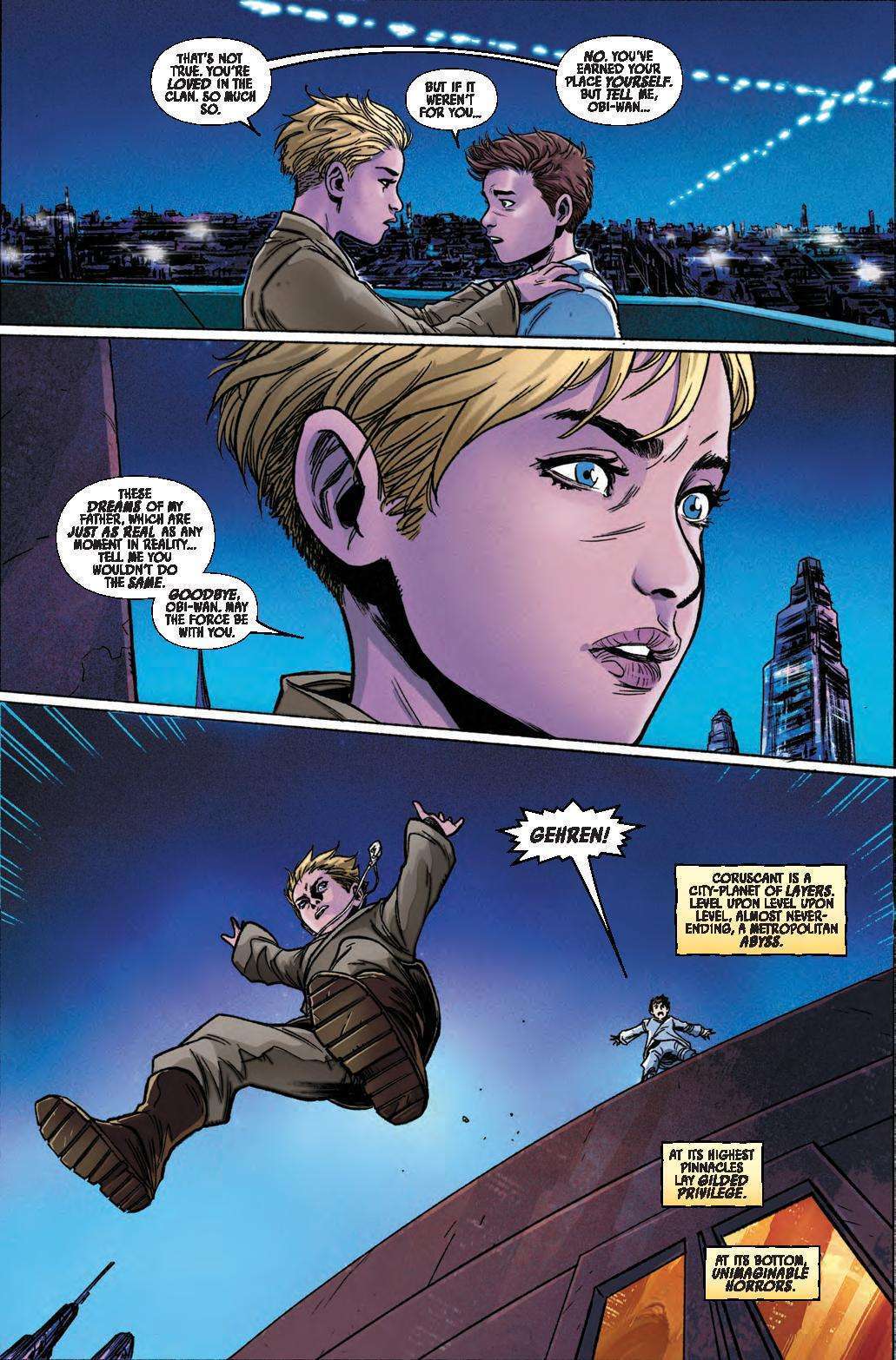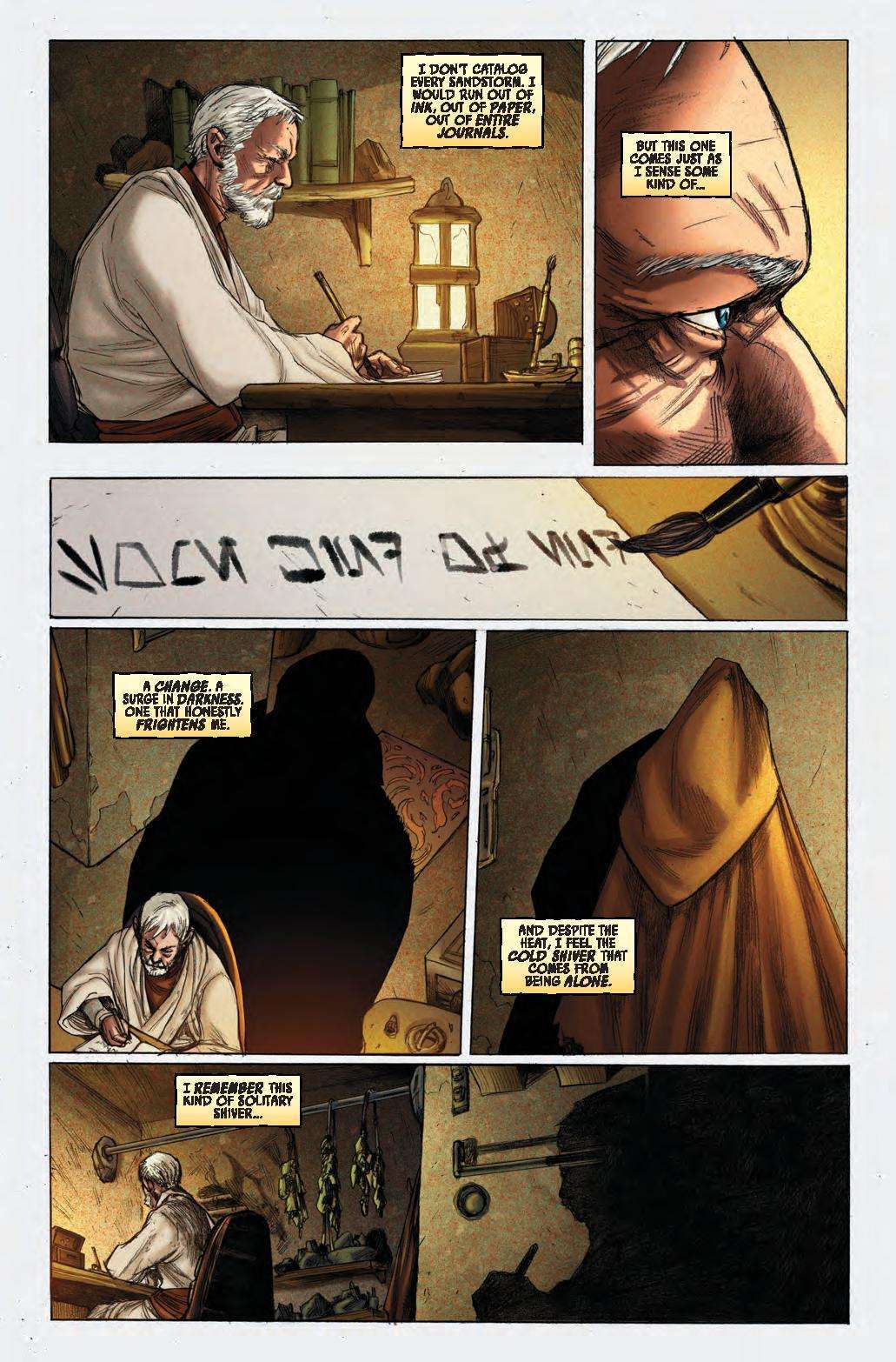 We’re taken to Tattoine, where we find Obi Wan, older and wiser, as he prepares his home for an oncoming sand storm. He takes this time to write in his journal, as the sand storm reminds of when he was a young Padawan, and one such night, he awakes to look for his friend and fellow Padawan, Gehrin, whose visions consume her. She decides to leave the Jedi Temple that night, a truth that Obi Wan finds hard to swallow. He chases after her, but runs into s some trouble with some local thugs, which is quickly broken by Nodrus Cay, a ranking lieutenant for the Black Sun, on hopes of helping her father, which Obi Wan insists on coming with. By the issue’s end, she is betrayed by Nodrus , but Obi Wan is able to save them both, but Gehren decides to leave the Jedi Order anyway to help her father and Obi Wan will never see his friend again.