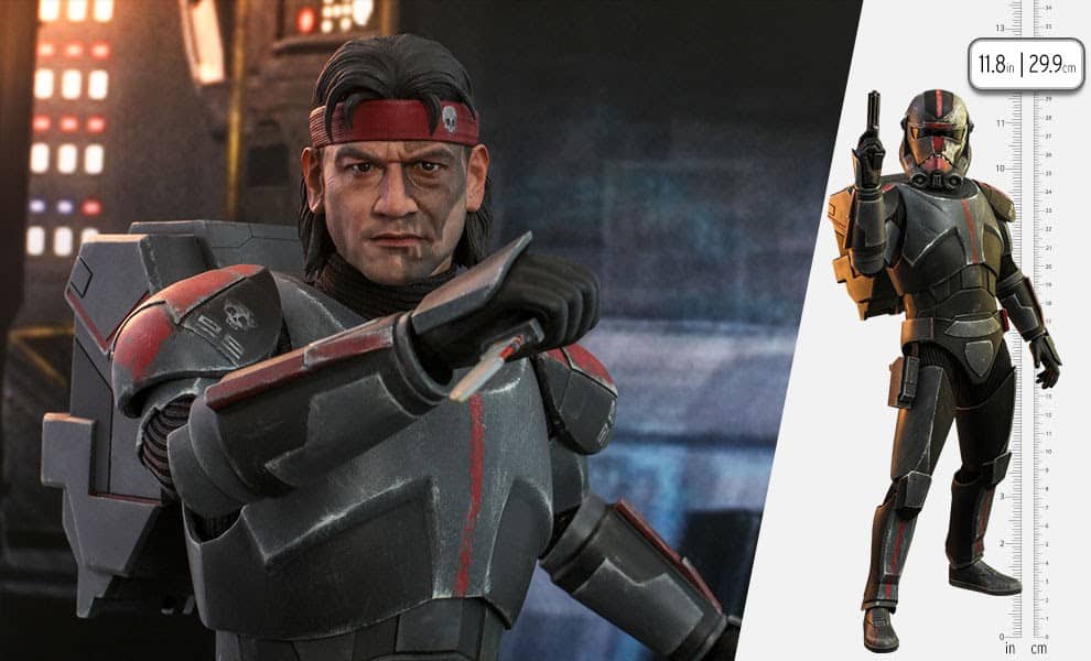 The highly detailed Wrecker 1/6 Scale Collectible Figure includes a new, hand-painted headsculpt with a screen-accurate scar and milky-white left eye. The figure also features a newly designed weathered helmet painted with Wrecker’s signature fanged skull design. Wrecker is dressed in expertly crafted, distressed dark gray battle armor with red markings, plus a special signet. Always ready for battle, he comes equipped with a blaster pistol, a blade, a magnetic backpack, and more. The figure has over 30 points of articulation and comes with a variety of interchangeable hands, allowing for a wide range of posing options.