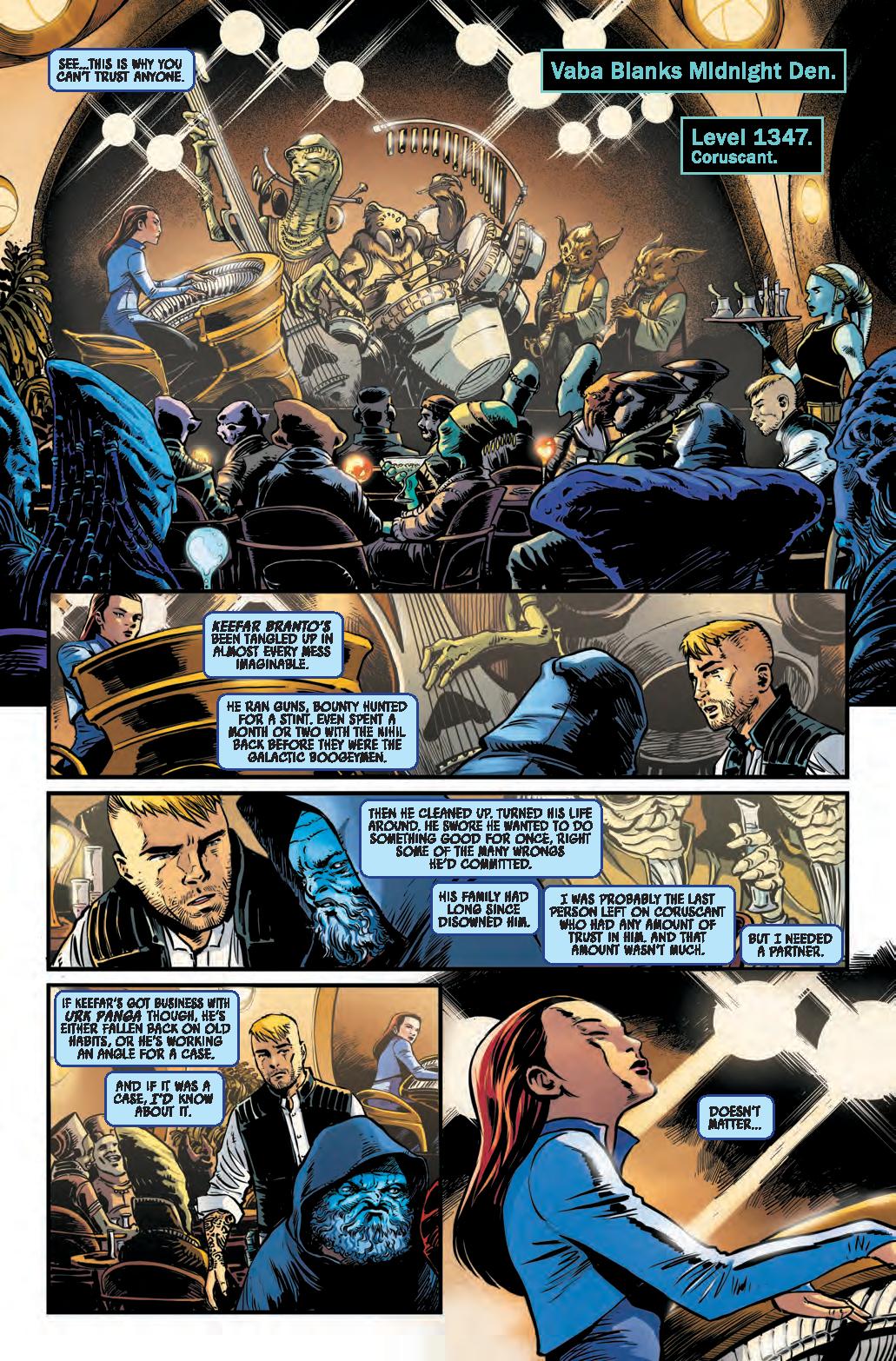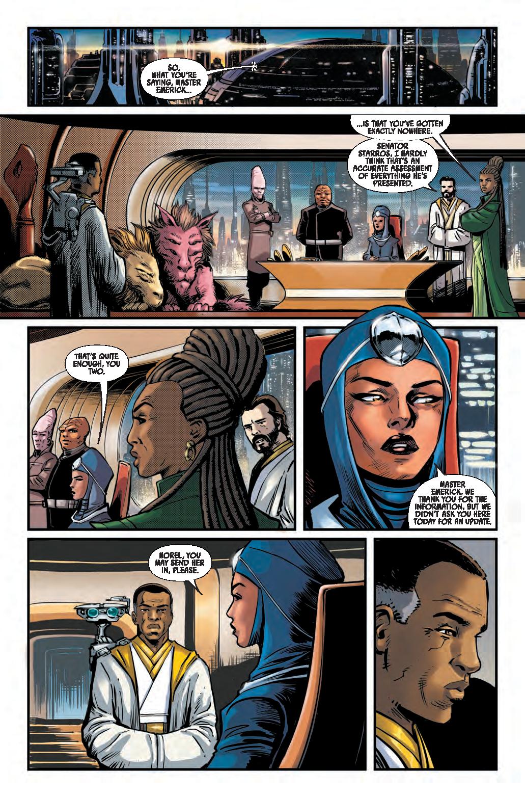 EMERICK AND SIAN FACE TOTAL AN-NIHIL-ATION! • As dead ends and loose threads mount in Jedi Master Emerick Caphtor’s investigation, he’s called to Coruscant, where Chancellor Soh introduces him to his new partner: private eye Sian Holt. • Together, they must go undercover to infiltrate one of the most crime-riddled and dangerous planets in the galaxy. • Will Emerick’s duty to the Republic get in the way of Sian’s personal vendetta? Time’s running out to close this case…and what do the Nihil have to do with any of this?!