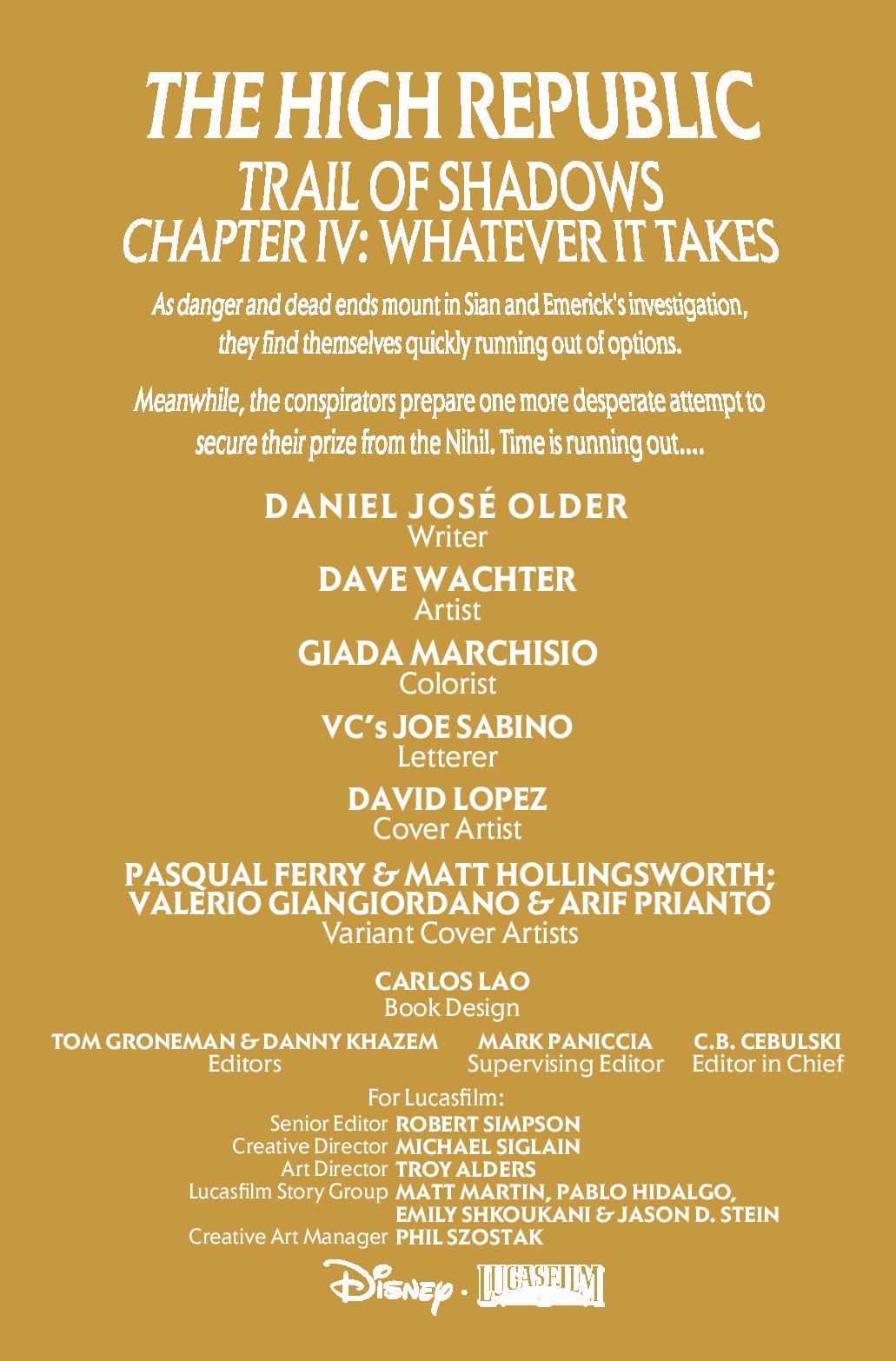 TIME IS RUNNING OUT TO SOLVE THE GREATEST MYSTERY OF THE GOLDEN AGE OF THE JEDI! As pressure mounts, EMERICK and SIAN follow a desperate lead to close in on their suspect! A sentimental mistake may tip the balance, but a creeping horror lurks in the shadows… Can the investigators uncover the NIHIL’S secret weapon before it’s used to bring down THE REPUBLIC?
