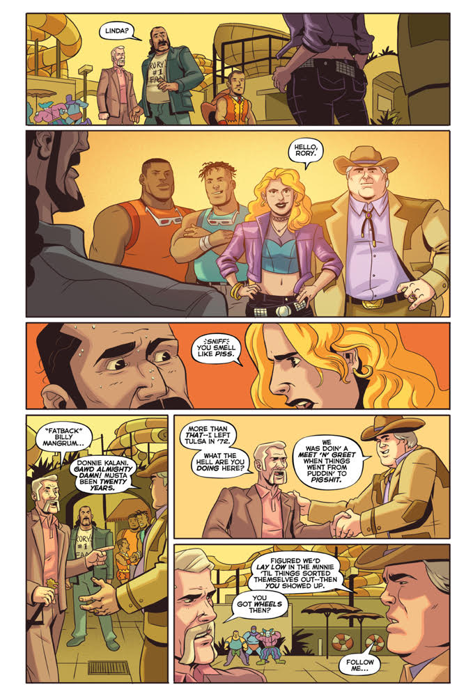 Creators Ed Kuehnel and Matt Entin bring their cult classic to SBI Press, where the story will be completed for the first time! “Boy Scout” Bob Schultz! Cousin Orville! Mini Macho! Kodiak Jack! Spanish Rose! Don Fong Wong! These are the megastars of 1984’s AWF. “Rock ’n’ Roll” Rory Landell isn’t getting the respect he thinks he deserves, so one crazy night he ups the game, declaring himself the Galactic Champion of the Universe. But it turns out AWF fans aren’t the only ones listening, and the denizens of planet Wrestletopia aren’t going to take a challenge like that sitting down! Soon the Earth is enclosed in a metal cage, and true Galactic Champion Manifest Destiny is on the hunt for Rory, who may or may not be passed out drunk somewhere.