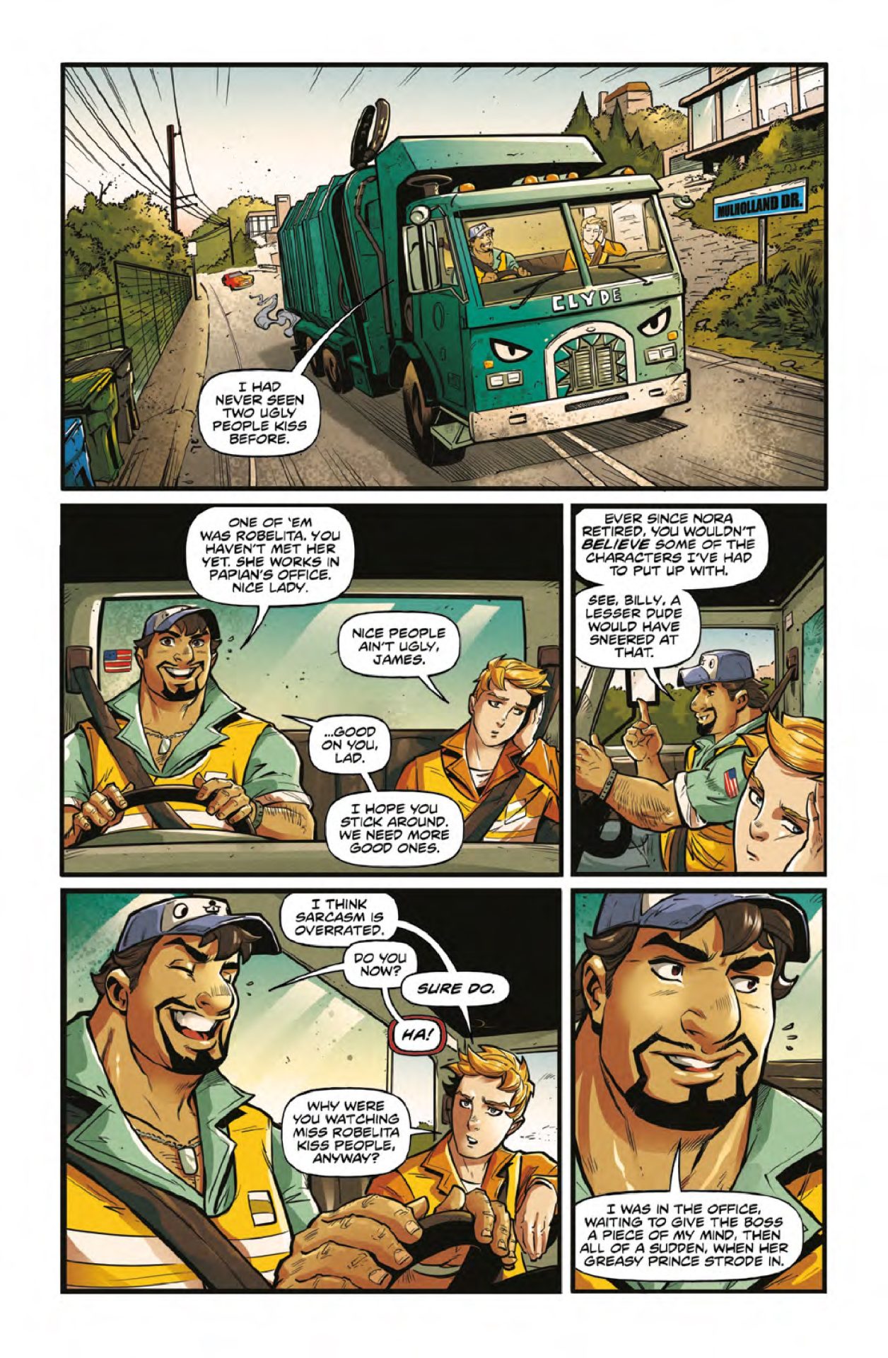 There’s a lot to like about Hollywood Trash #1. It’s a debut issue that’s full of potential and some entertaining moments. But, it also feels like a story I’ve come into about a quarter of the way. The series follows to garbage men who have picked up something that an evil cabal of Hollywood celebrities want and need. We don’t know what that is. We don’t know how they did it. We’re just thrown into the story with “go get them” and then the attempt to kill these two sanitation workers. It also leaves a lot to question like why someone doesn’t just tell them they grabbed something they shouldn’t have and ask for it back.