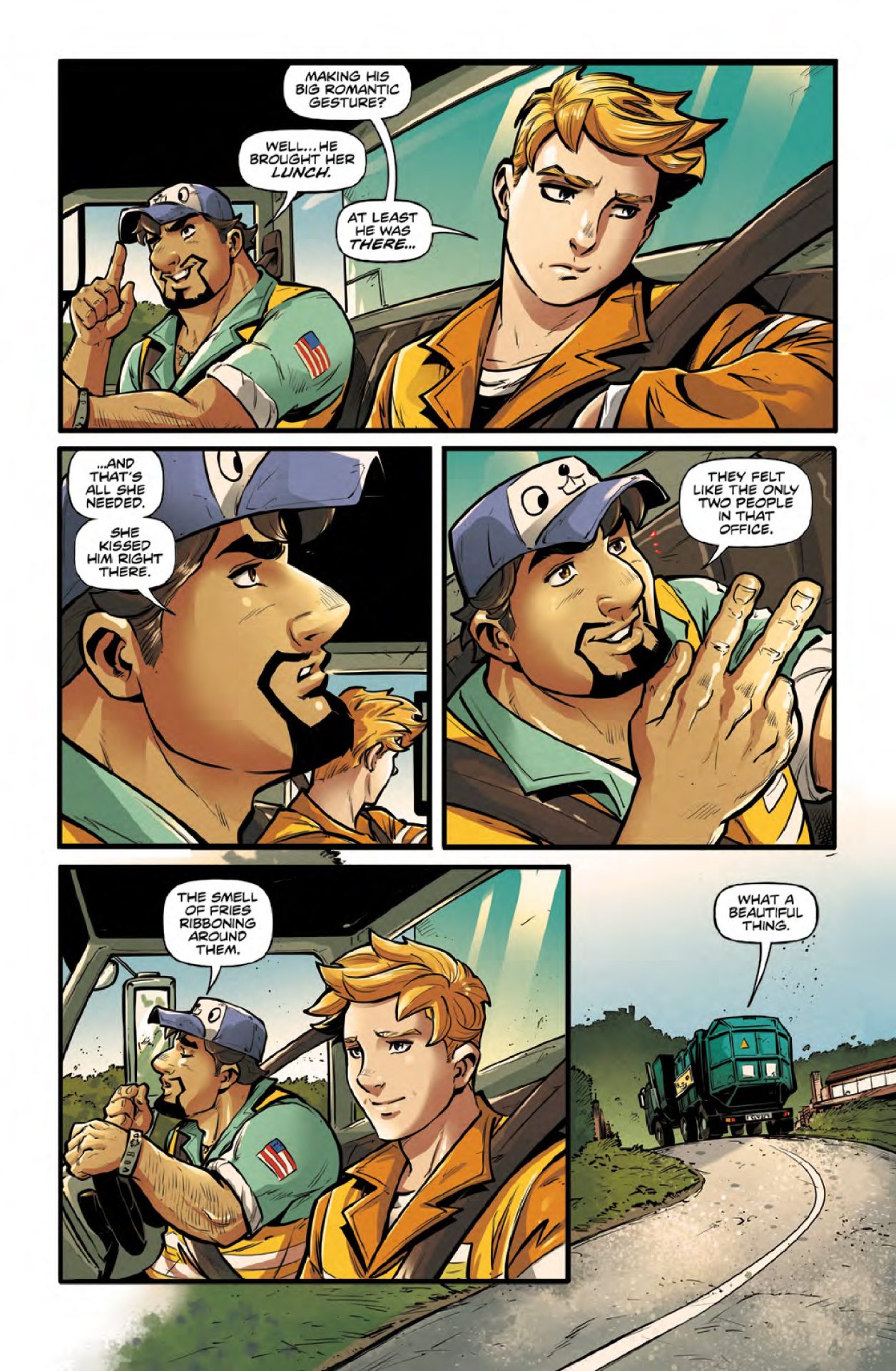Stephen Sonneveld delivers a story that could use a bit more setup to start but as the issue gets rolling it turns into a Looney Tunes fight. While the details are a bit scant, Sonneveld focuses on the attempt to retrieve the MacGuffin and kill these two workers. The how just gets crazier and crazier as the story rolls on. By the end, it feels like this is a spin on Wile E. Coyote attempting to capture or kill the Road Runner. The garbage men are blissfully unaware and their pursuer might as well have credit at acme.