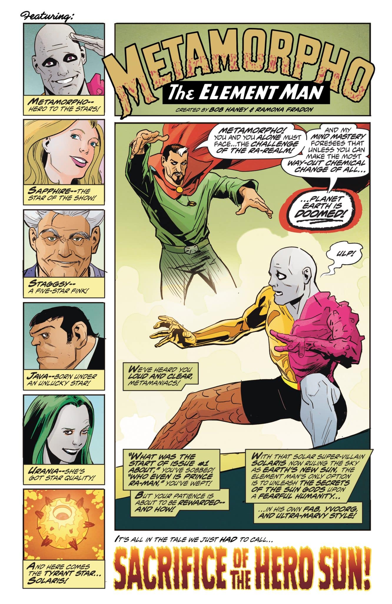 INTO THE RA-REALM! With the malevolent mastermind of Cy.C.L.O.P.S. now ruling the Earth and sky, Metamorpho has no choice but to enter the Ra-Realm, summon fire from the heavens themselves, and unleash the secrets of the gods upon a fearful humanity…in his own fab, yvoorg, and ultra-marvy style! Al Ewing and Steve Lieber swing for the solar fences as the New Age of Metamorpho goes cosmic!