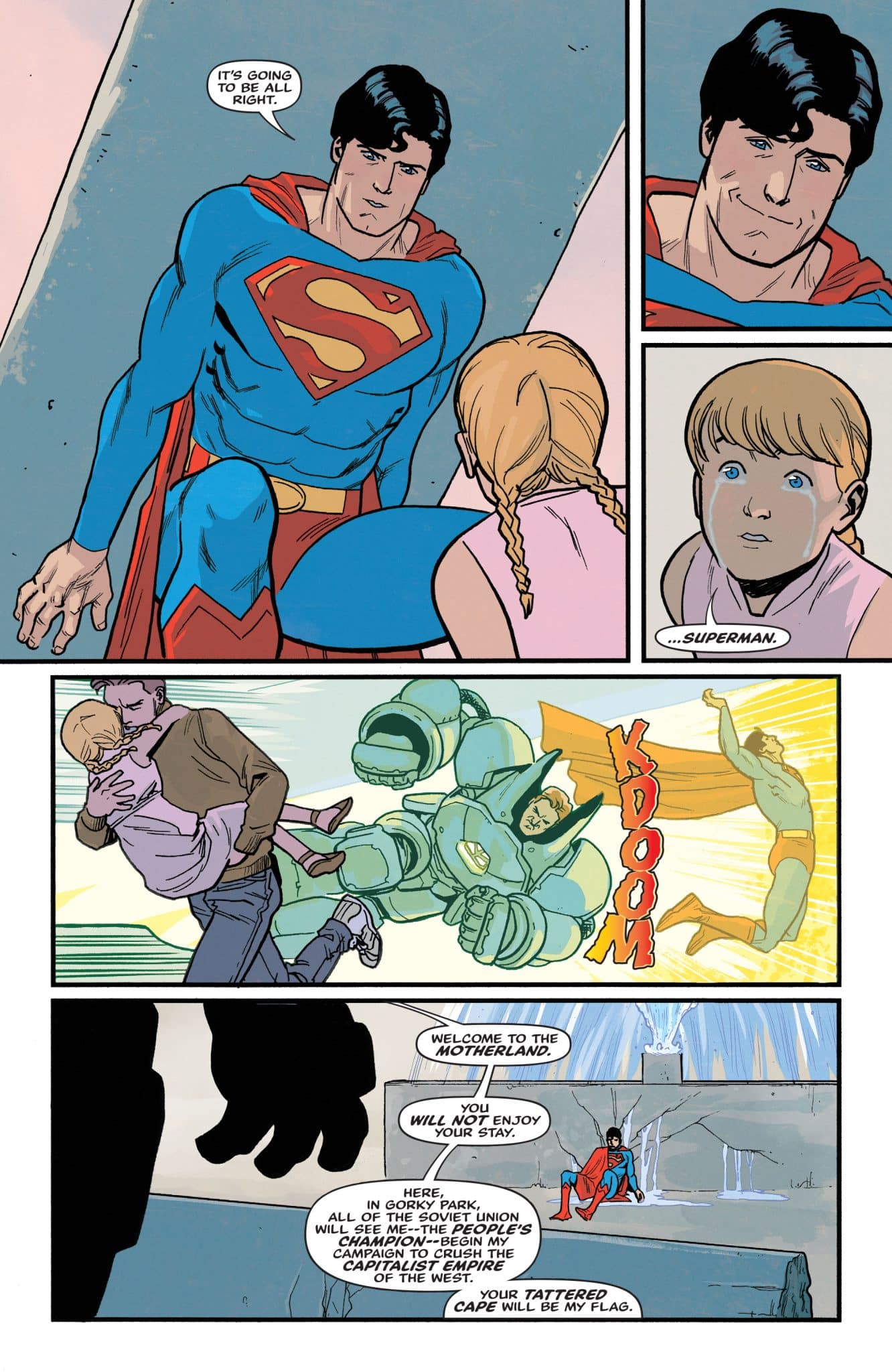 When the planet Krypton exploded, its last son was rocketed across the cosmos and came to settle in a small town in Kansas. But what else came with him, and what if a piece of his home landed somewhere we never knew about? As Superman has become a symbol of strength and pride for America, the Soviet Union looks to crush that image with a creation of their own, built by their own might and forged by their own power! Superman ’78: The Metal Curtain #1 continues the classic Superman and remixes some familiar elements.