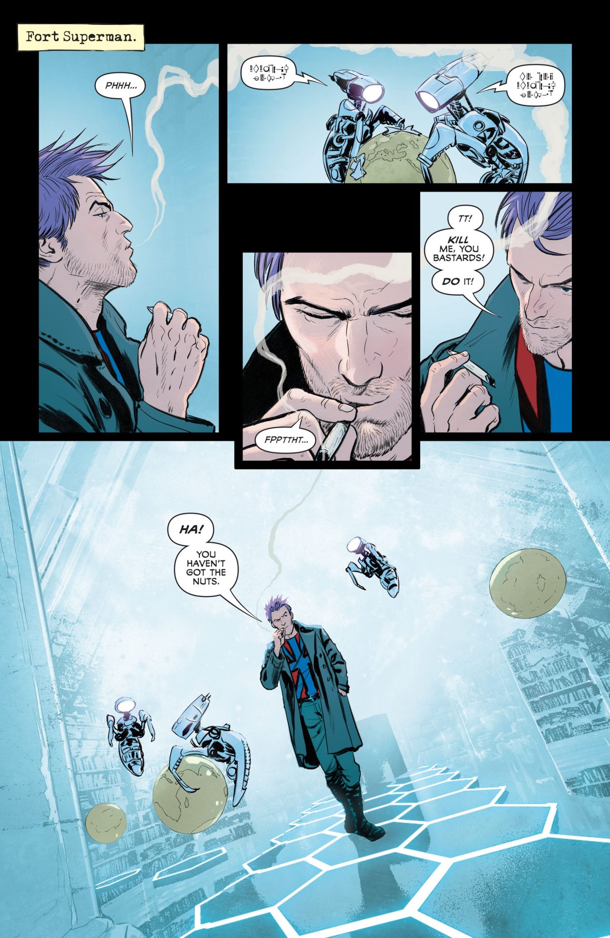It’s a far cry from a smiling figure flying into the sun, and it’s why Superman has recruited anti-heroes like Manchester to replace his lost powers and strike from the shadows and the margins because trying to change the world from out in the open leads to the assassination of JFK or MLK or RFK, who are all alluded to in Superman and the Authority #1 along with traditional Superman comic book opponents Intergang, Darkseid, and Doomsday. These baddies’ names evoke corruption, pure evil, and the ultimate defeat as Doomsday was solely created to kill Superman. (And boost sales!) They could definitely kick the current Superman’s ass as evidenced by his struggles with some drones from the Phantom Zone, which is where the new incarnation of the Authority comes in. Superman shows Black a literal Round Table when making his sales pitch, but Manchester Black’s vomiting and the overt mention of anti-heroes in Grant Morrison’s dialogue show that this team is going to be the polar opposite of their JLA.