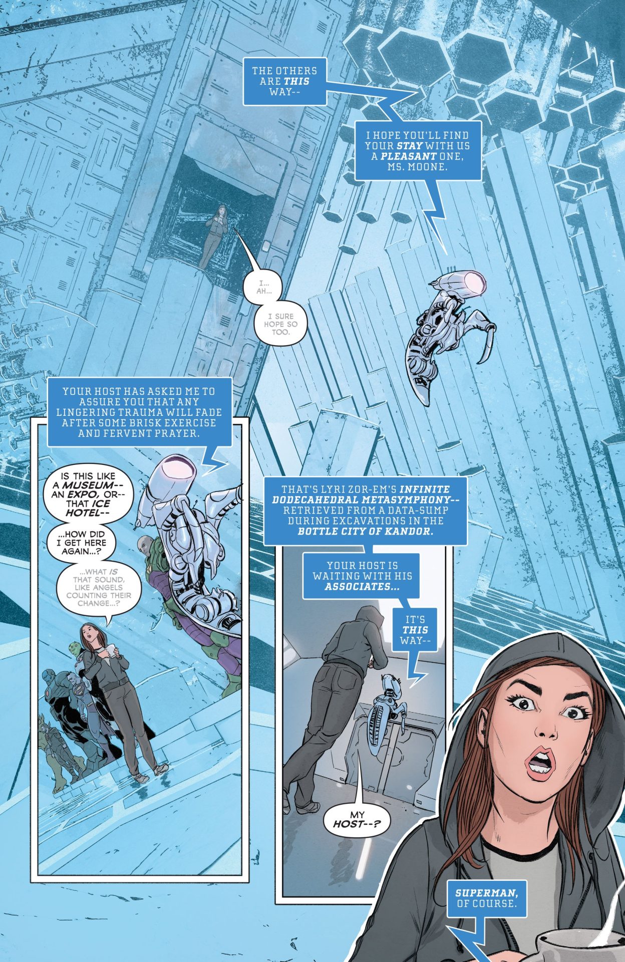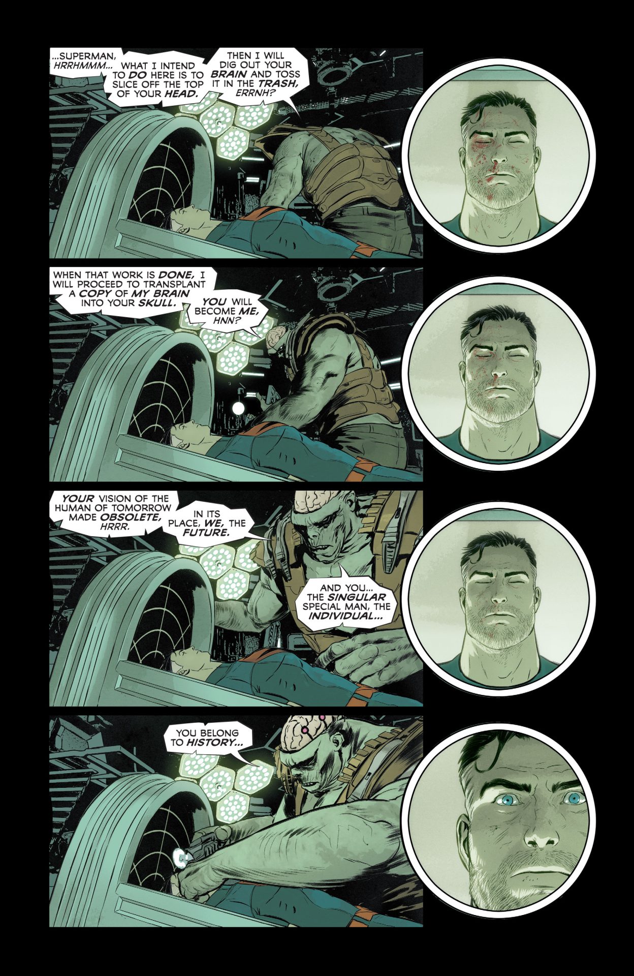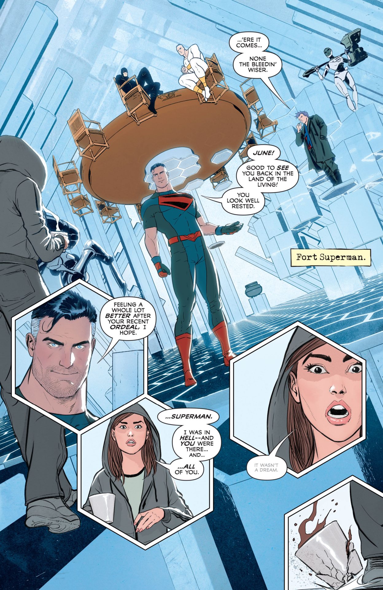 But this all broken up by distorted line-work from Janin and reds and blacks from Bellaire than come in any time characters are stressed and in trouble throughout Superman and the Authority from Manchester Black taking gunfire in a flurry of grid panels to Superman basically taking a life and death gambit with Phantom Zone prisoners to persuade Black to join his team. For this extended sequence, Janin works from odd angles and emphasizes the agony of a slowly depowering Superman, who can’t fly any more aka the opposite of the smiling Silver Age hero, who could breathe in space and turn a lump of coal into diamond with his bare hands. Again, there are lots of reds and repetition of the word “Die” like it’s a Misfits song or something until Manchester Black reluctantly decides to be a hero, and Jordie Bellaire pours on a bit of telekinetic blue because telepathy doesn’t work on drones. In the spirit of Hitman #34, Superman’s true power isn’t heat vision, X-Ray vision, or flight, but the ability to provide hope and inspire even the most gin-sodden anti-hero.
