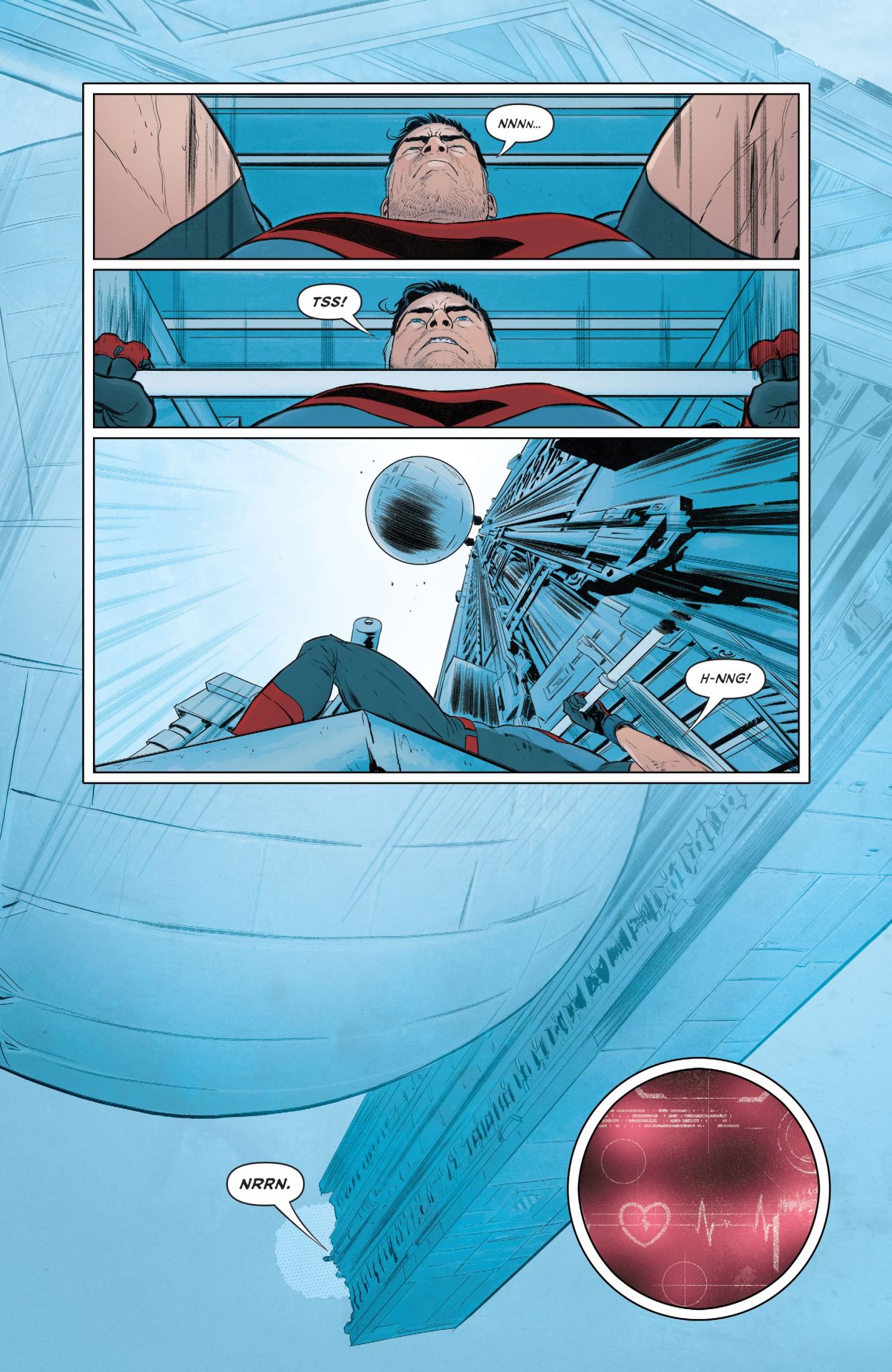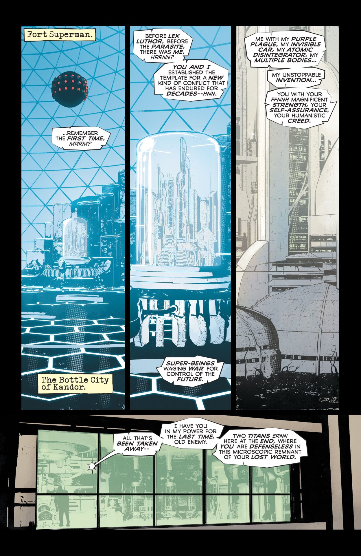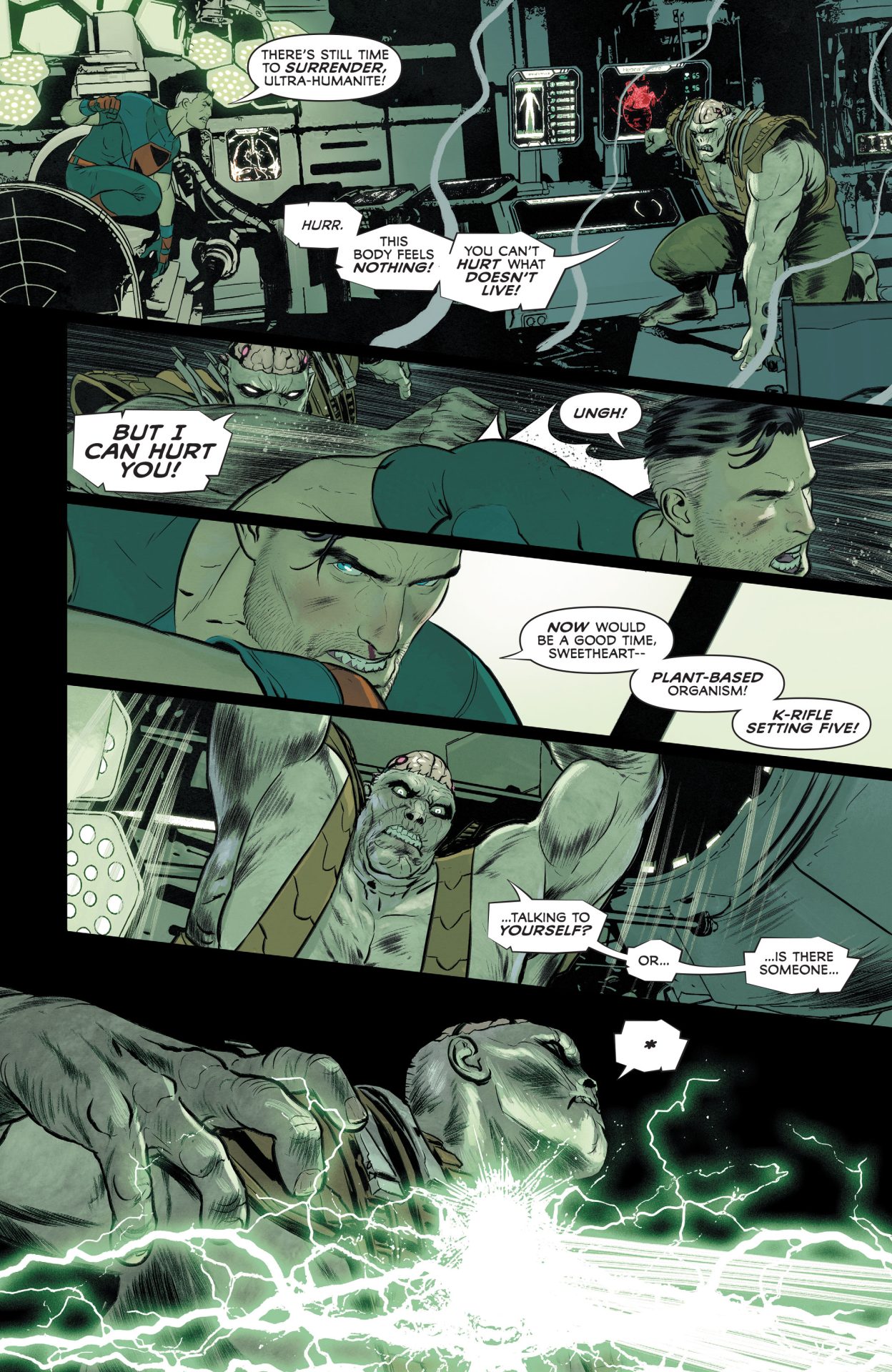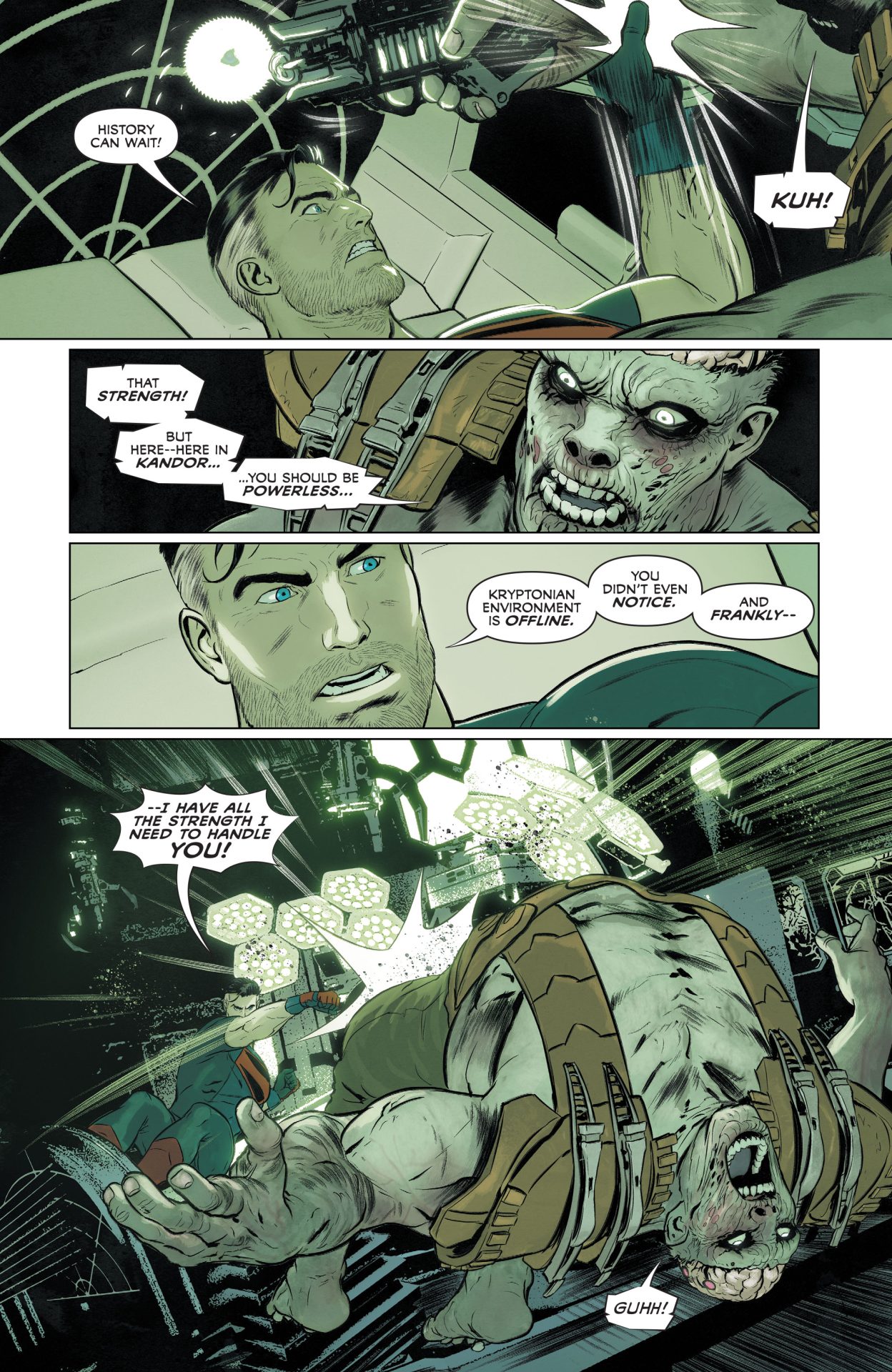 But this all broken up by distorted line-work from Janin and reds and blacks from Bellaire than come in any time characters are stressed and in trouble throughout Superman and the Authority from Manchester Black taking gunfire in a flurry of grid panels to Superman basically taking a life and death gambit with Phantom Zone prisoners to persuade Black to join his team. For this extended sequence, Janin works from odd angles and emphasizes the agony of a slowly depowering Superman, who can’t fly any more aka the opposite of the smiling Silver Age hero, who could breathe in space and turn a lump of coal into diamond with his bare hands. Again, there are lots of reds and repetition of the word “Die” like it’s a Misfits song or something until Manchester Black reluctantly decides to be a hero, and Jordie Bellaire pours on a bit of telekinetic blue because telepathy doesn’t work on drones. In the spirit of Hitman #34, Superman’s true power isn’t heat vision, X-Ray vision, or flight, but the ability to provide hope and inspire even the most gin-sodden anti-hero.