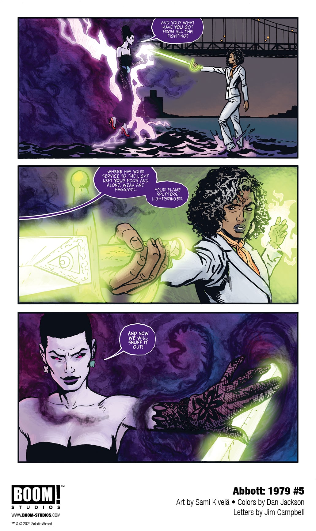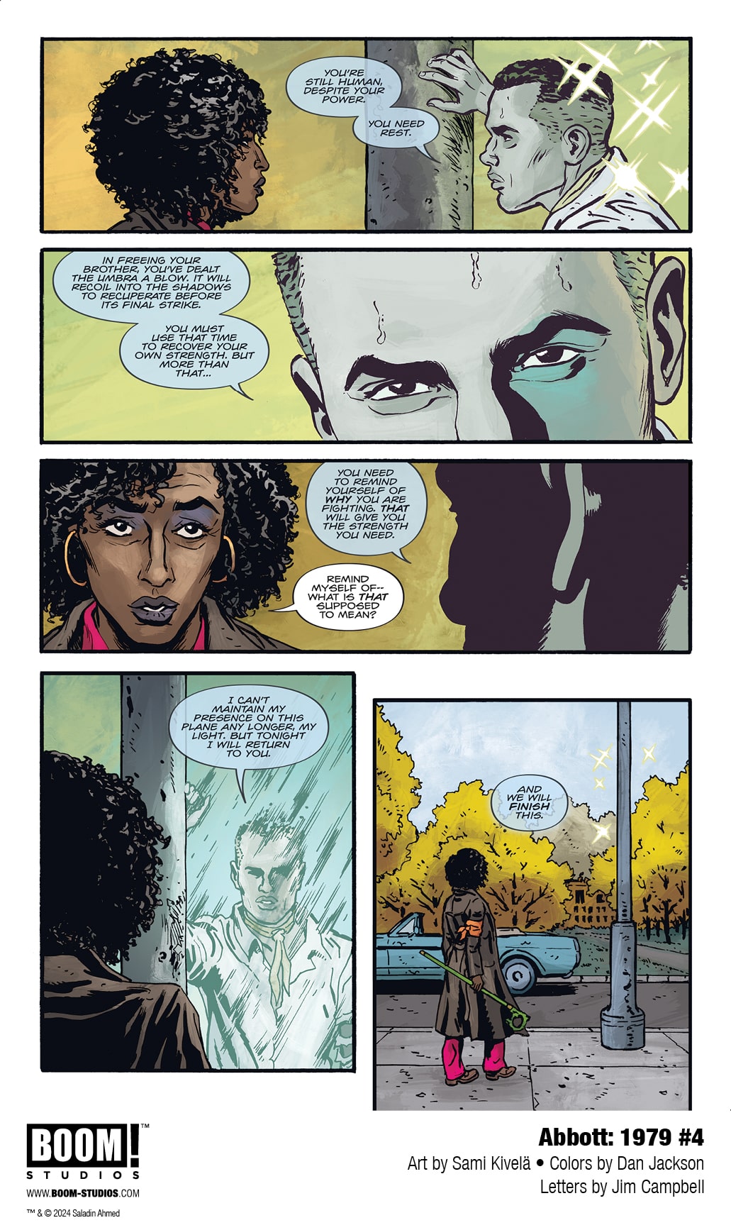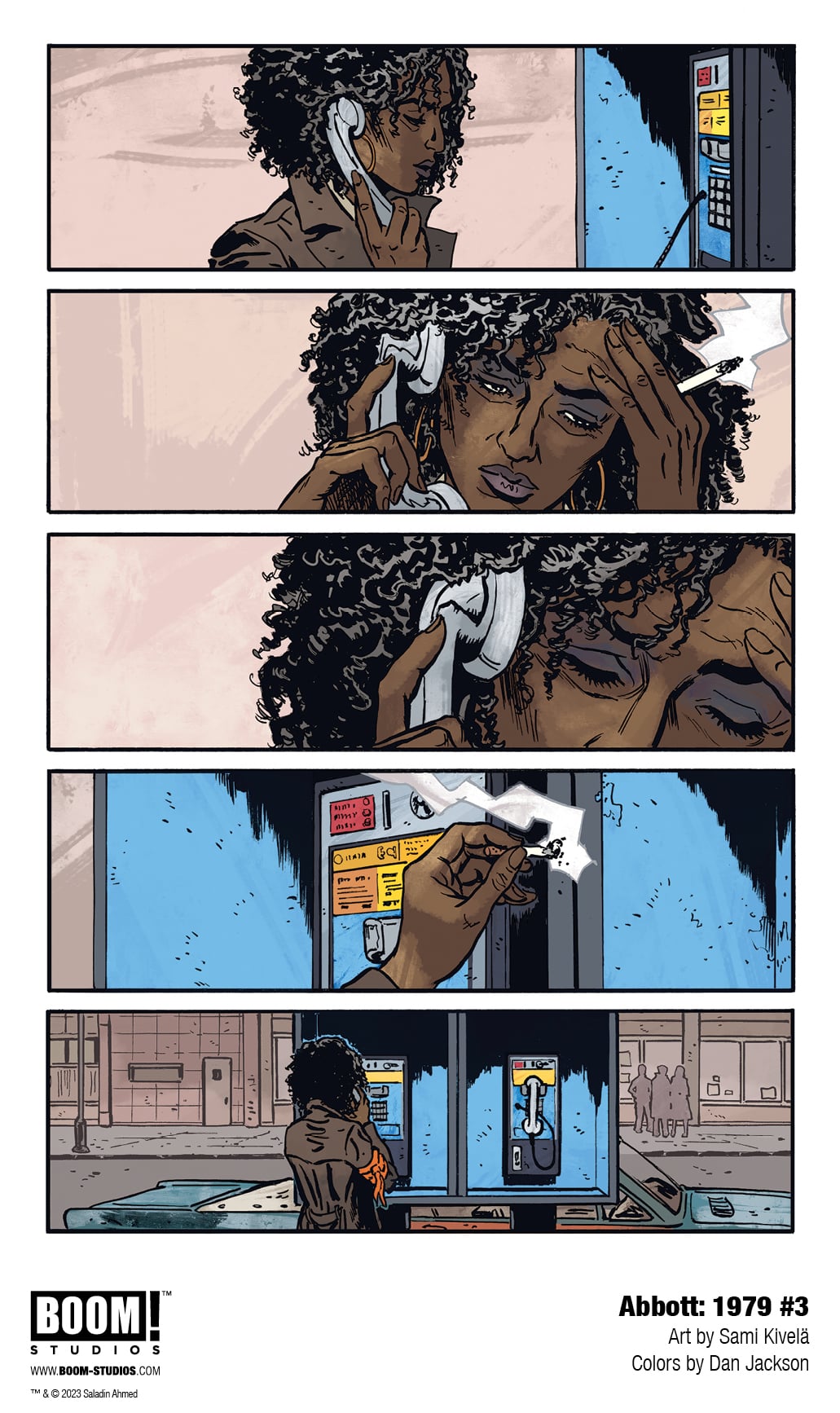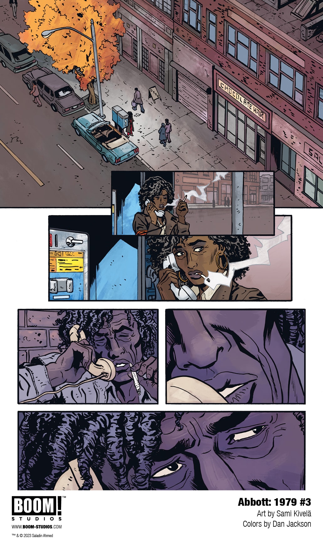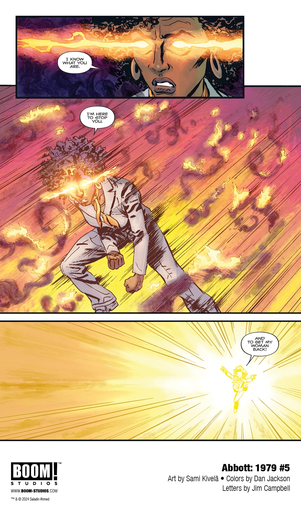 BOOM! Studios has revealed a first look at Abbott: 1979 #5, the FINAL ISSUE of the new series from writer Saladin Ahmed, artist Sami Kivelä, colorist Dan Jackson, and letterer Jim Campbell. Jump back into the action of the hard-boiled trilogy’s final chapter, continuing March 13, 2024.