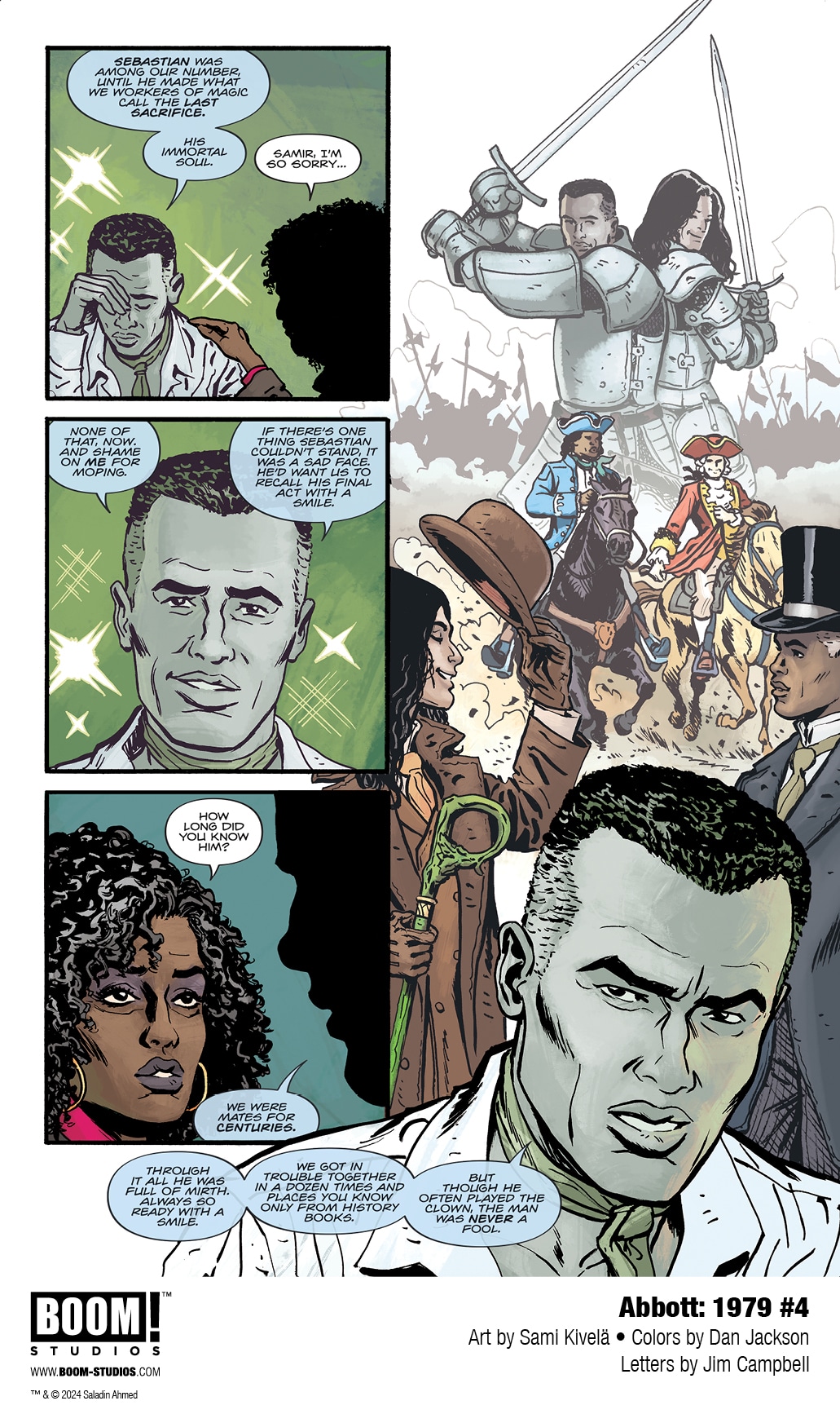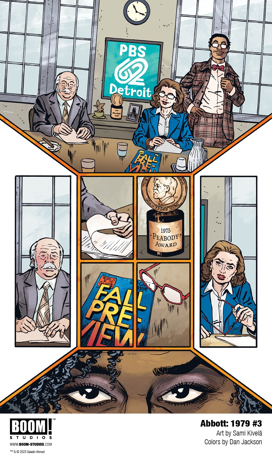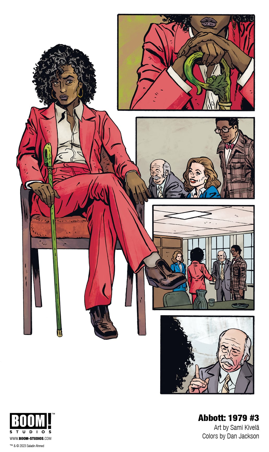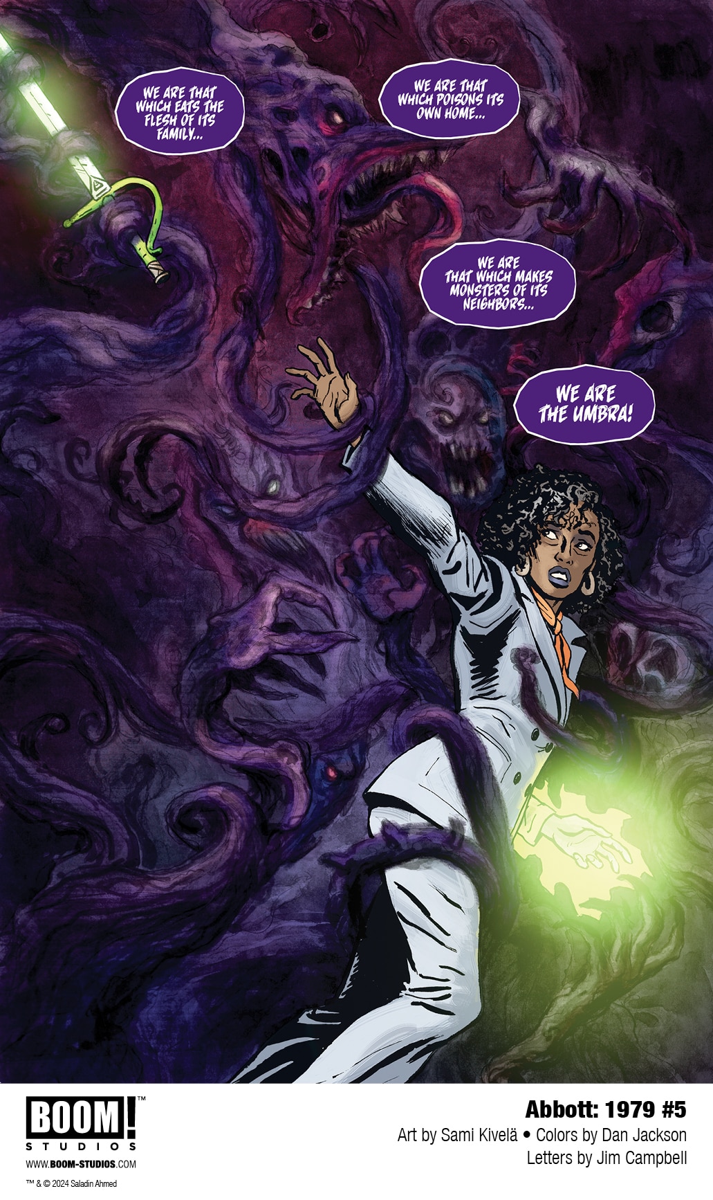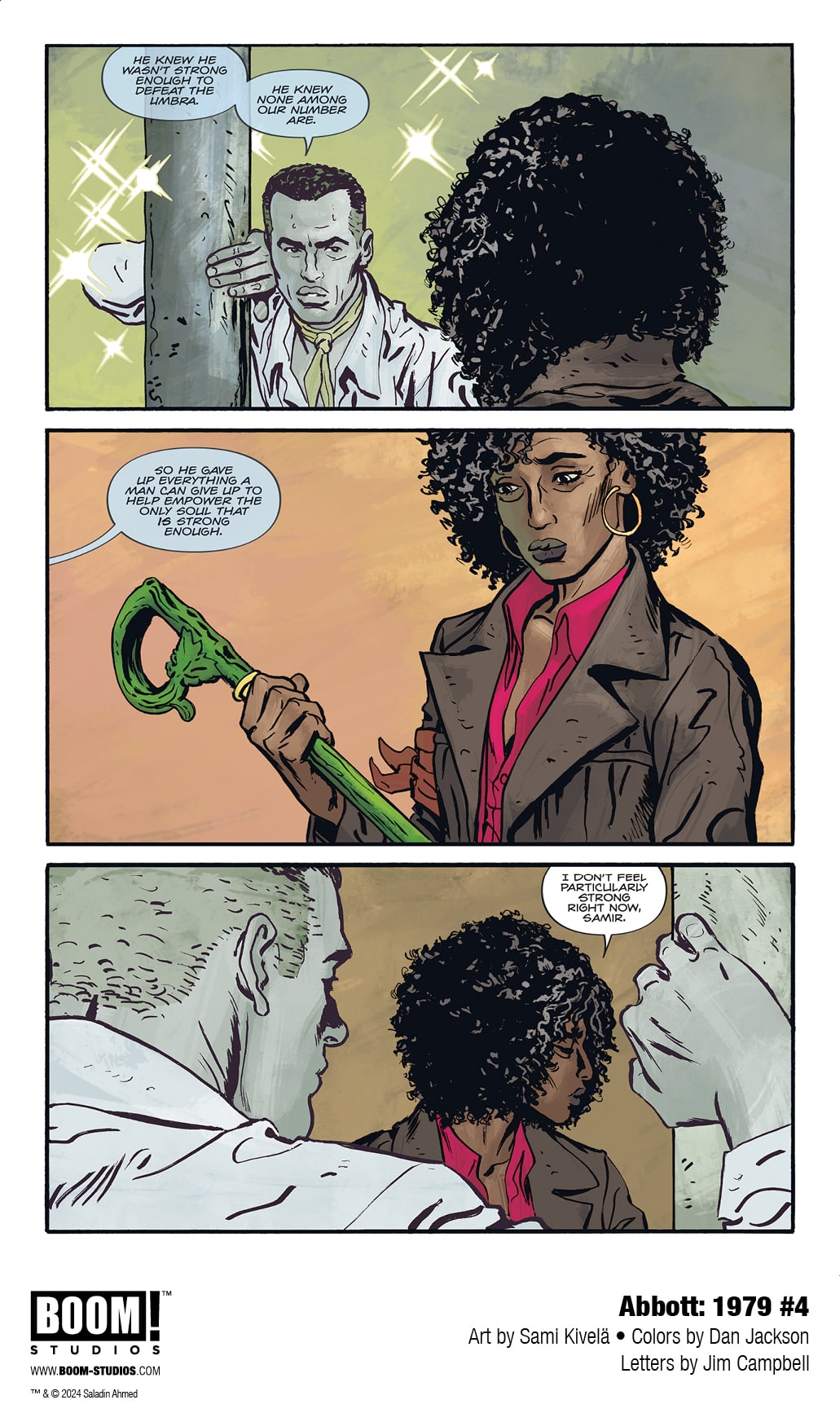 BOOM! Studios has revealed a first look at Abbott: 1979 #5, the FINAL ISSUE of the new series from writer Saladin Ahmed, artist Sami Kivelä, colorist Dan Jackson, and letterer Jim Campbell. Jump back into the action of the hard-boiled trilogy’s final chapter, continuing March 13, 2024.