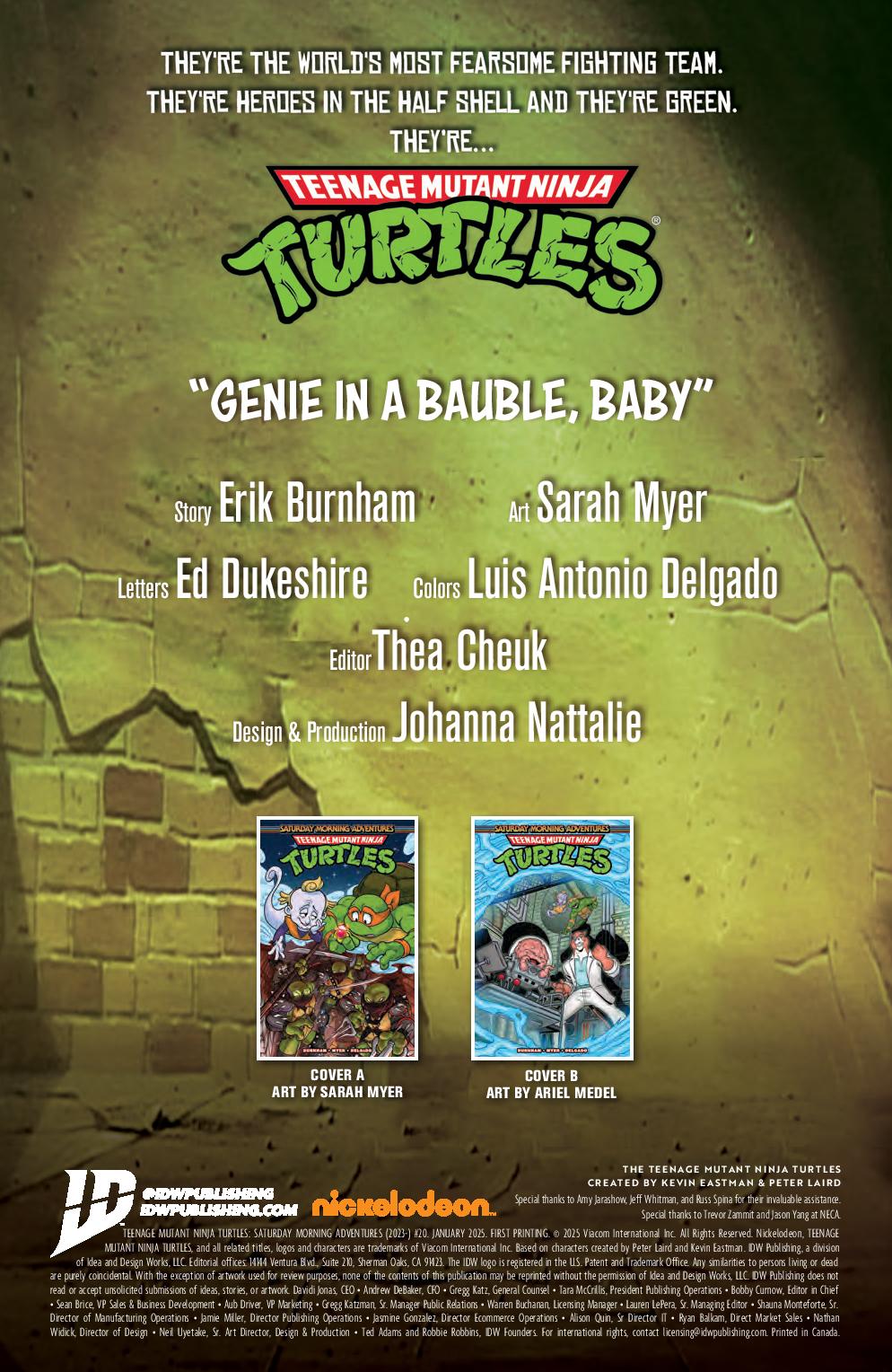 After a mild mishap with one of Donatello’s inventions, Michelangelo starts to wonder if his laid-back attitude isn’t holding his brothers back. While skateboarding in the sewers to clear his head, Mikey meets a genie who can show him exactly what the world would be like without him…and decides to do so. If dark Turtles, an angry Hamato Yoshi, and a forbidden pizza weren’t enough, Krang and Old Hob form an alliance to repair the interdimensional portal! All that, plus Michelangelo sees his true worth in an all-new Saturday Morning Adventure that could only be called “Genie in a Bauble, Baby”!