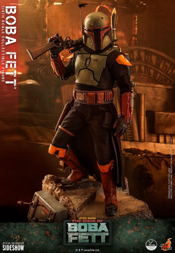 Inspired by The Book of Boba Fett, the Boba Fett 1/4 Scale Collectible Figure stands at an impressive 17.71″ tall, and features a hand-painted headsculpt with an authentic likeness of Temuera Morrison in the titular role. The figure also comes with a new Boba Fett Mandalorian™ helmet featuring an articulated rangefinder. Boba is dressed in detailed armor which includes gauntlets, knee guards, a belt with ammo clips, and a pistol holster. He comes equipped with a blaster rifle, a pistol, a flamethrower effect, and a jetpack with detachable rocket, plus holograms of his palace and starship. His armor, weapons, and accessories are expertly aged with weathered details. This highly poseable figure has over 30 points of articulation and comes with a specially designed figure stand.