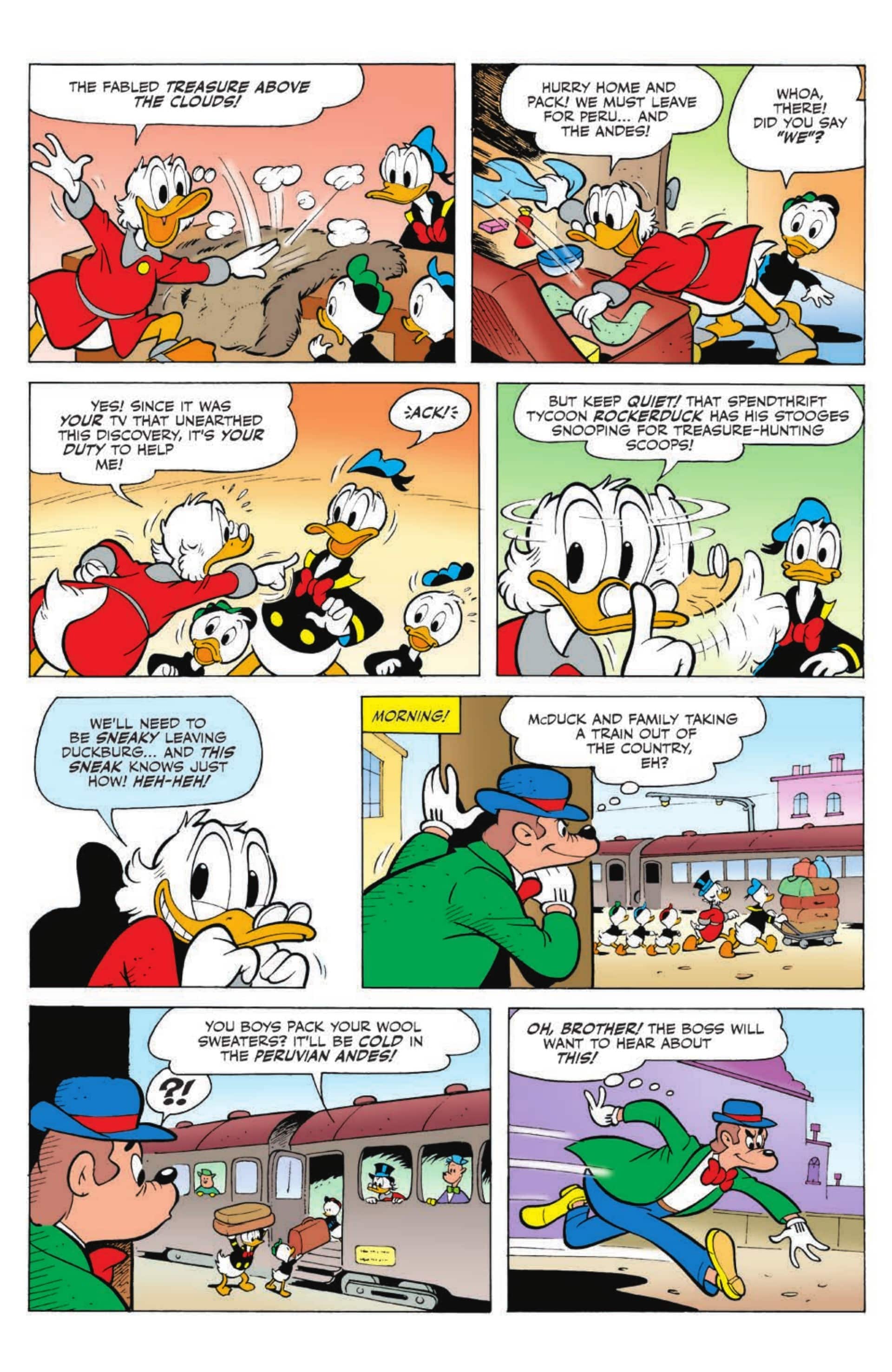 Is Scrooge McDuck always sharper than the sharpies? In “Treasure Above the Clouds,” he’s battling with playboy plutocrat John D. Rockerduck for ownership of an awesome Incan treasure—but in “Peril of the Black Forest,” Scrooge fights his own nephews for possession of Duckburg’s woodlands!
