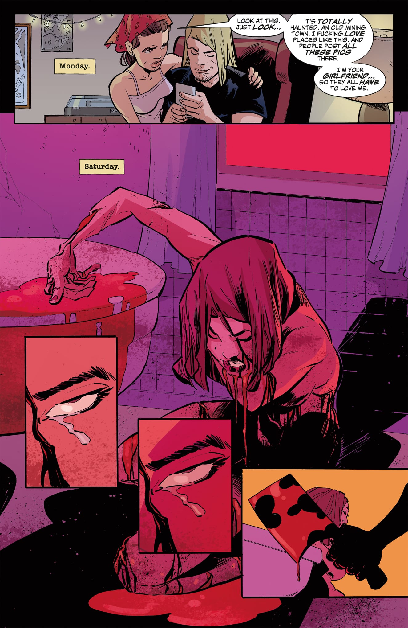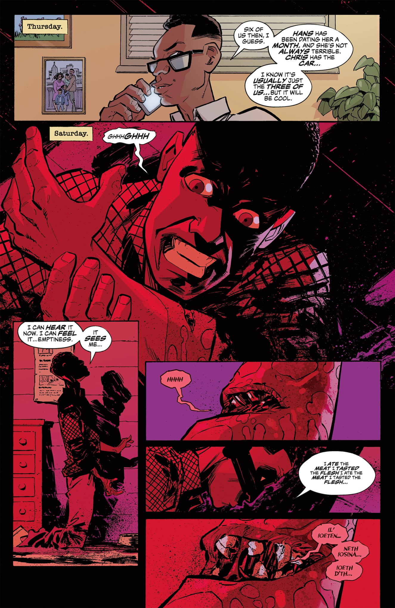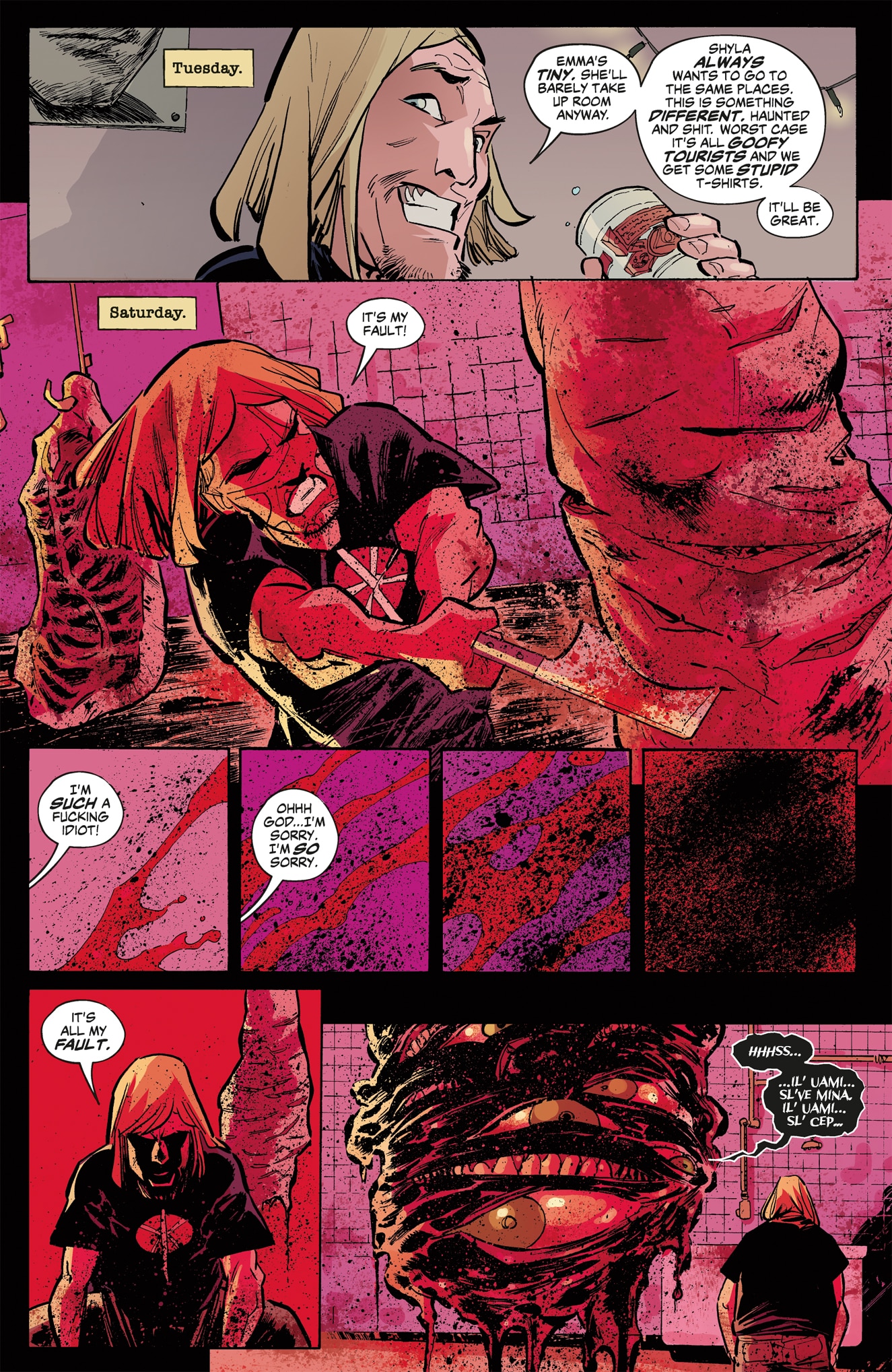 Shyla and her friends lock themselves away in their motel rooms, each of them grappling with the feverish visions induced by the tainted meat they consumed. Are the voices whispering to them real? Has the Butcher of La Perdita come to claim their flesh? Or is the sickness that each of them carries within simply bubbling its way to the surface? Take a bite and find out, as the temperature of this macabre horror story is rising quickly.