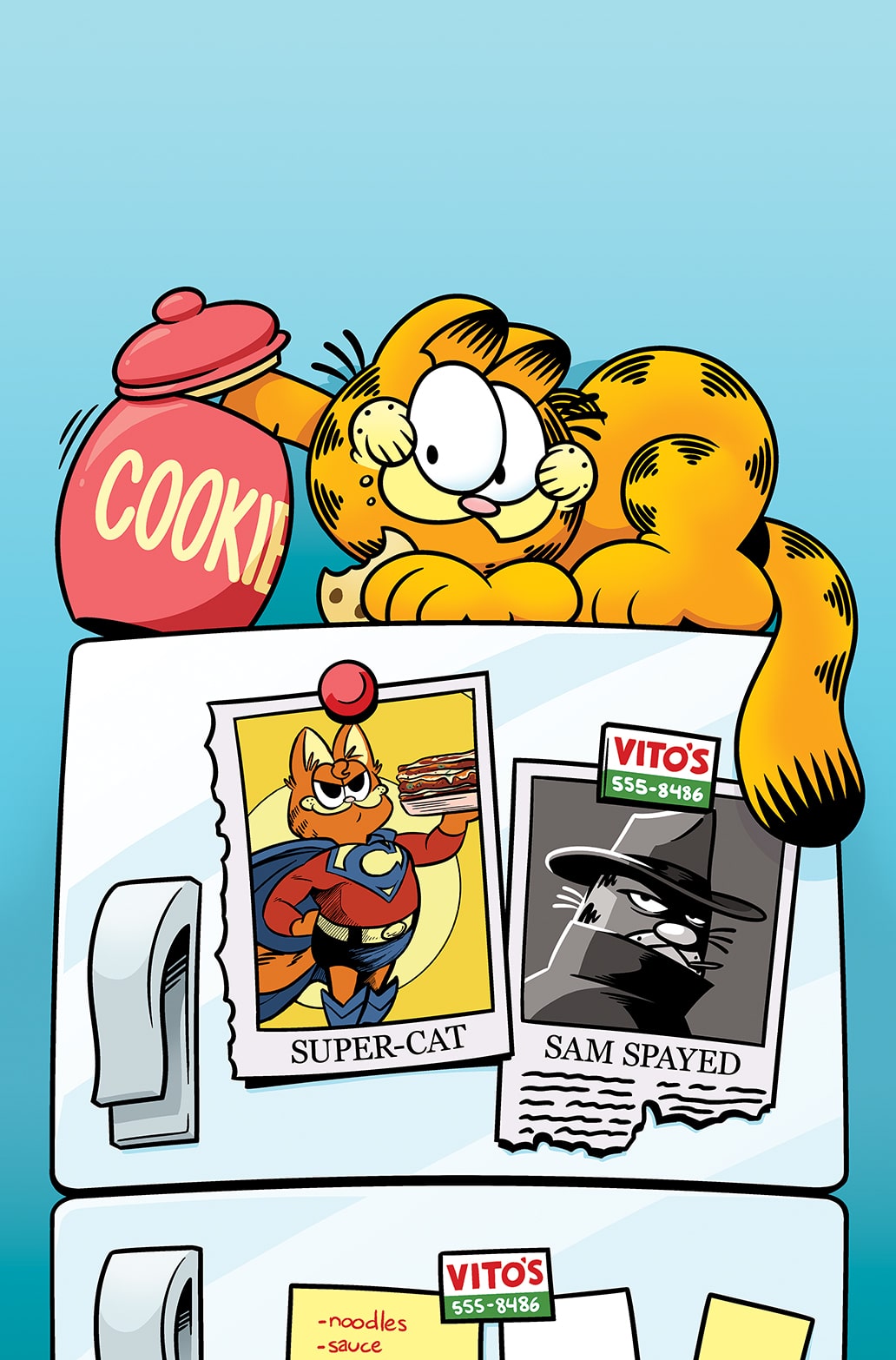 The trip through Garfield’s 9 Lives continues, as Brittney Williams illustrates a tale of Garfield’s adventures as a Golden-Age Superhero in “Super Cat,” while Andy Hirsch brings us the story of Garfield’s days as a Private Eye in “Sam Spayed.”