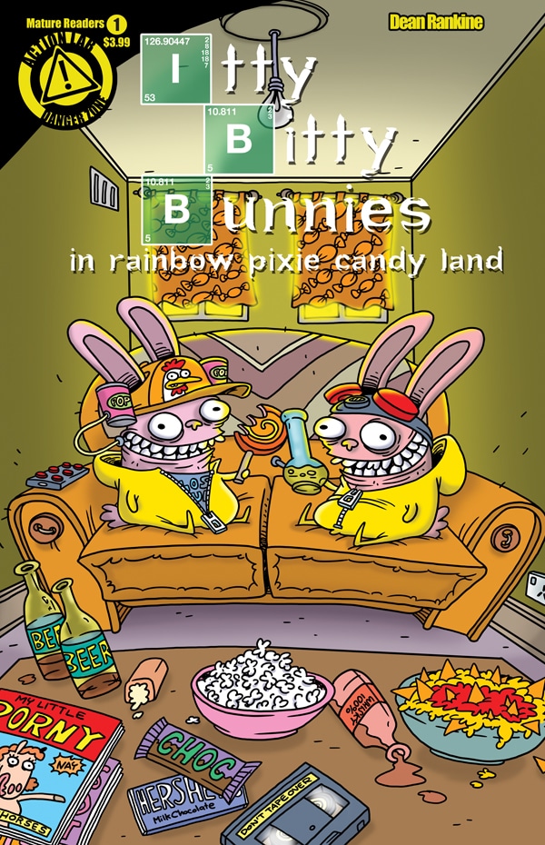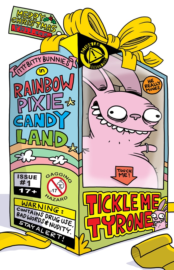 Itty Bitty Bunnies creator and cartoonist extraordinaire Dean Rankine lives down under, where Christmas is celebrated in the summer, so it makes perfect sense for his depraved creations to go on a holiday adventure now stateside. It also makes sense to the Bunnies to cook up a big batch of meth to help fund their Yuletide activities! Also available in a “Tickle Me Tyrone gift” variant cover, limited to 1500 copies!