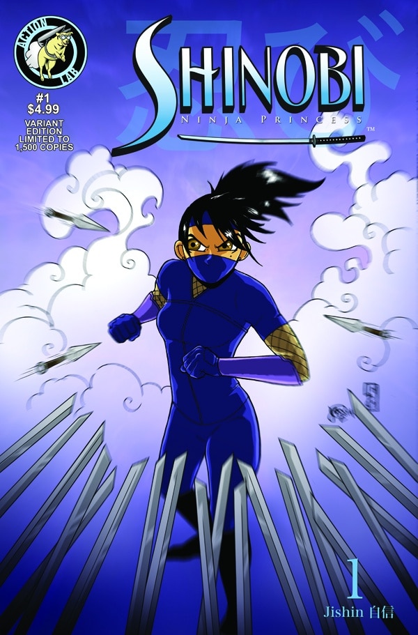 Jishin 自信 (Confidence): 14 year-old ninja princess Shianndrea Toshigawa and her strike team have a new mission: spy on their rivals, the Azumi Ninja Clan, and discover what secret dealings they have with the evil Emperor of Japan. But when the plan goes awry and fellow ninja Hamasuke is captured, can Shianndrea overcome her lack of confidence and save him before it’s too late? Variant cover limited to 1,500 copies!
