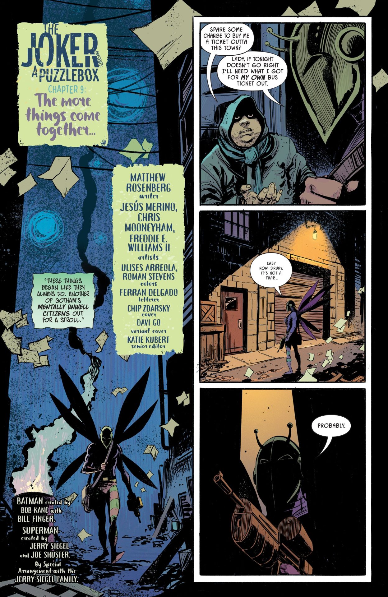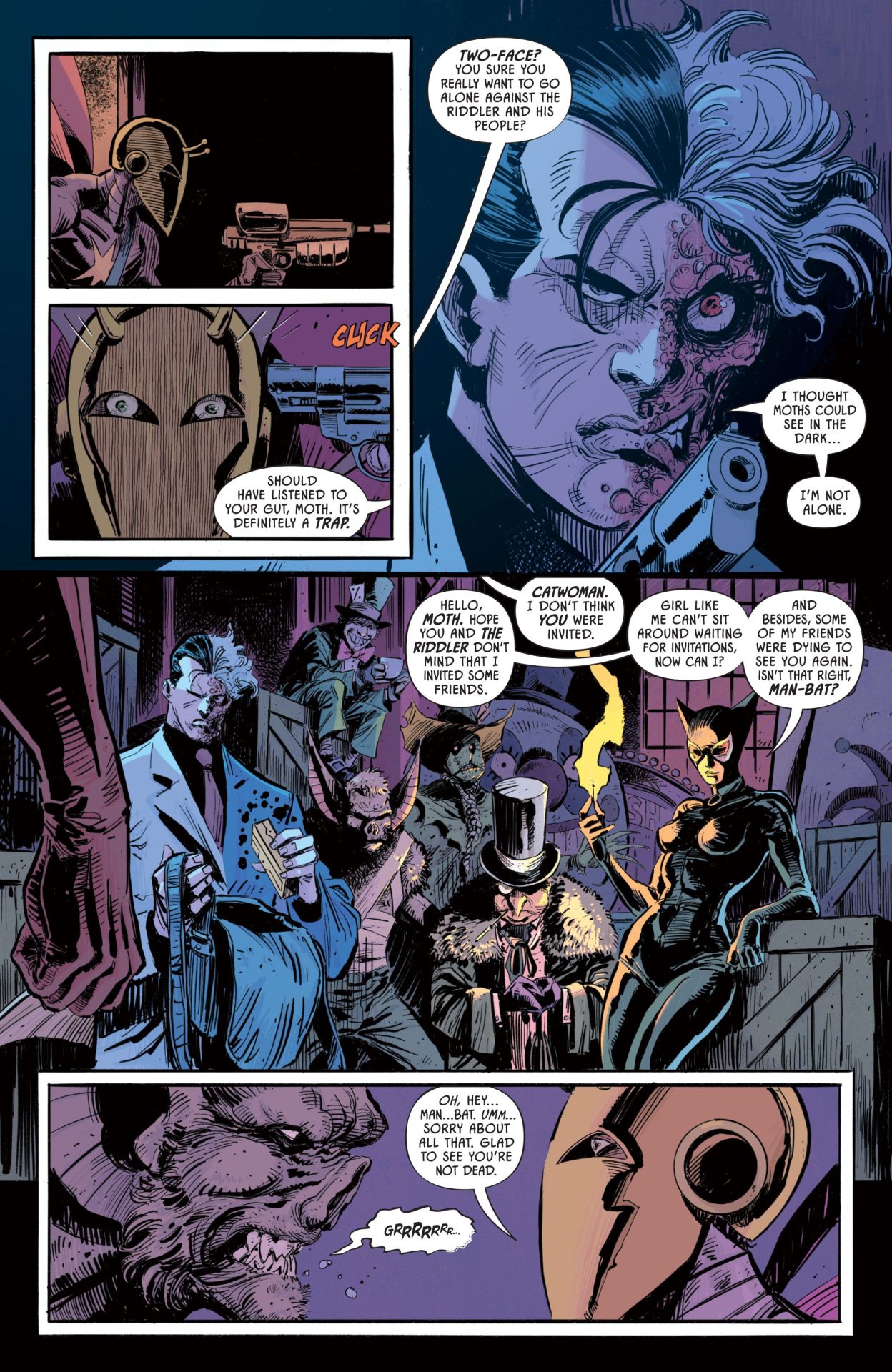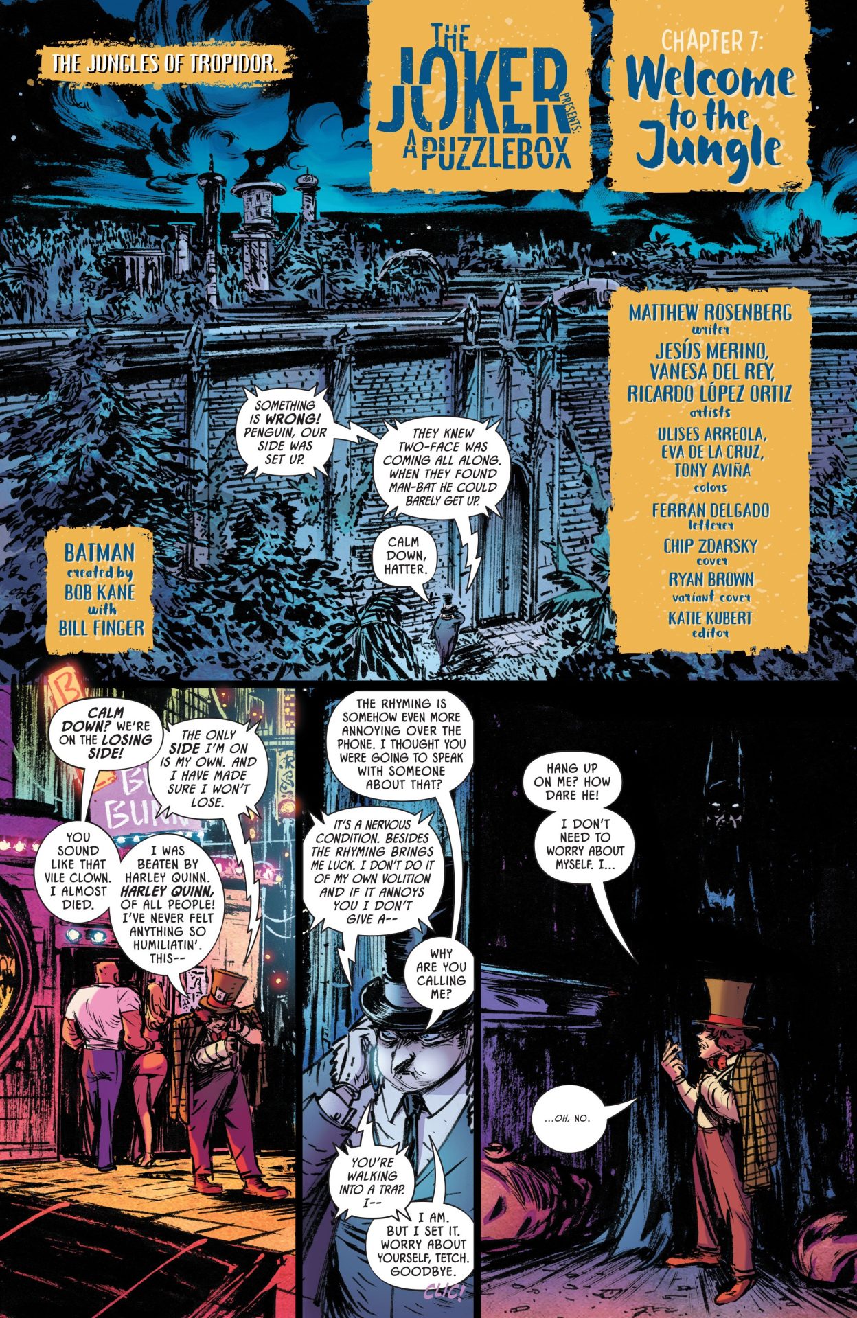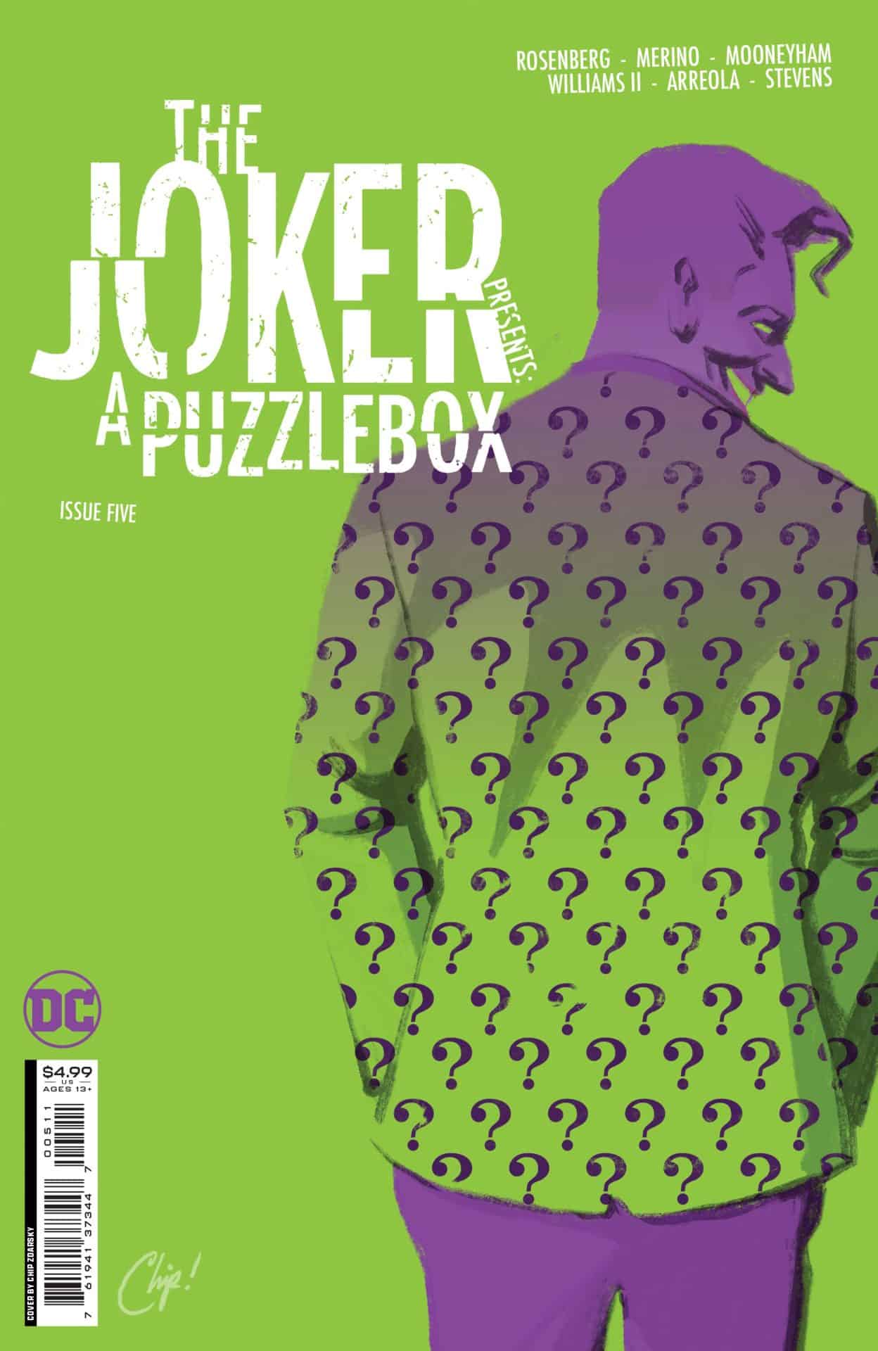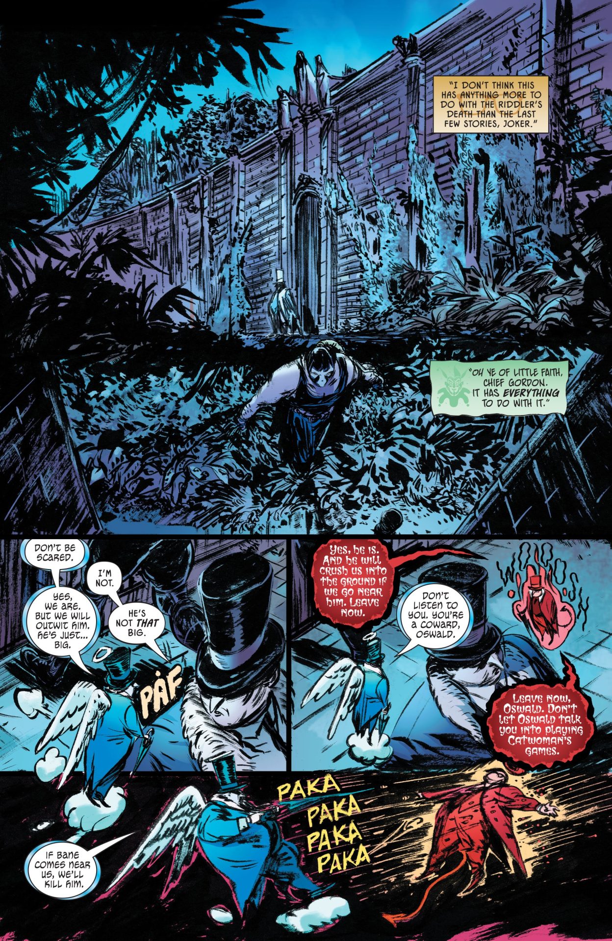 The Riddler’s death has left more questions! But the Joker isn’t giving the police the answers they need. Instead he shares two more tales of the twisted treasure hunt for pieces of the puzzlebox. First, the Penguin enters a test of might and wits against Bane. Then, the Scarecrow must go toe-to-toe with Professor Pyg to find out what he’s really afraid of.