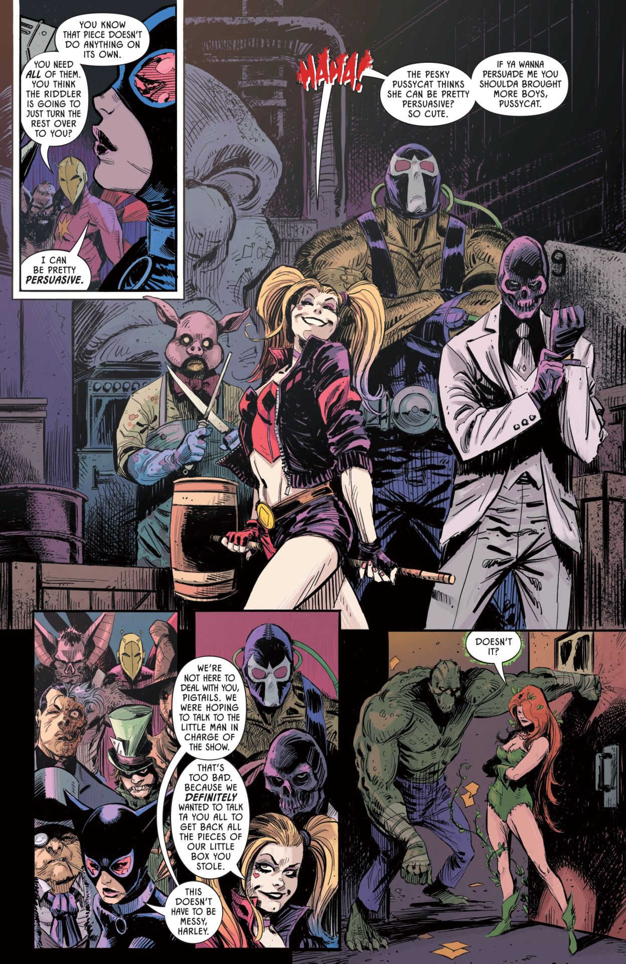 It’s all coming together! With the Riddler’s treasure hunt complete, the villains must gather to assemble the mysterious box. But putting that many criminals in a room is a dangerous thing…Unless that was the plan all along. And finally, the Gotham Police will hear Two-Face, Harley Quinn, the Penguin, and the Mad Hatter’s side of the story. But they all end with the same thing-Batman!