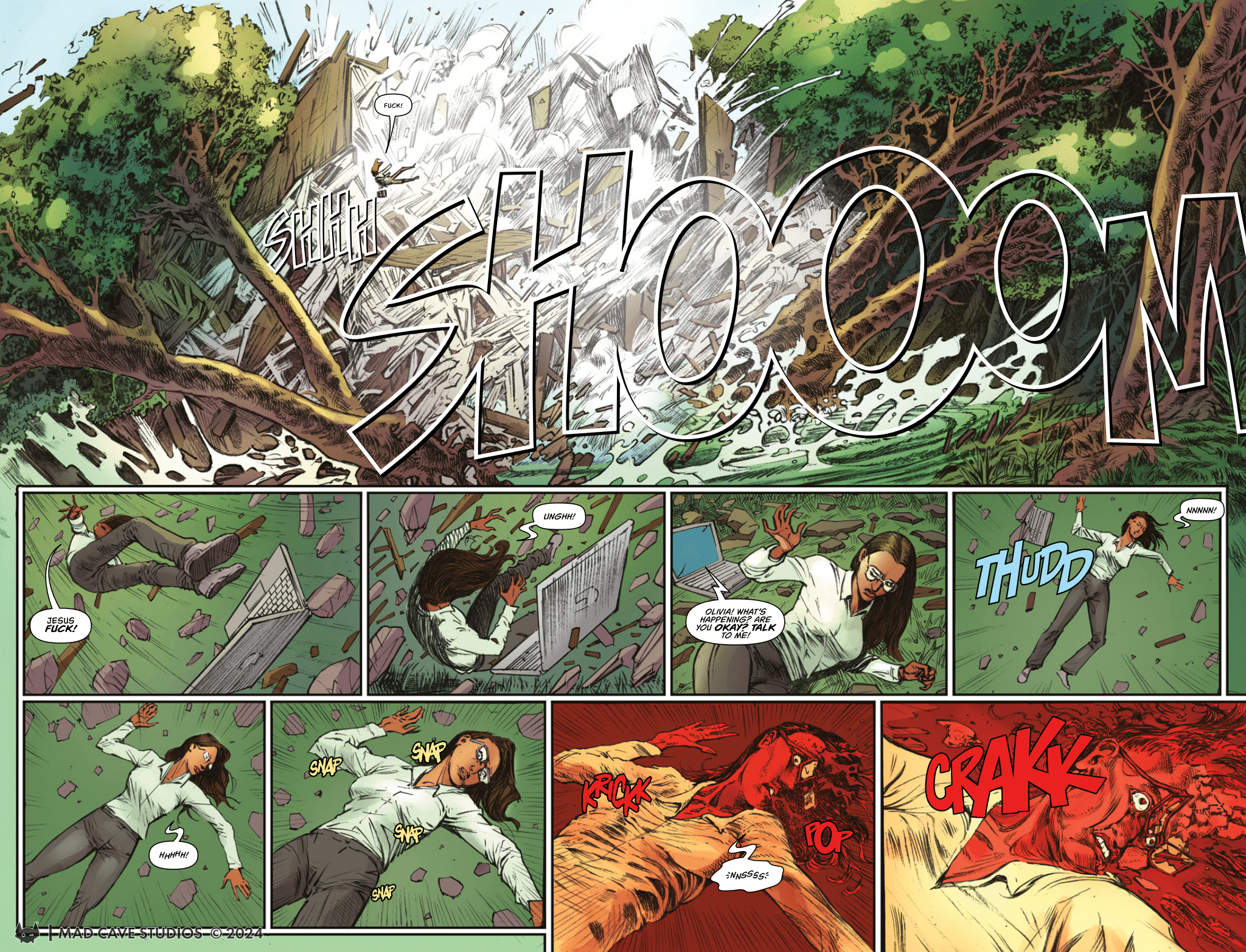 Something is wrong in the deep forests of Broke Tree Valley. Something deadly. Something mammoth. The legends speak of something larger than human comprehension… A monstrous phantom that disappears for decades at a time. Now, it’s back, and things are about to go Very Bad if four people-Olivia, Jess, Kokoro, and Mason, scientists who have come to the small city of Kasbro to investigate a bizarre series of seismic activities in this heavily forested valley-can’t put the Mammoth to rest. One real problem with this is…Olivia’s dead. The Mammoth #1 is a hell of a start that hits you in unexpected ways.