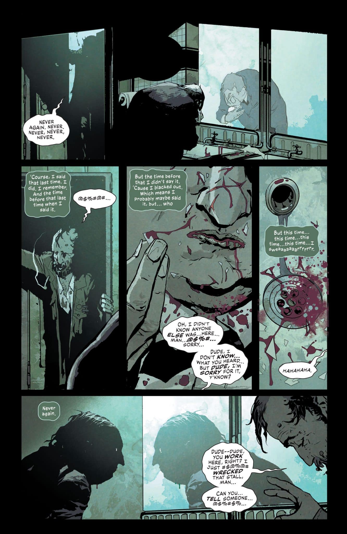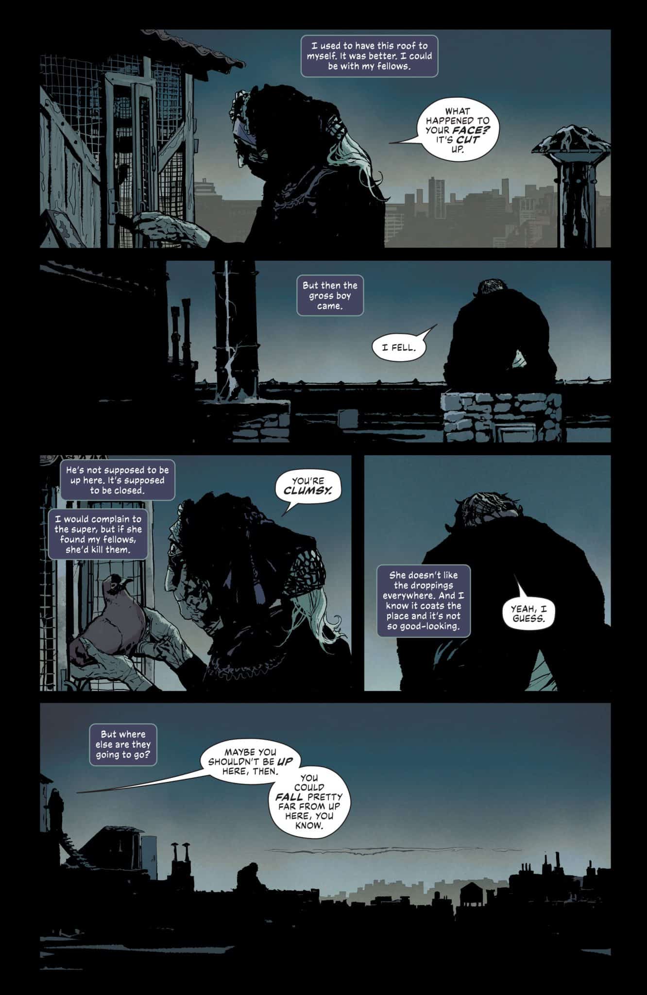 Stevan Subic‘s art is interesting. With color by Marcelo Maiolo and lettering by Clayton Cowles, the comic’s look has a dirty and gritty look that is quite different than what we see in other Bat-titles. Subic’s style, enhanced by Maiolo’s colors makes Penguin look much more like a monster. While I’m not the biggest fan of the look, I appreciate how it reflects Penguin’s role and how he sees himself. There’s something interesting about the art style, the arc’s themes, and how it compares to other art in other Bat-titles and the comic’s previous arc.