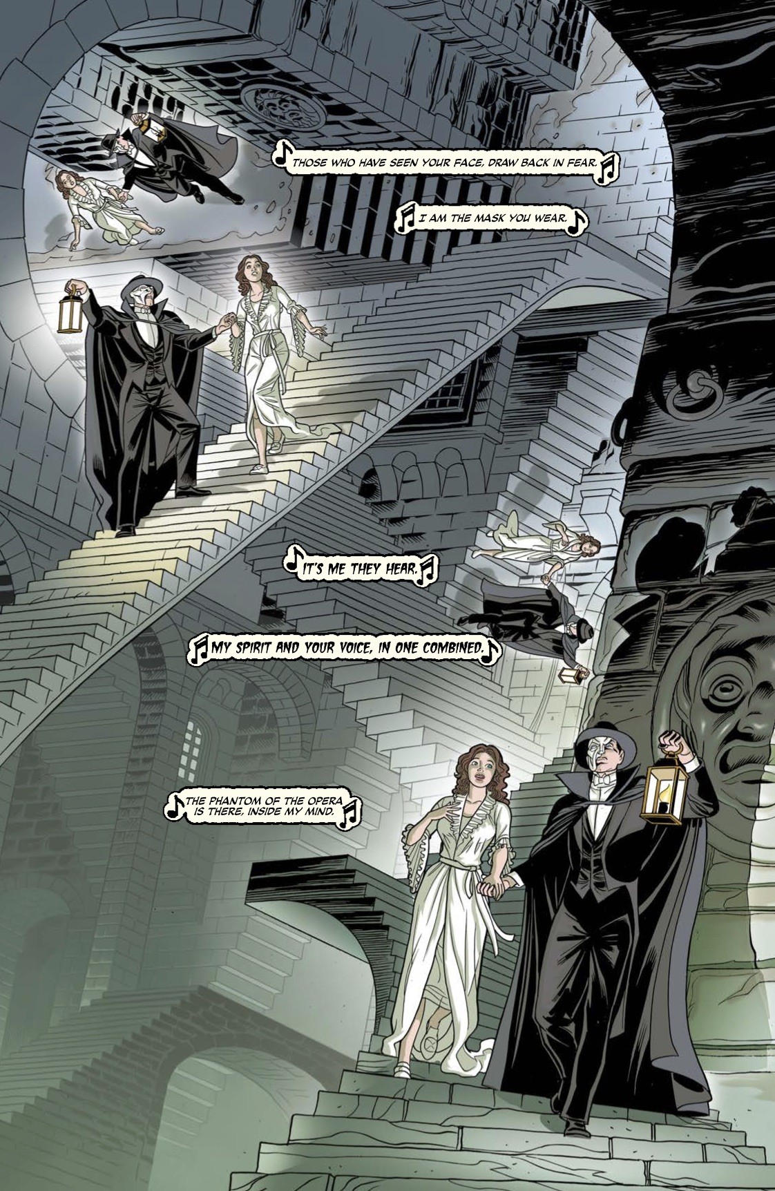Tomi’s color choices further elevate his illustrations of the opera house. Tomi uses soft, warm colors for flashbacks. These colors reflect Raoul’s fond memories of his childhood with Christine. The scenes set beneath the opera house really look like they’re set in a cave. Tomi colors these scenes while taking into consideration where the light source is located in each panel. The shadows created by this effect add intensity to scenes that are already spooky.