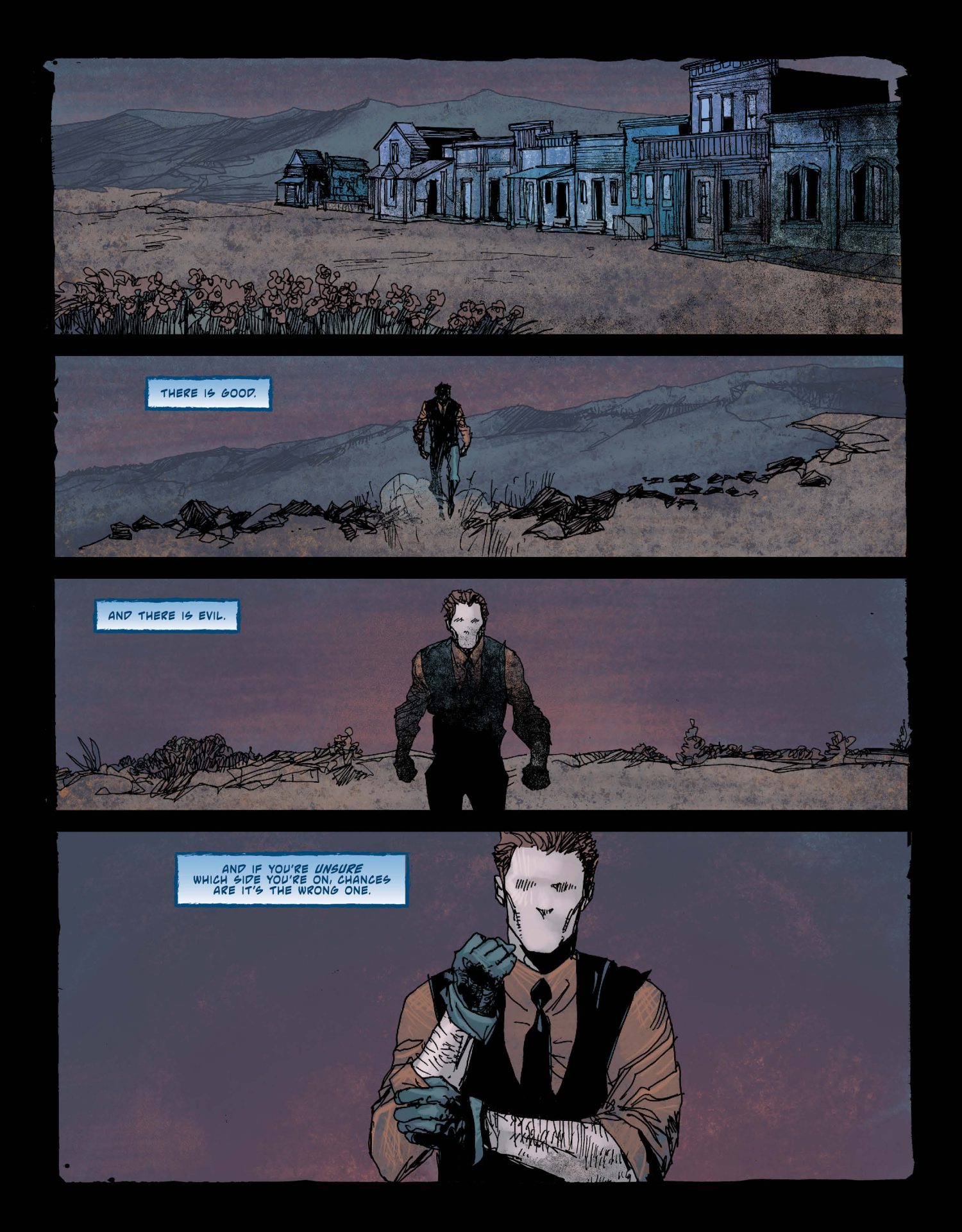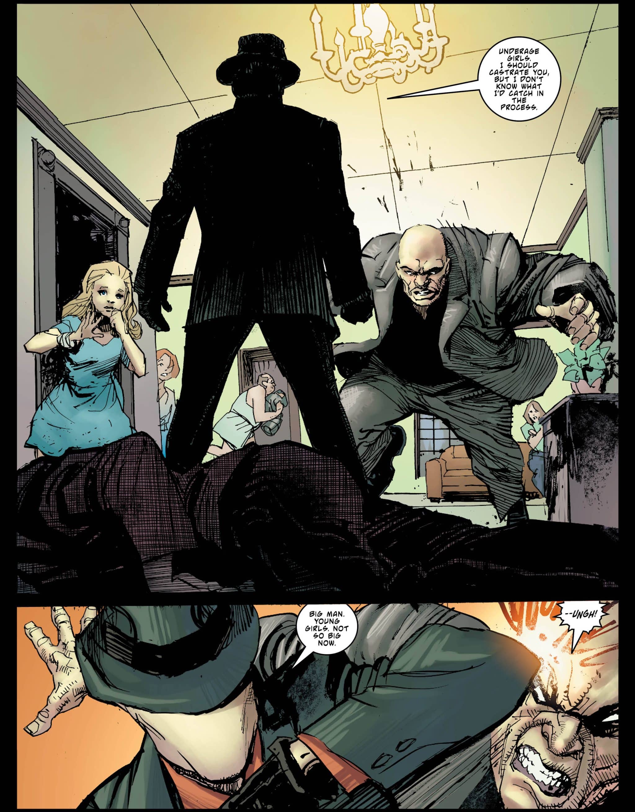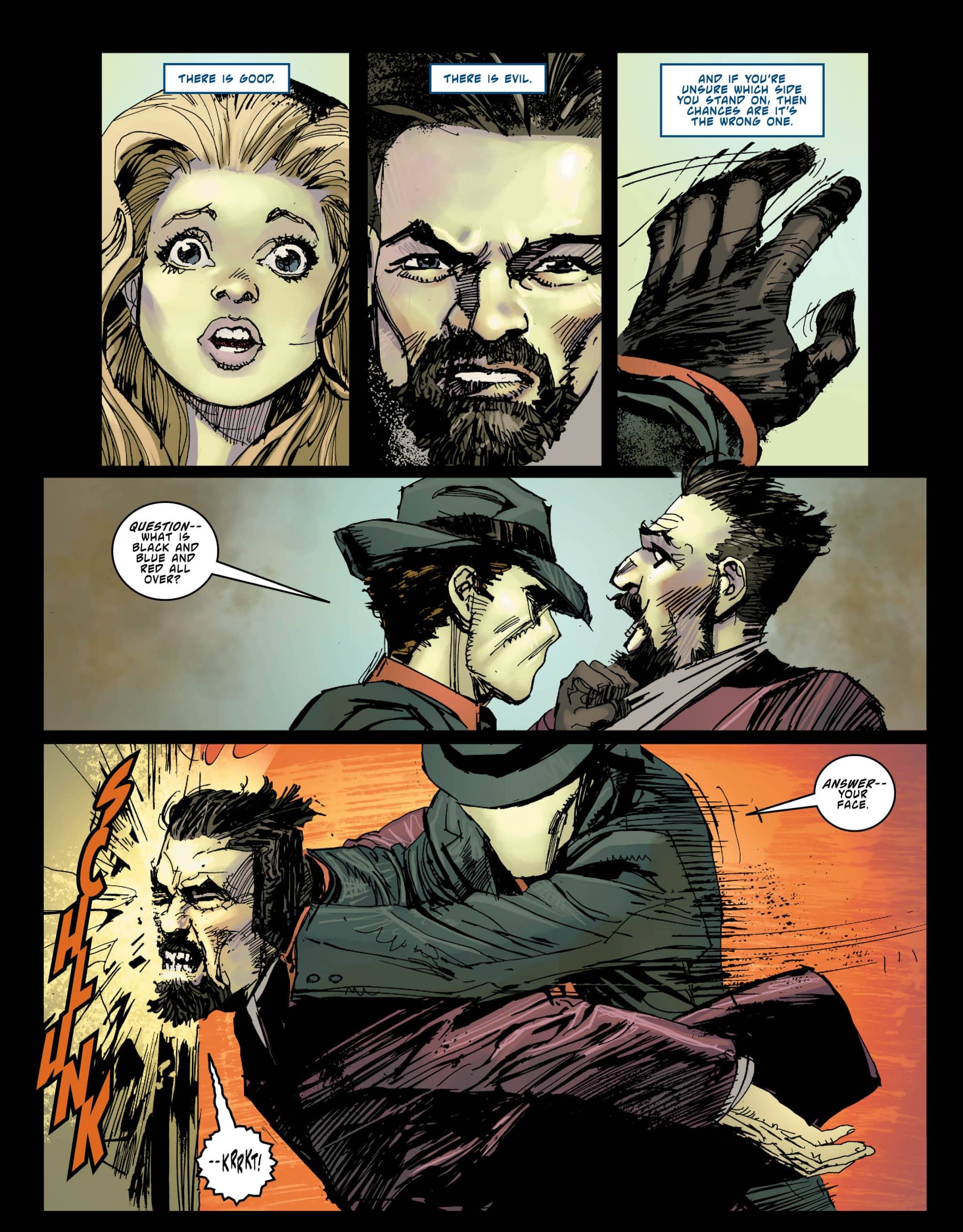 Thankfully, in the second half of The Question #1, Lemire and Cowan create the context for these images. It’s a departure from the crime fiction of the comic’s first act to something more mystical. Hence, Richard Dragon shows up with insight and potty mouth one-liners. (Think the Bride’s sensei in Kill Bill sans the misogyny and xenophobia.) From a big picture perspective, the conversation between Dragon and Sage also seems like a conversation between O’Neil and Ditko. The former taking Question into more of a zen Buddhism direction while Ditko used him as the avatar of his black and white view of the world. That was passed onto his creation Mr. A and Question’s spiritual offspring, Rorschach. (The nine panel grids and the use of “Hrrm” are a nod to that fellow.)