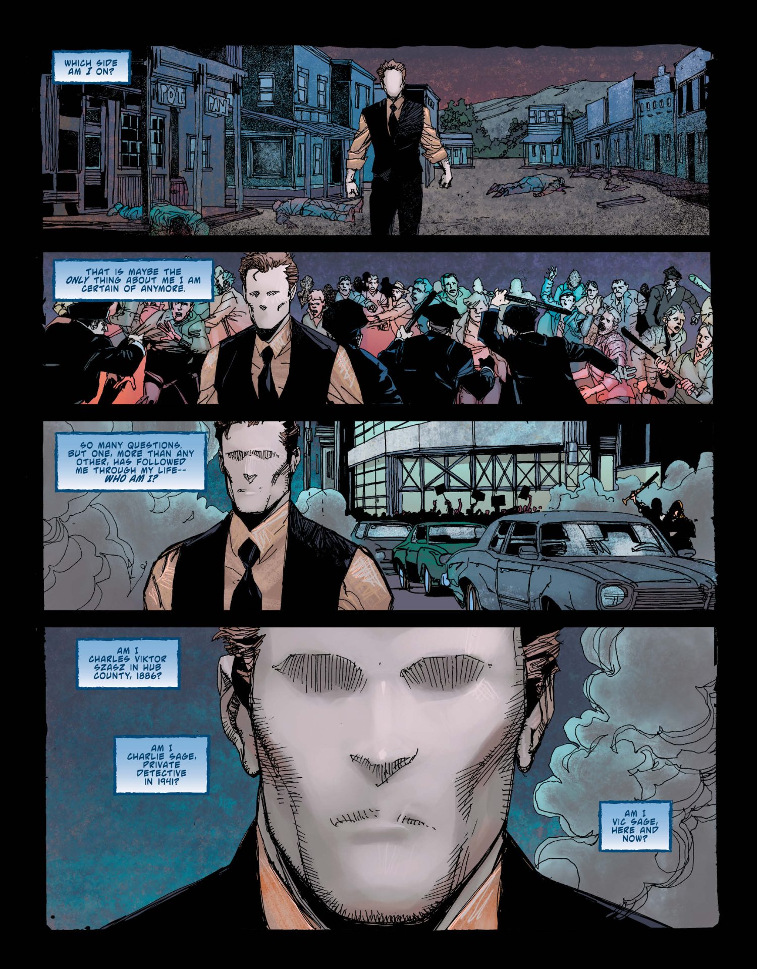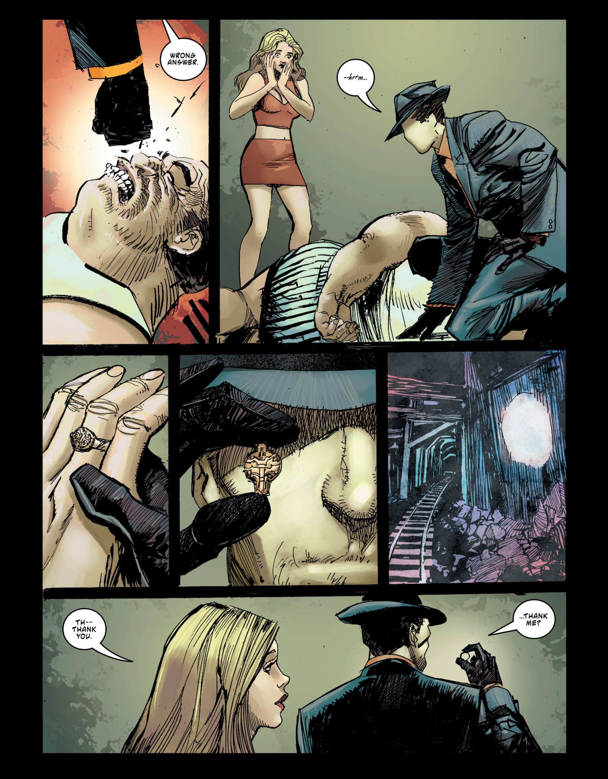 However, this dual identity isn’t so simple. Lemire and Cowan play with the different sides of Question and Vic Sage’s personalities. They show that Question’s single-minded quest for justice sometimes makes him lose the big picture. An example is the police shooting of an unarmed man while he’s following a lead about a ring that was on both the councilman’s finger and the mayor’s lawyer’s. The Question is a skilled detective but his conspiracy-driven nature can blind him to the everyday issues of his city. Cowan, Sienkiewicz, and Sotomayor show this visually through a wavy line, lots of black ink, and a darker color palette. It culminates in Question’s discovery of a literal abyss and some surreal imagery where you can really see the Sienkiewicz influence shine through.