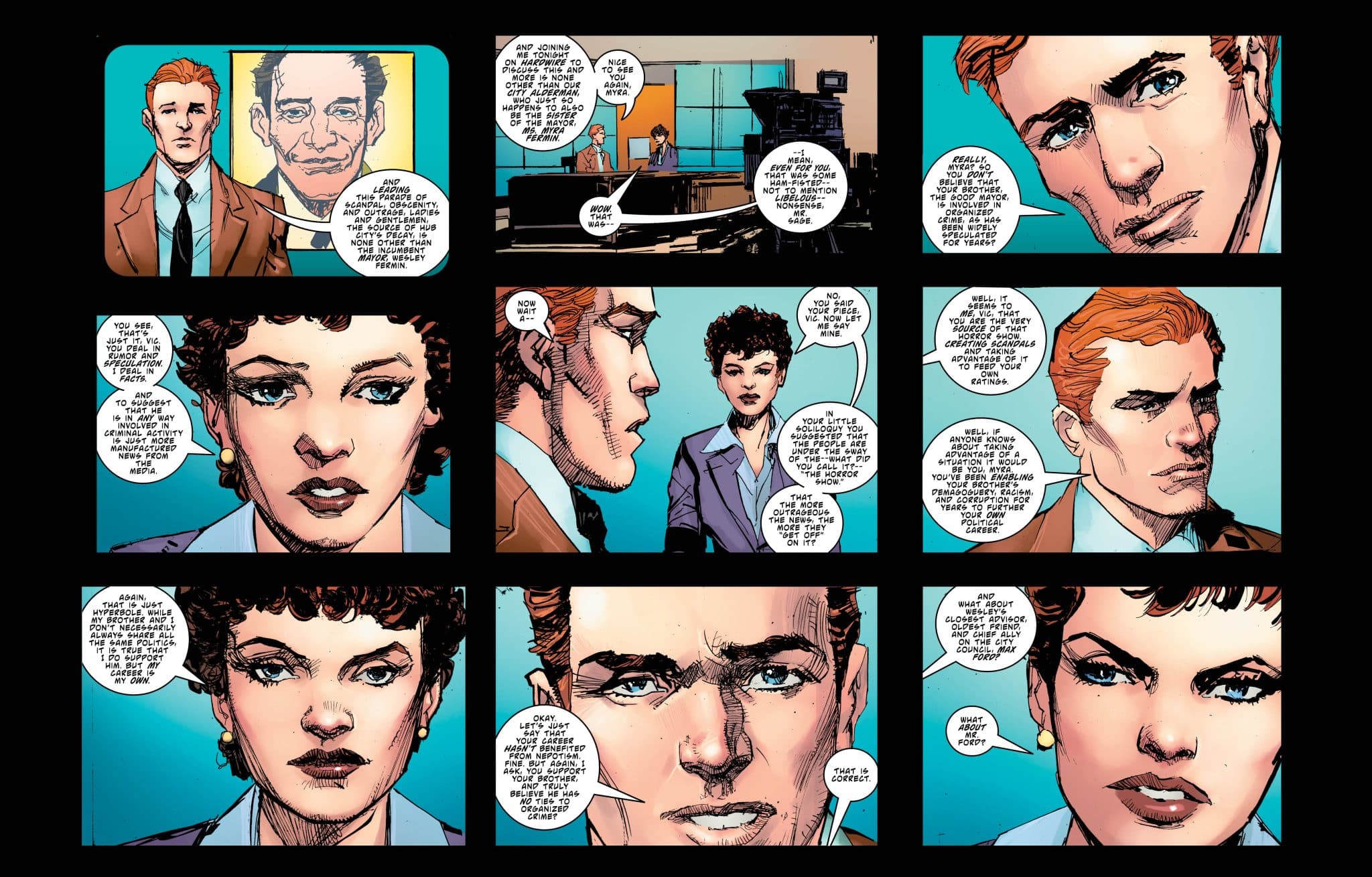 The comic opens up with Question muttering something straight out of a Mr. A strip or an Ayn Rand novel and catching a Hub City councilman in a brothel with underage girls. He knocks the creep about a little bit but is mostly concerned with recording footage for Vic Sage to play on the evening news where he openly accuses Hub City mayor Wesley Fermin of being connected to organized crime that leads to a lawsuit and more trouble. The sequence sets up Sage’s very public persona and role as the gadly, or voice of truth, in Hub City. That makes it necessary for him to wear face-warping masks courtesy of his old chemistry professor, Aristotle “Tot” Rodor.