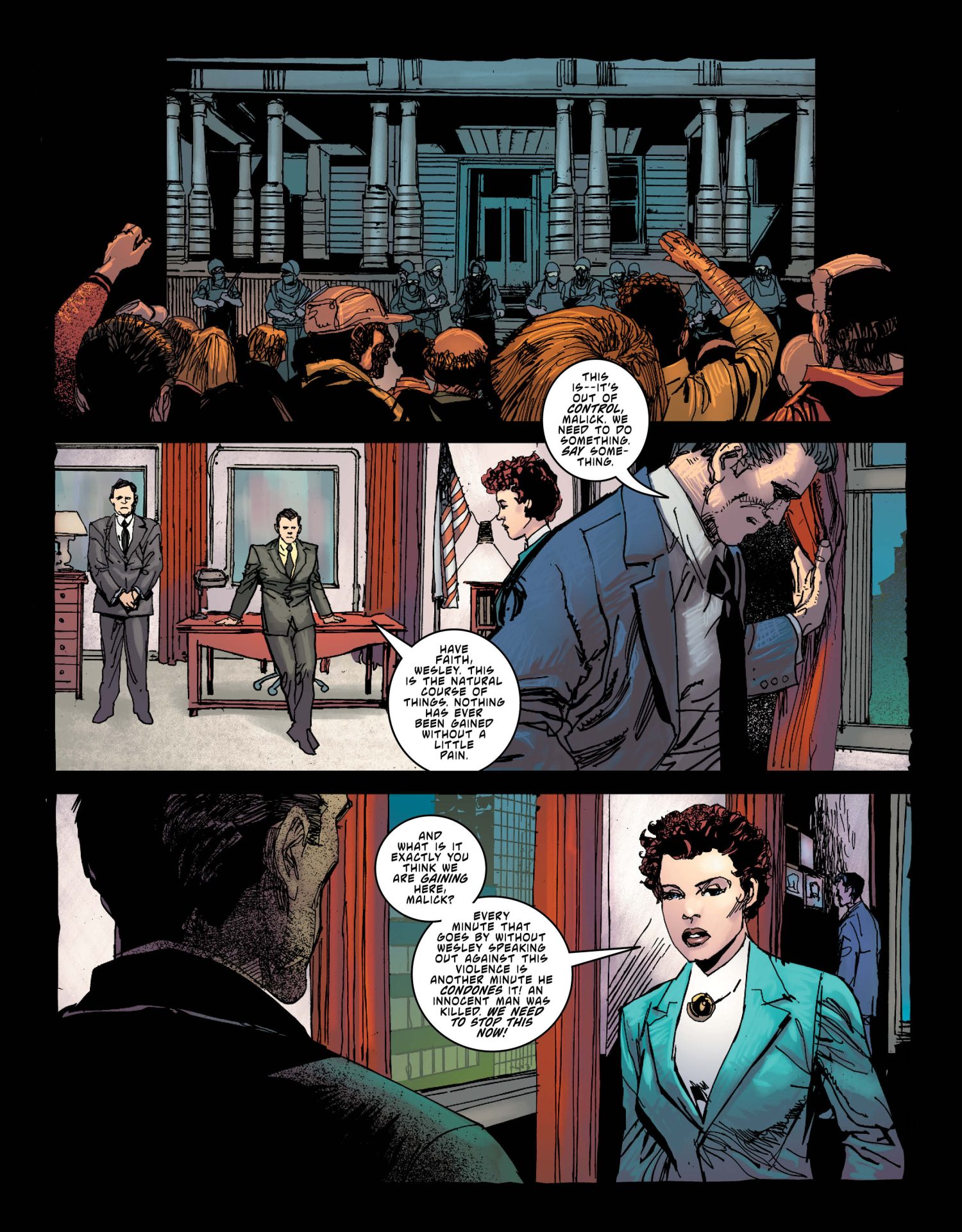 Richard Dragon believes that souls can travel between bodies while Question just wanted to learn martial arts to kick ass and is talking to his old teacher to solve a mystery steeped in symbolism, but connected to Hub City and its corruption. To take a page out of the German philosopher Hegel‘s book, Dragon is thesis, Question is antithesis, and they are a long way from synthesis. The last few pages introduce another wrinkle in the status quo in a natural non “Oh shit, we need a cliffhanger” way. Cowan makes fantastic use of recurring metronome motif to slip readers into another world. It’s like seeing a hypnotherapist as the story shifts in genre. His solid storytelling and well-placed use of six and nine-panel grids, as well as larger layouts, doesn’t waver.