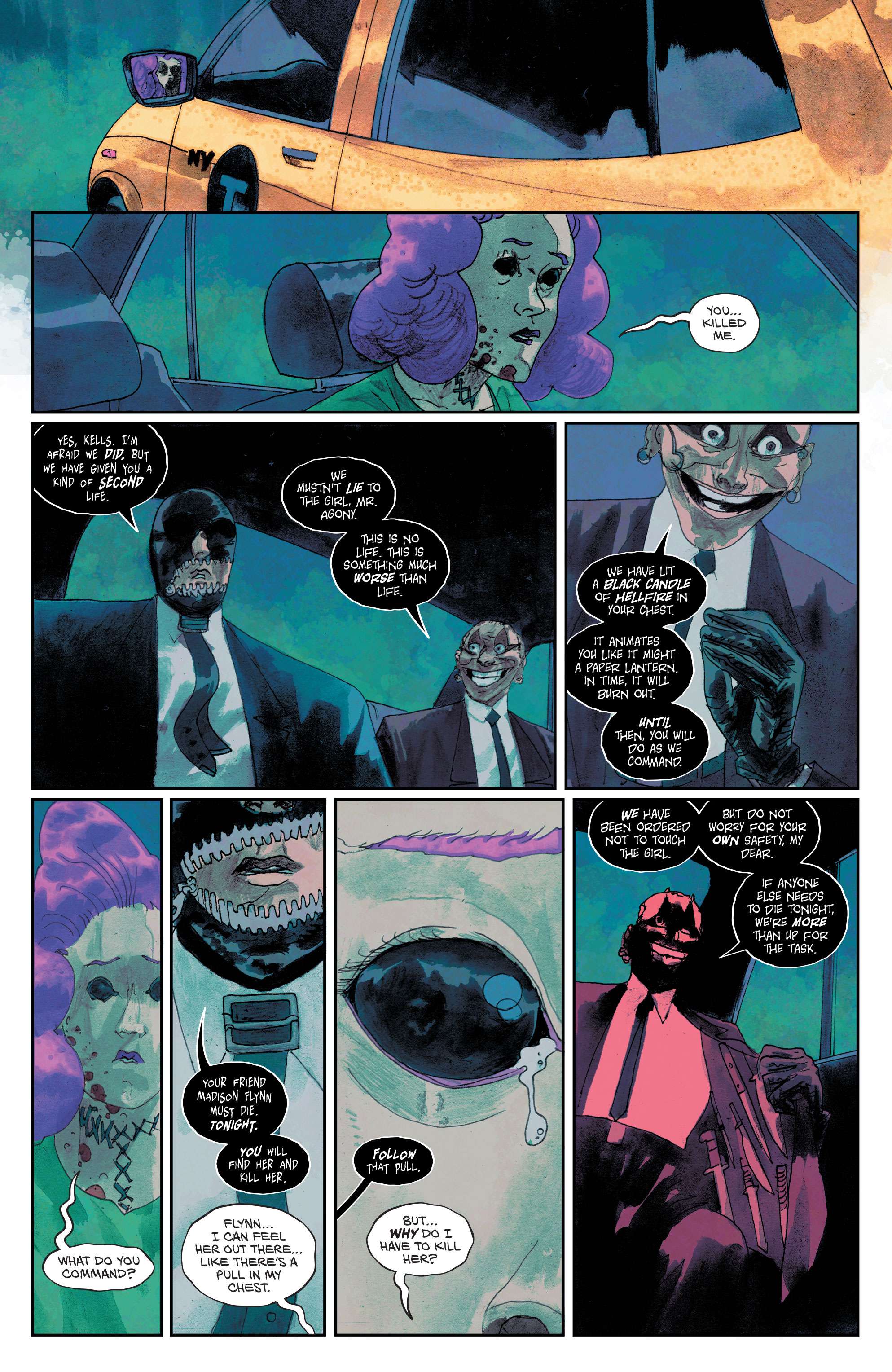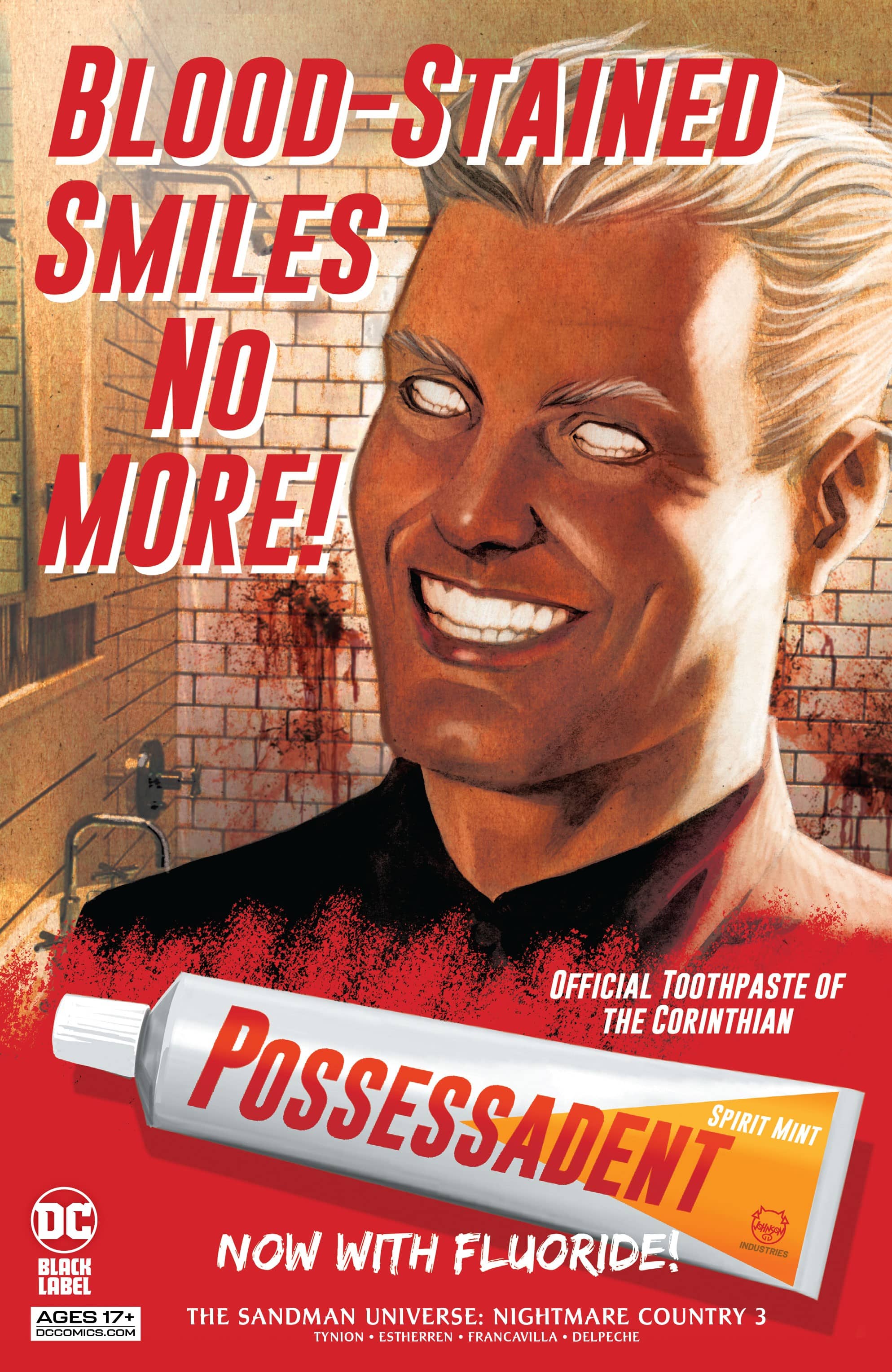 It’s interesting to be that their more surreal work is used for the “real world” (With jaunts into the horrific and bizarre) while Yanick Paquette‘s clean line and Nathan Fairbairn’s clearly delineated, color in the lines work is used for an interlude into The Dreaming in Nightmare Country. This four page sequence’s writing style is clearly Tynion channeling Neil Gaiman, and there are real “A book is a dream you hold in your hand” vibes to it as he introduces The Corinthian to anyone not familiar with the original Sandman series. He also does a super short story about a man in Appalachia that is afraid in mirrors that along with the last few pages featuring Mr. Agony and Mr. Ecstasy is more effective than any of the main story sequences featuring Flynn, The Corinthian, and her lover. However, Tynion, Estherren, and Paquette’s characterization of The Corinthian doesn’t go beyond creepy guy with teeth for eyes that has a connection/is an inspiration to Flynn and heralds a bigger fish in the pond, the Smiling Man. He’s just a fixation for now even if Lisandro Estherren and Patricio Delpeche make crimson, scarring mini-masterpieces out of Flynn’s paintings of him.