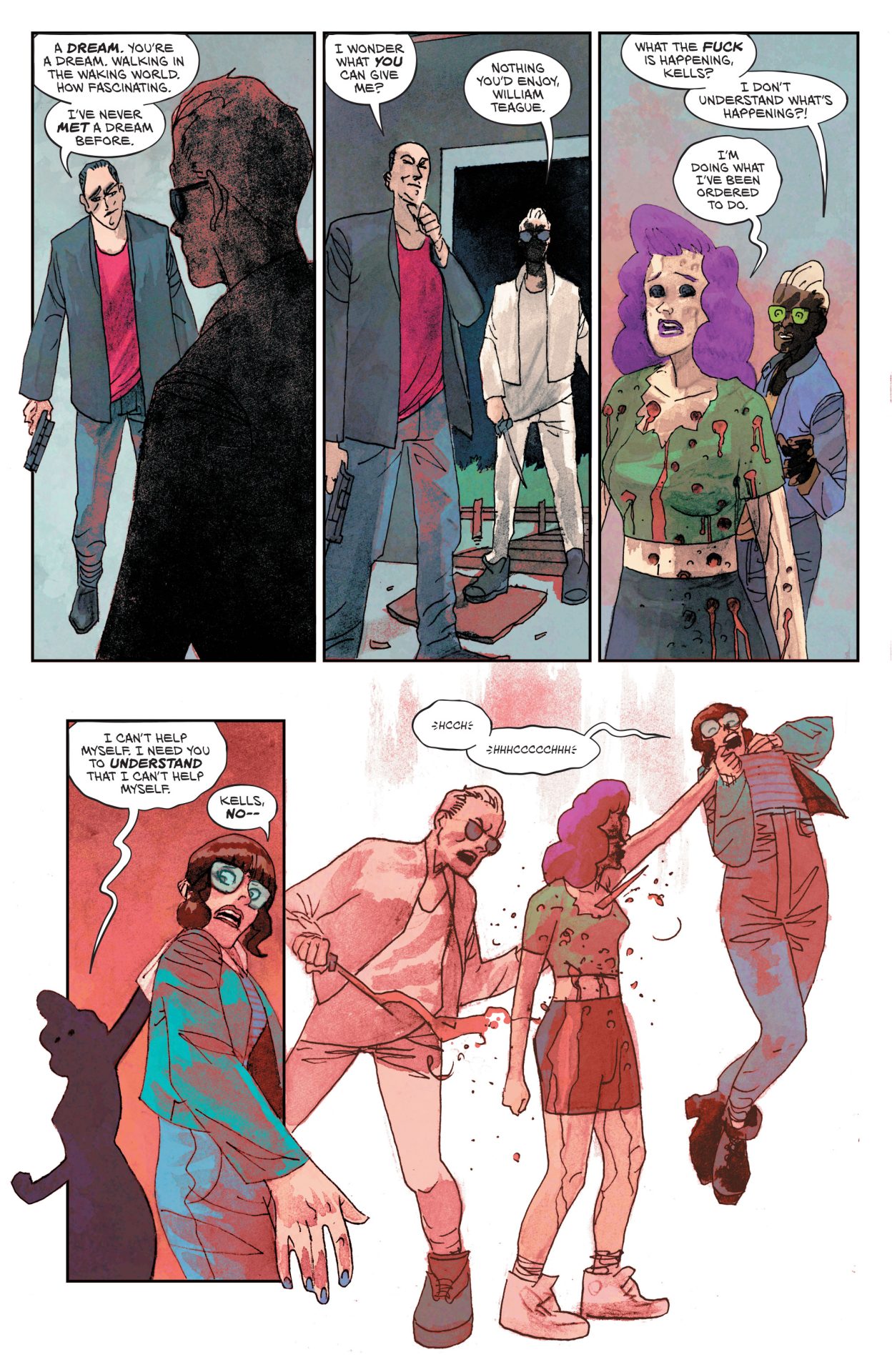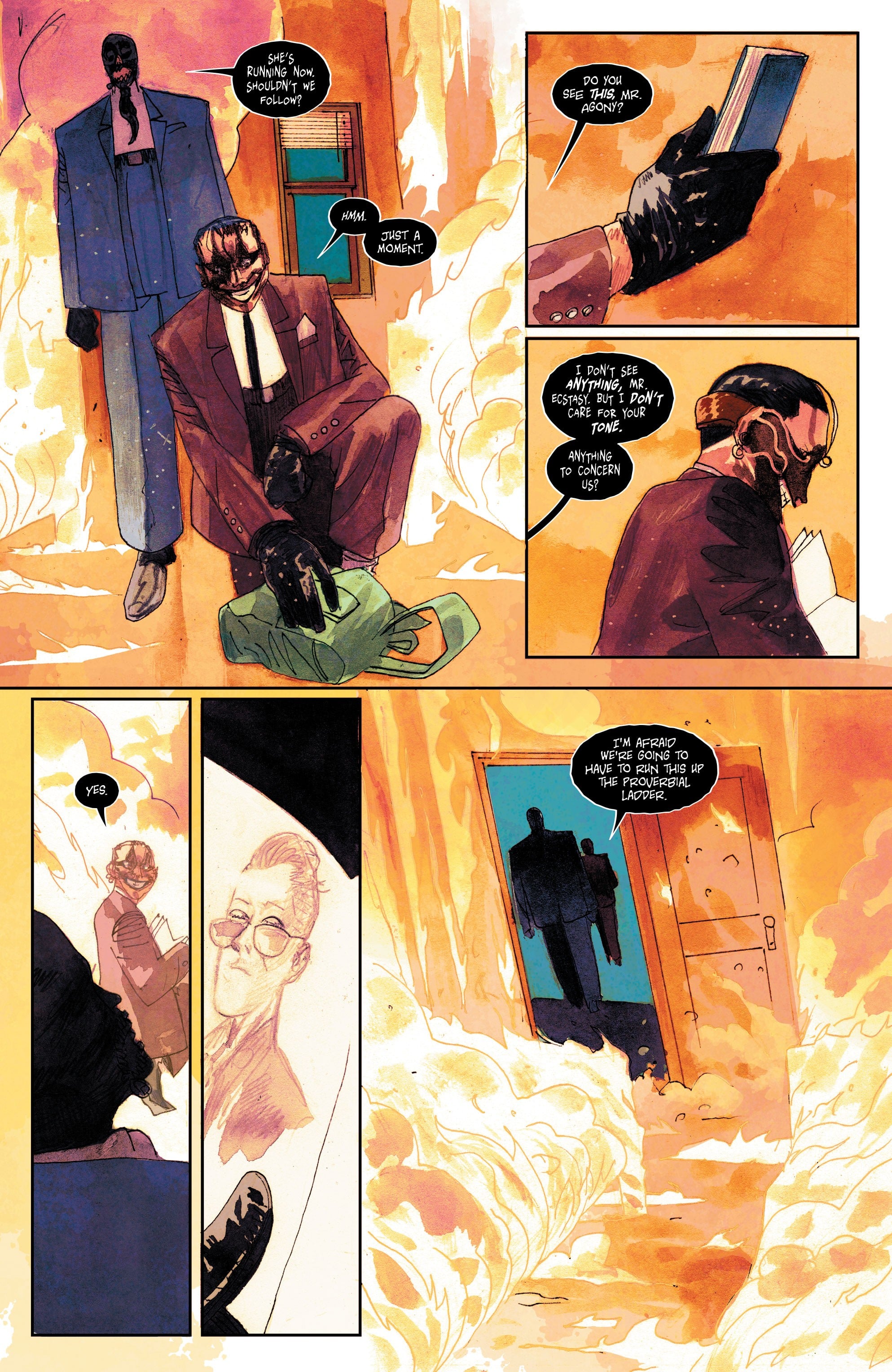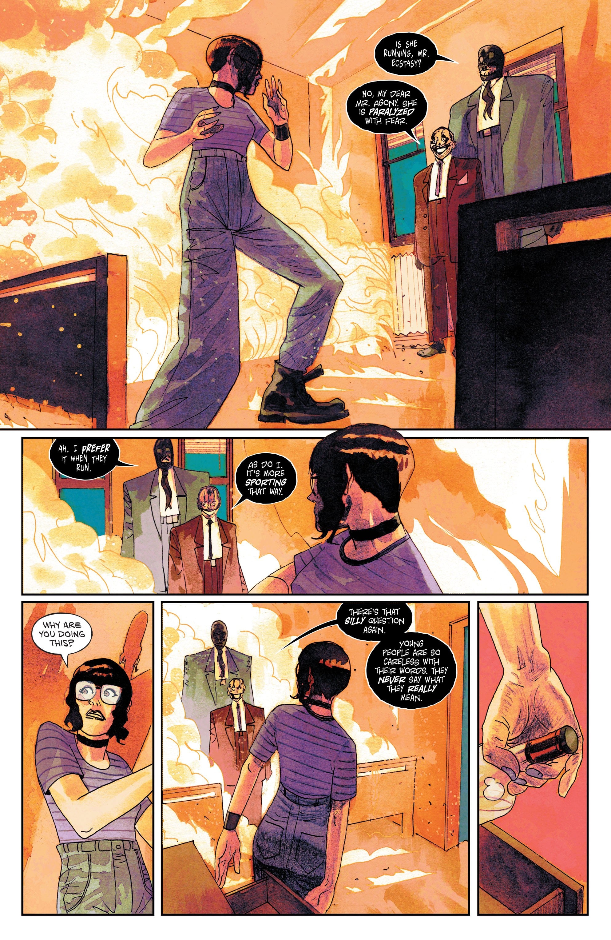 It fits the whole actual dream/nightmare of it all, but Nightmare Country‘s key flaw is honestly how the scenes are put together. The Paquette/Fairbairn sequence has more of a prologue vibe and its combination of strong visuals plus nostalgia for the original Sandman may have worked better opening the issue than Flynn talking bullshit at the bar with a man who she ends up in bed with despite sharing almost no chemistry beyond man and woman at a bar. (There’s an awkward panel that I think is meant to be their arms brushing against each other to create a physical connection, but it’s staged in extreme close-up and is hard to follow.) But, despite a slow start, Tynion and Estherren do end with Nighmare Country‘s most entertainingly written sequence plus some gory chills in the visual department as Mr. Agony and Mr. Ecstasy match their names in the best way and have some amusing banter while killing their victim. But, of course, The Smiling One is the Big Bad and gets the final page despite only being basically “that creepy guy in the background” for now. It’s meant to be a mystery, but for now, I’m not super invested as Agony and Ecstasy steal the show.