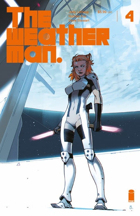The Weatherman, Vol. 2 #2, introduces Pace and Pickles—an exciting and strange new ally guarding a horrible secret! Nathan, Cross, and the crew of the Disco Queen scour the ruins of Earth for the woman responsible for wiping Nathan’s mind, only to find themselves in a fight to the death against mysterious genetic monstrosities… and not everyone makes it out alive.