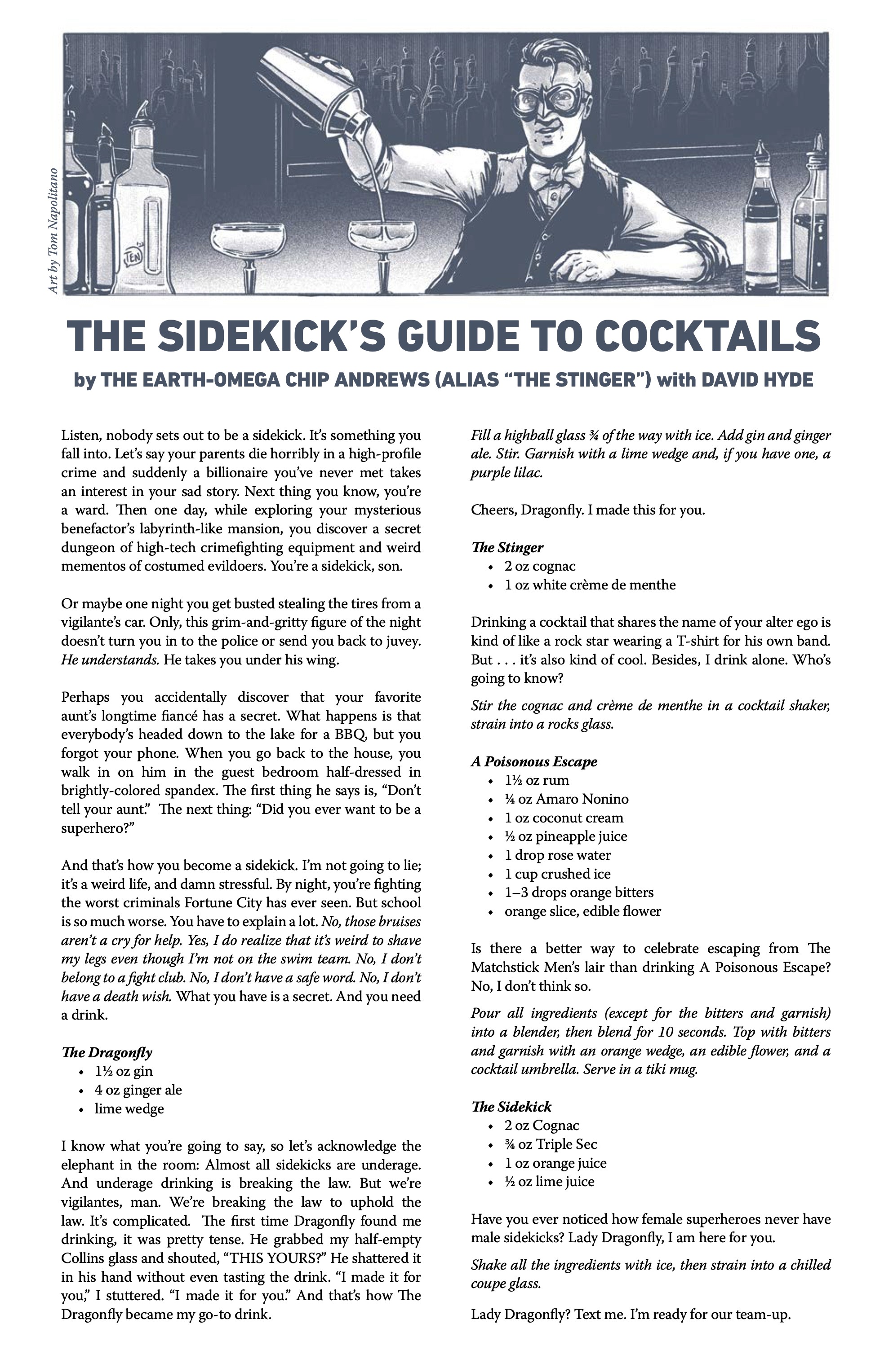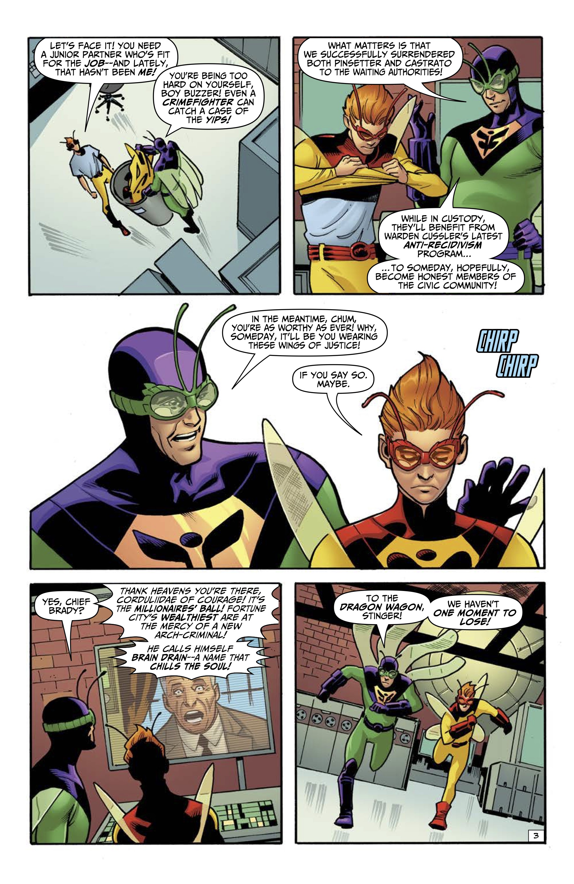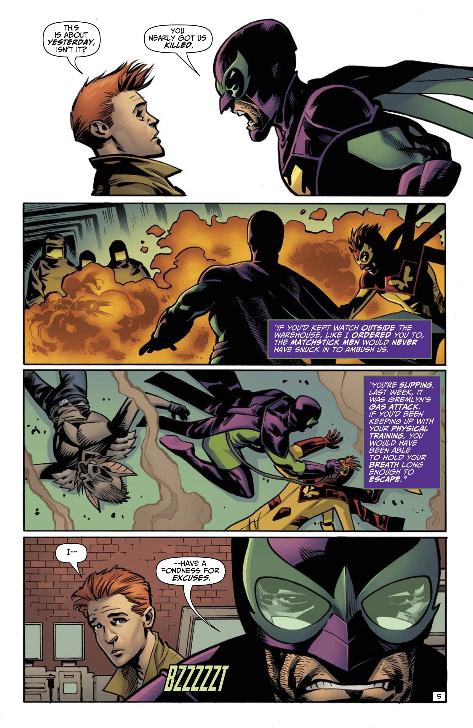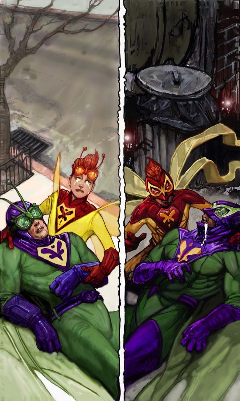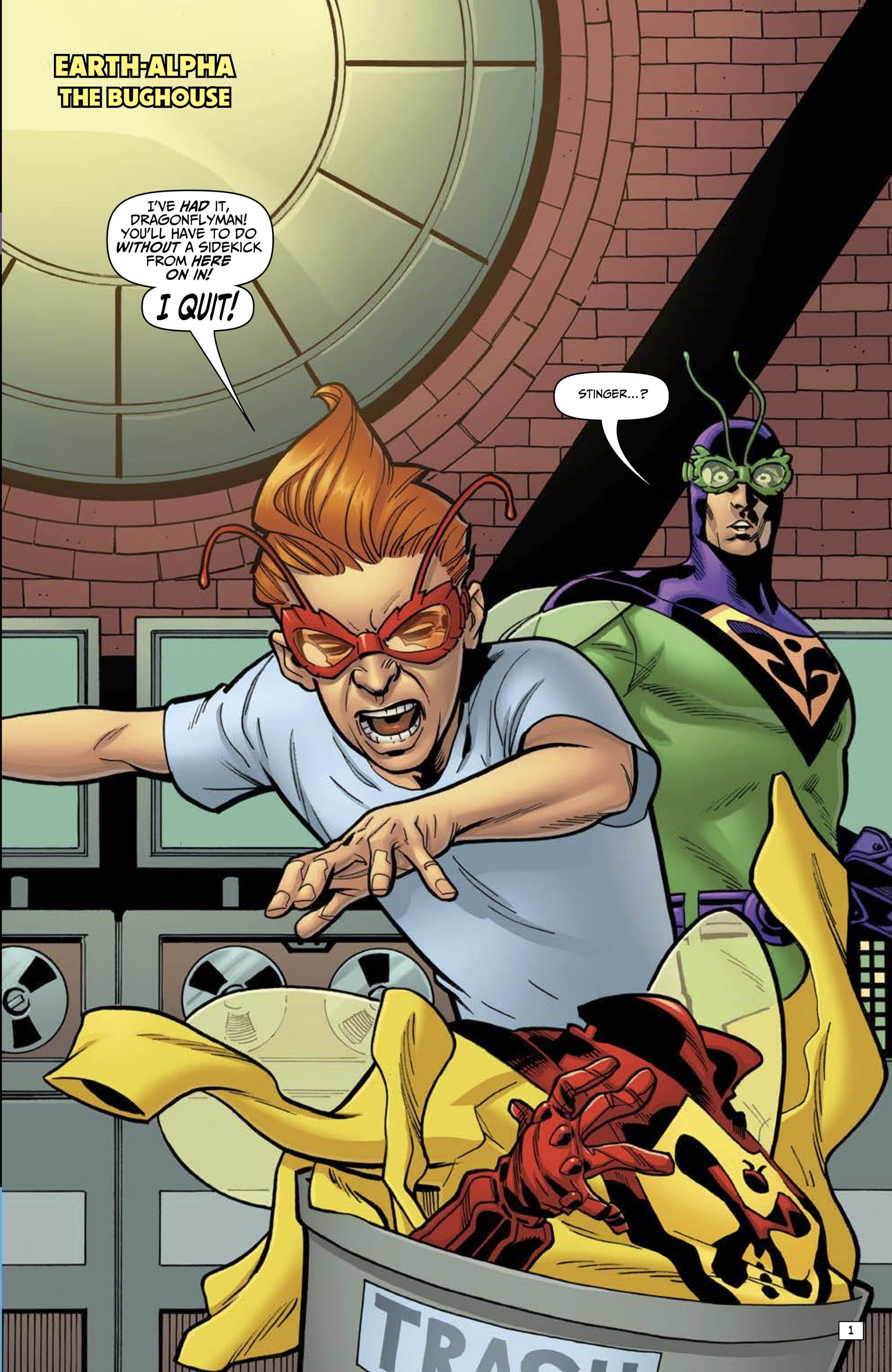 • The Wrong Earth: Confidence Men #1 by writer Mark Waid, artist Leonard Kirk, and letterer Rob Steen. On sale in June, it’s the tale of two sidekicks! On campy Earth-Alpha, circumstances force kid sidekick Stinger to become Dragonflyman’s mentor! On gritty Earth-Omega, Dragonfly and Stinger go to war—against each other!