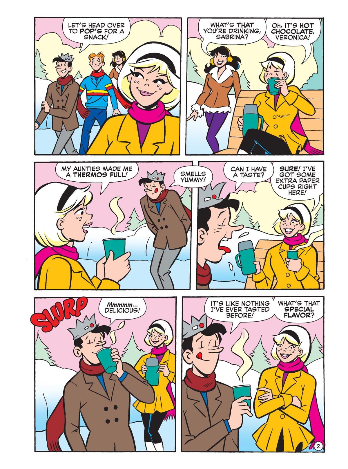 TWO BRAND NEW STORIES! First, someone has stolen a copy of Ms. Grundy’s semester final and it’s up to crime podcast host Fran Frazer—along with Betty & Veronica—to find out who took it and why. Then, after ice skating with the gang, Sabrina shares some hot cocoa her aunts made for her with everyone—little does she know it’s actually a potion to help her skate better! What happens when magic ends up in the wrong hands (or, in this case, feet!)?