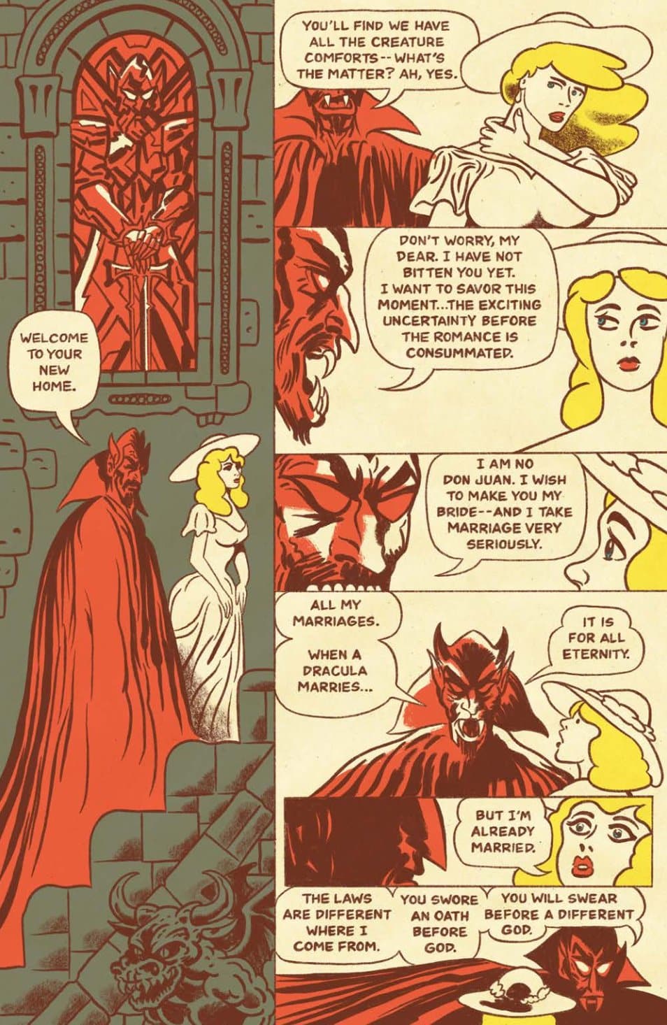 Yes, the themes of the irrationality of love and family feuds shine true in Romeo & Juliet and Godzilla. There’s even a gorgeously colored dream sequence where Romeo and Juliet find a happy ending under a stained glass window of Toho monsters that illustrates that this isn’t Verona’s first Kaiju rodeo, as well as the cyclical nature of war and conflict. It’s just also a plain cool piece of art from Peacock, and he adds depth and humor to Tierney and Shakespeare’s text. He has a Tom Scioli meets Classics Illustrated style that works for the tone of the book, even if some of the panel transitions can be muddled and confusing, like when Juliet takes this story’s take on the “poison”. But, overall, Sean Peacock brings a dynamic approach to layouts that draws parallels between Romeo/Juliet and Godzilla/Mothra. The way the action is staged feels like a stage play, too.
