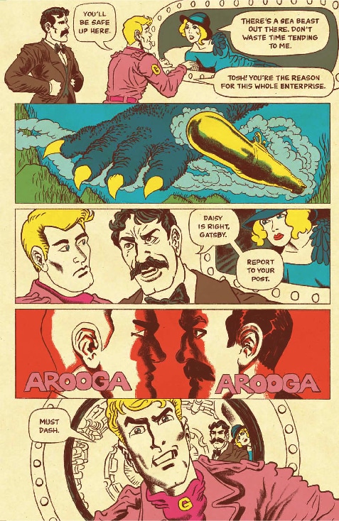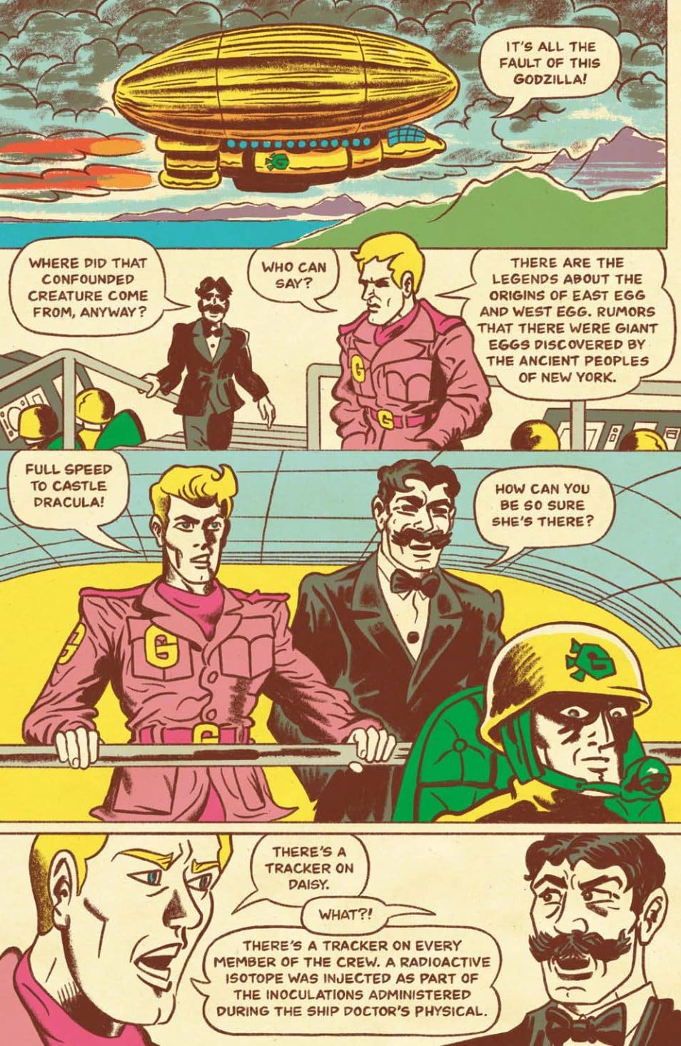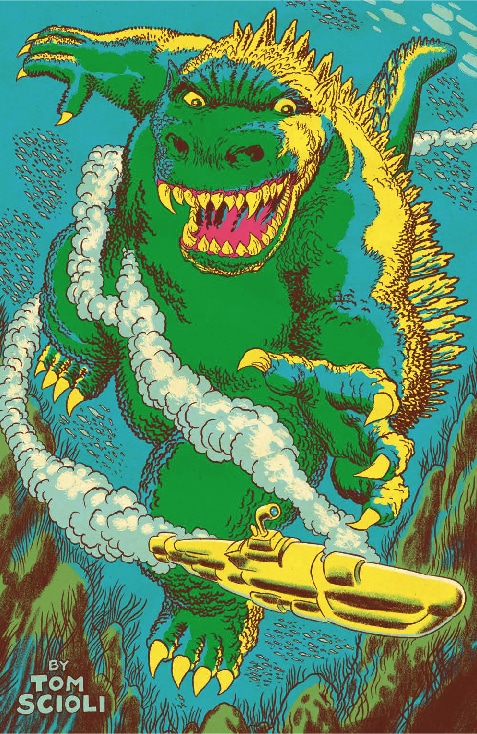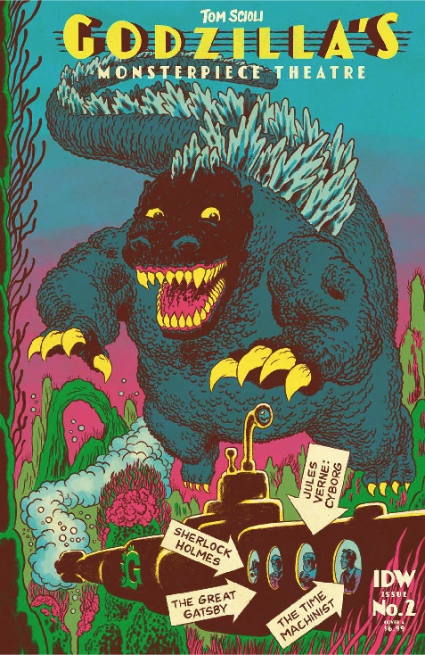 Even better than the lead story is the first chapter of Tom Scioli’s Robin Hood and Godzilla serial that will run as backups in all of the Godzilla’s Monsterpiece Theatre Presents titles. The King of Monsters plays a background role in this story, with Scioli gleefully throwing himself into an all-swashbuckling, all-the-time adventure yarn with violence and hijinks that would make Errol Flynn smile. He uses page layouts to spring the trap that Robin Hood pulls off on the Sheriff of Nottingham and his goons, and honestly, this comic works out as a straight-up Robin Hood comic without the Godzilla bit. However, with his face poking out of the water, Godzilla represents menace and the escalation of stakes to come. Tom Scioli uses Godzilla’s presence in the book to put Robin Hood in the tradition of the chivalric romances because this hero finally has a kind of dragon to slay.