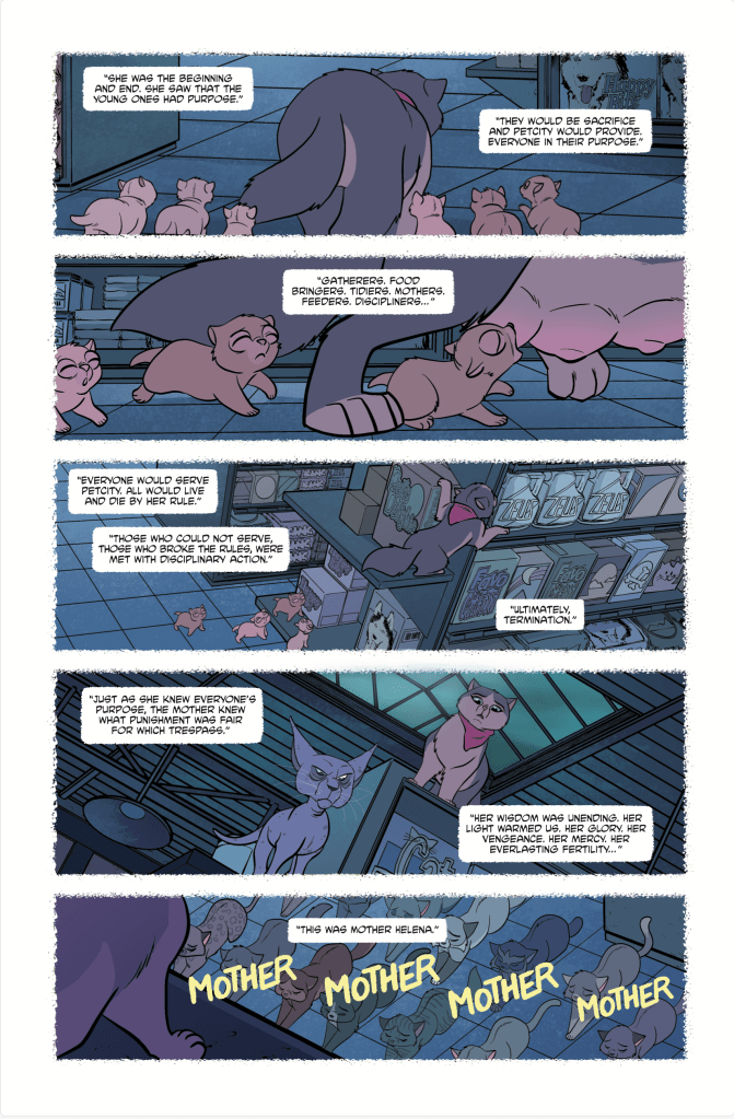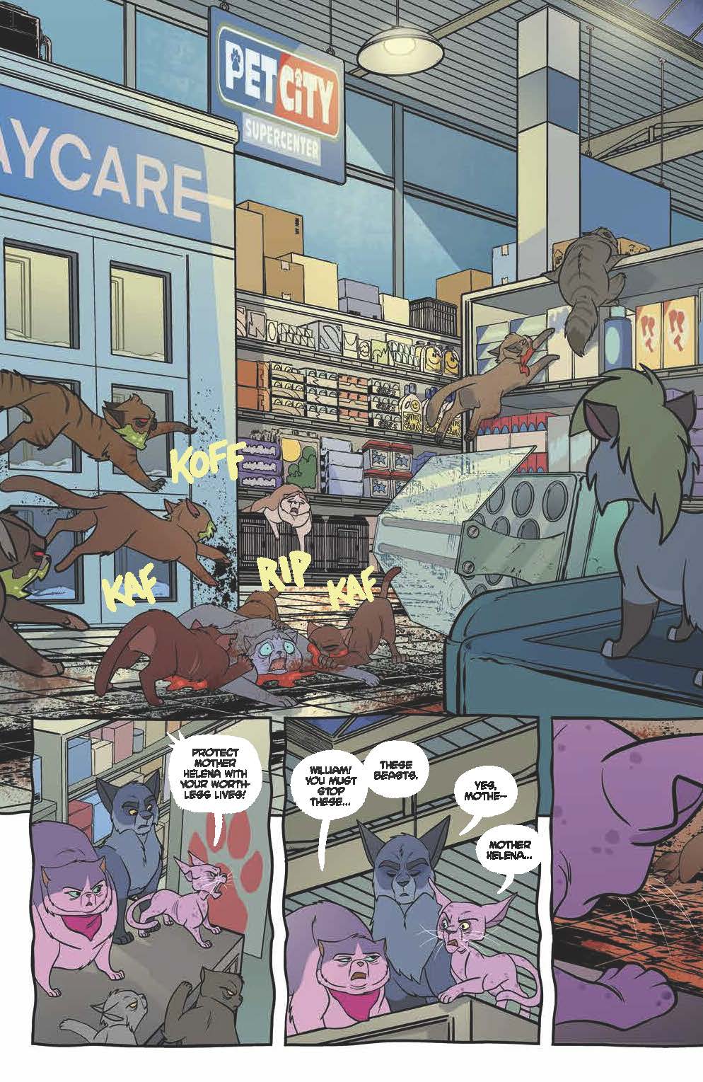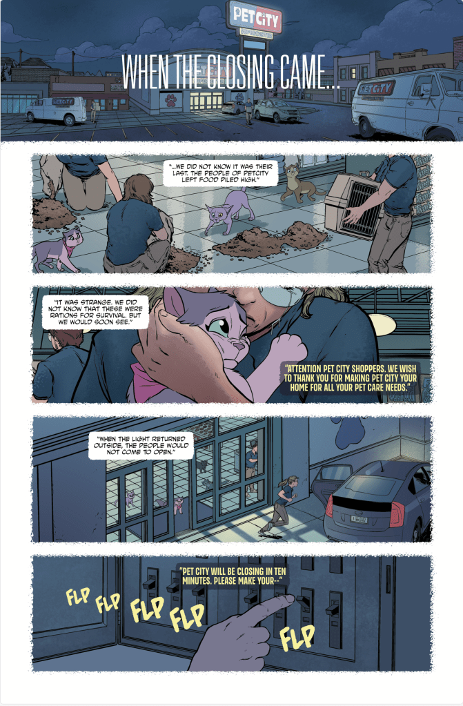 Elsie and her indoor cats face off against Pet City’s strange shut-ins. Winner takes control of the store. Lines are drawn with food, shelter and security hanging in the balance. Elsie is prepared to fight to the death while others are about to switch sides. And none of them are paying any attention to the growing army of rabid beasts outside their front door.