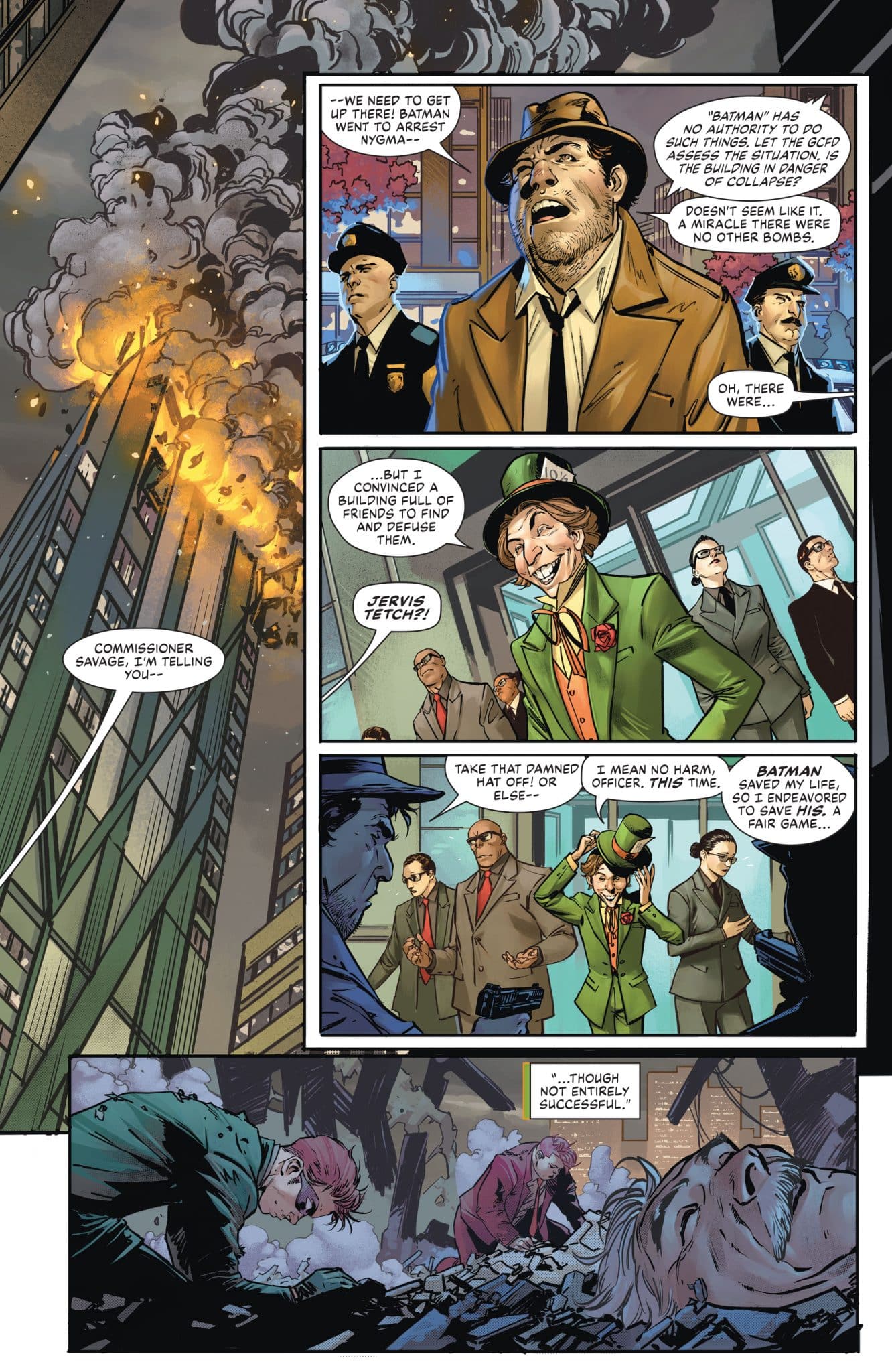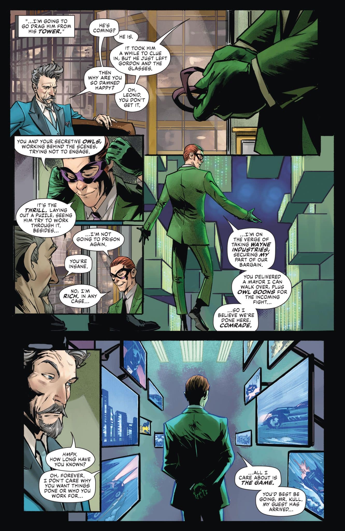 THE RIDDLER’S PLANS FINALLY REVEALED! The GCPD is closing in on their suspected killer–and on Batman! Wayne Enterprises is under attack as Nygma’s plans come into focus. The Owls are not what they seem. Don’t miss the thrilling penultimate issue of “The Dying City”!