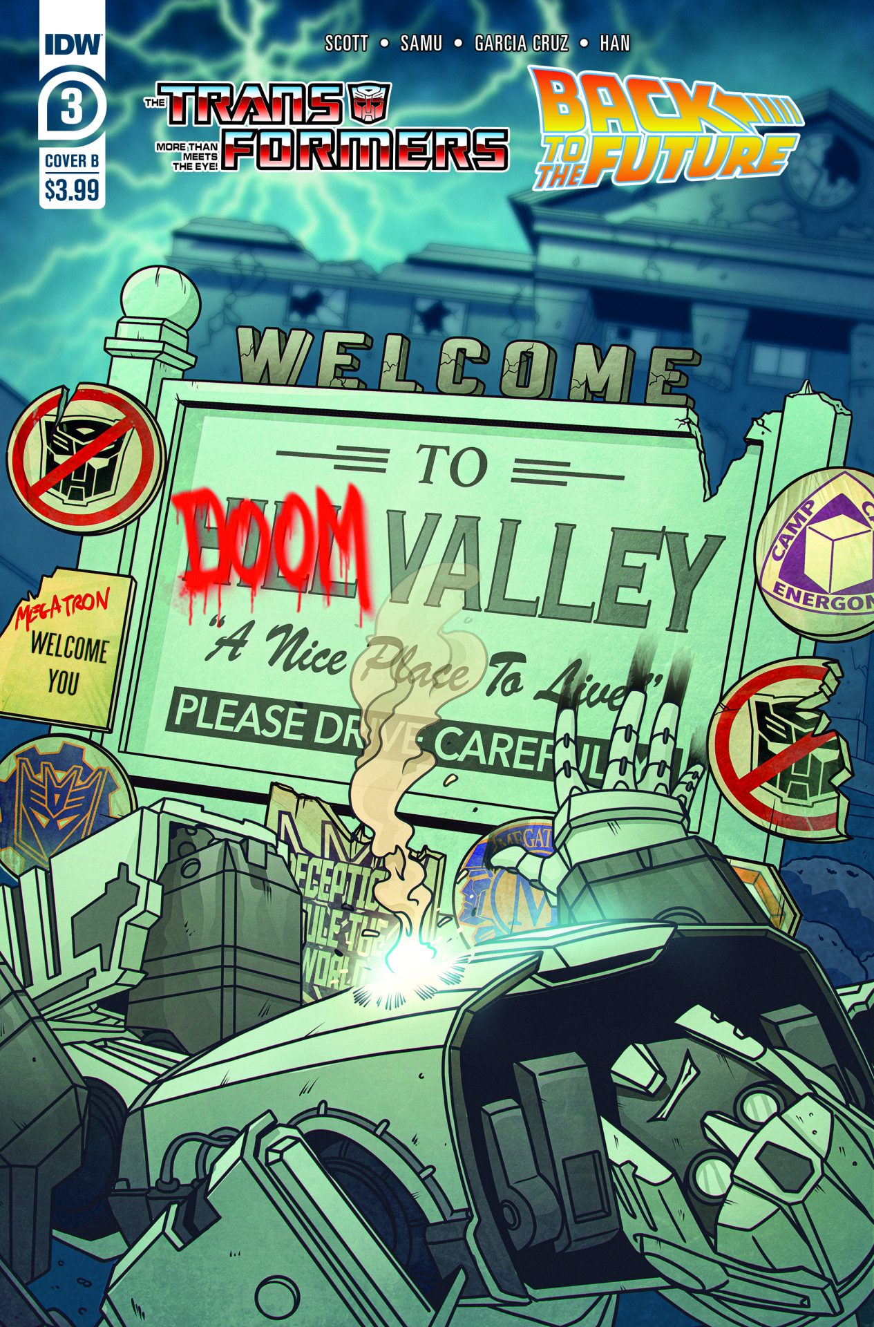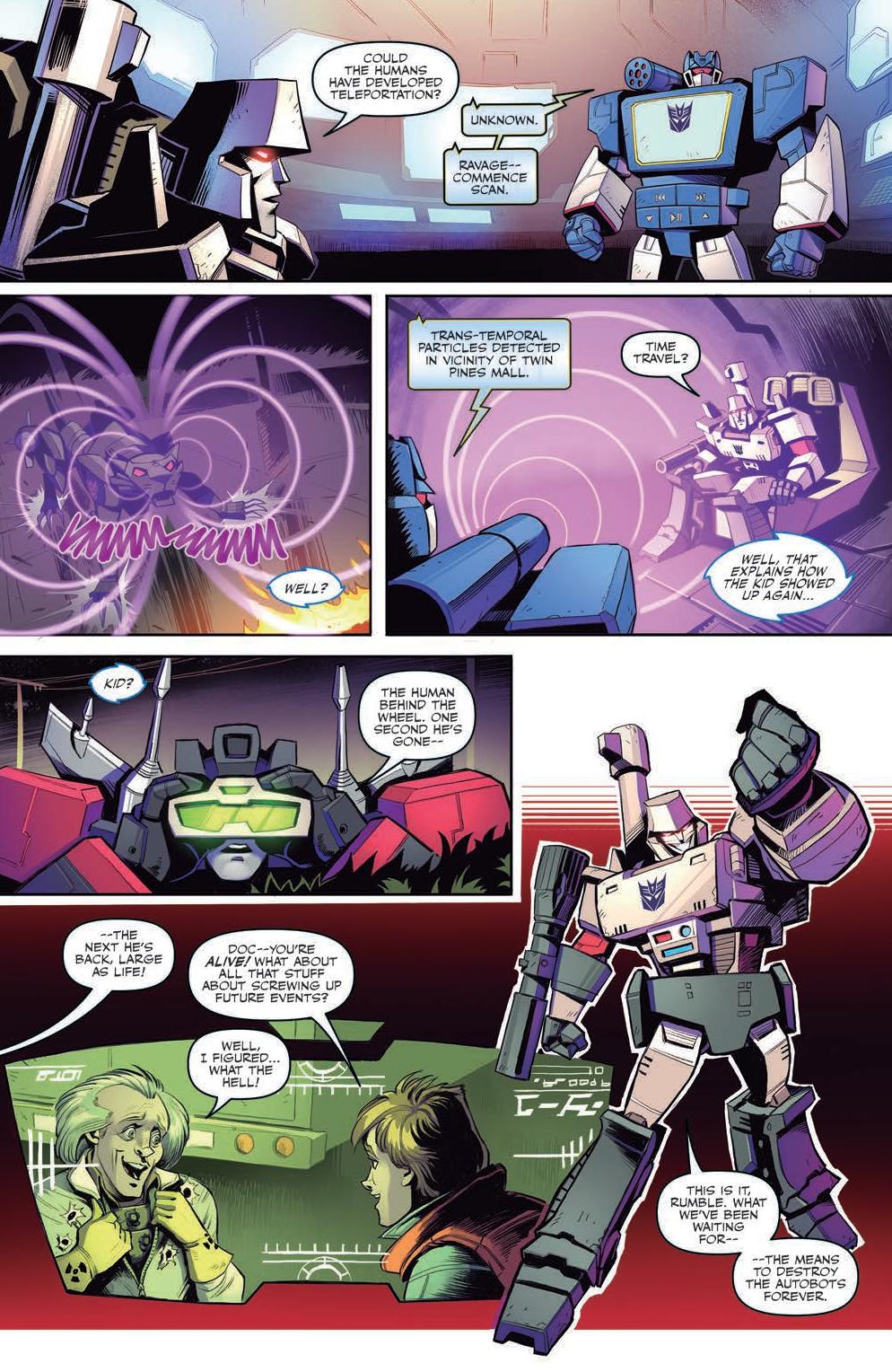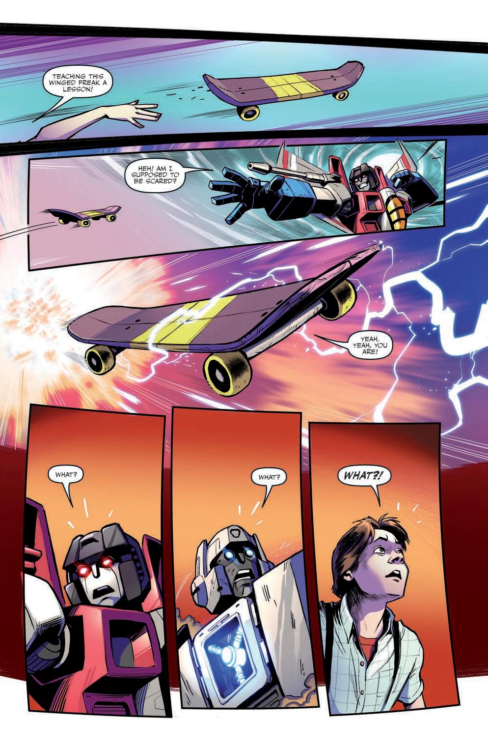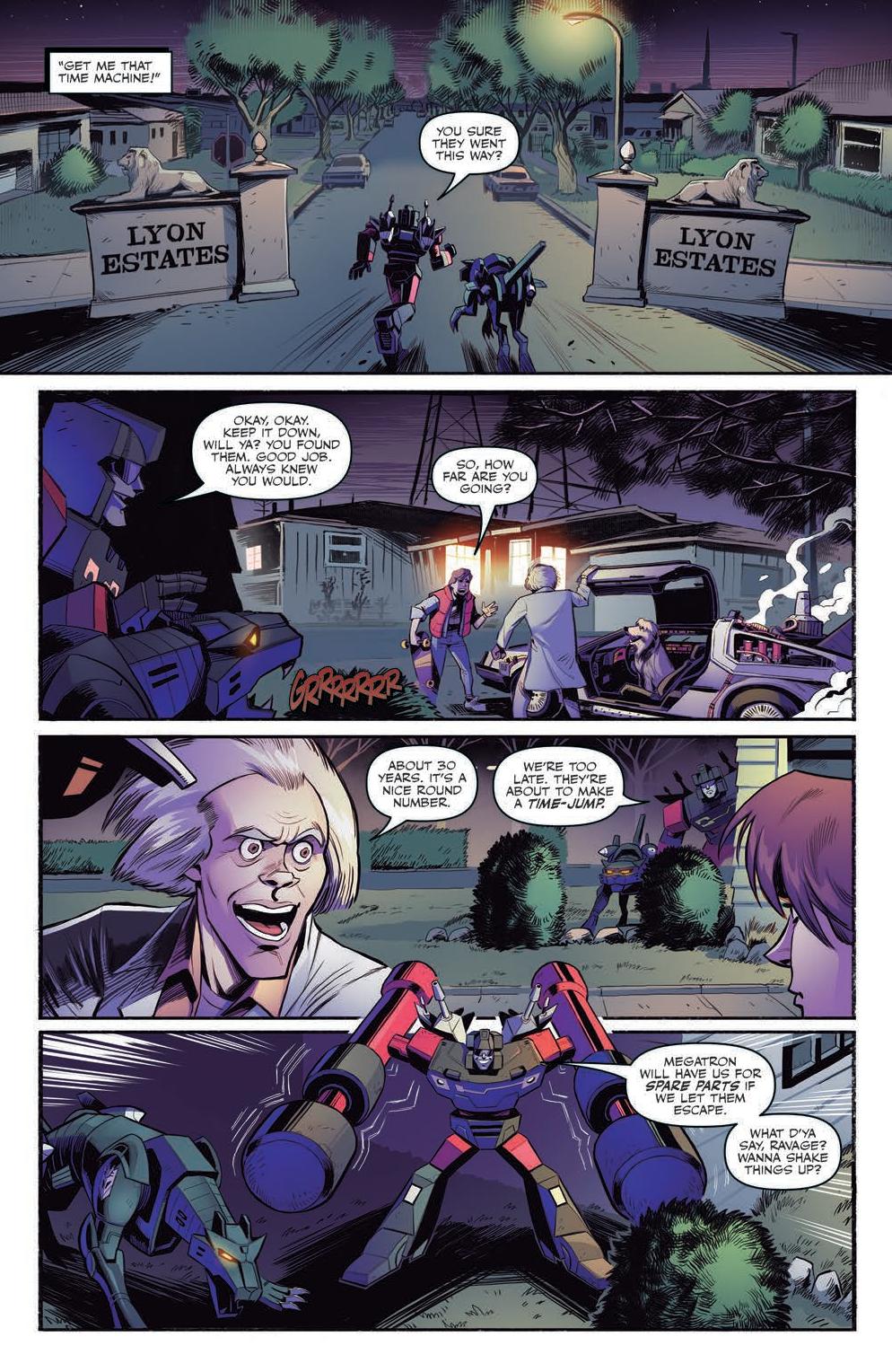 We are taken to 1985, where Doc Brown has just time traveled to 2015 in his DeLorean, but what make this time different is a pair of Decepticons, Starscream and Ravage, were spying on him, deducing that humans have figured out time travel through quantum physics. Eventually Megatron finds out, and so does the Autobots, thanks to Bumblebee, which changes everything in the future. As Doc Brown’s neighbor and protégé, Marty McFly, awakens the next morning after Doc Brown time traveled, to a world ran by Decepticons.as he finds a way to escape the prisoner camp that his family is in, and finds a new Autobot, Gigawatt, who just so happens to transform to a DeLorean. As Marty adjusts to this new reality, he even finds out that his skateboard is a Transformer named Skilz, and he also finds out how they came into power. As Rumble from the Decepticons followed him to 2015, and proceeded to take over Earth using technology from Cybertron. Eventually, Doc Brown reemerges, looking to liberate Earth from Decepticons, through inspiring others and by chance, runs into Marty and the Autobots with his parents. It would not be too long before Megatron’s spies come out of the woodwork, and a fight between the Autobots and Decepticons take place on Hill Valley’s town square, one that would reveal a Decepticon hiding in plain sight, The Clock Tower. As the Autobots fight the Clock Tower, Marty and Doc realize they must travel to 1985 to stop the Decepticons form the following them to the future. By Book’s end, Martyy awakens the Autobots before the Decepticons could sabotage them, Biff becomes the Autobots mechanic and everything is right in the world when he goes back to 1985.