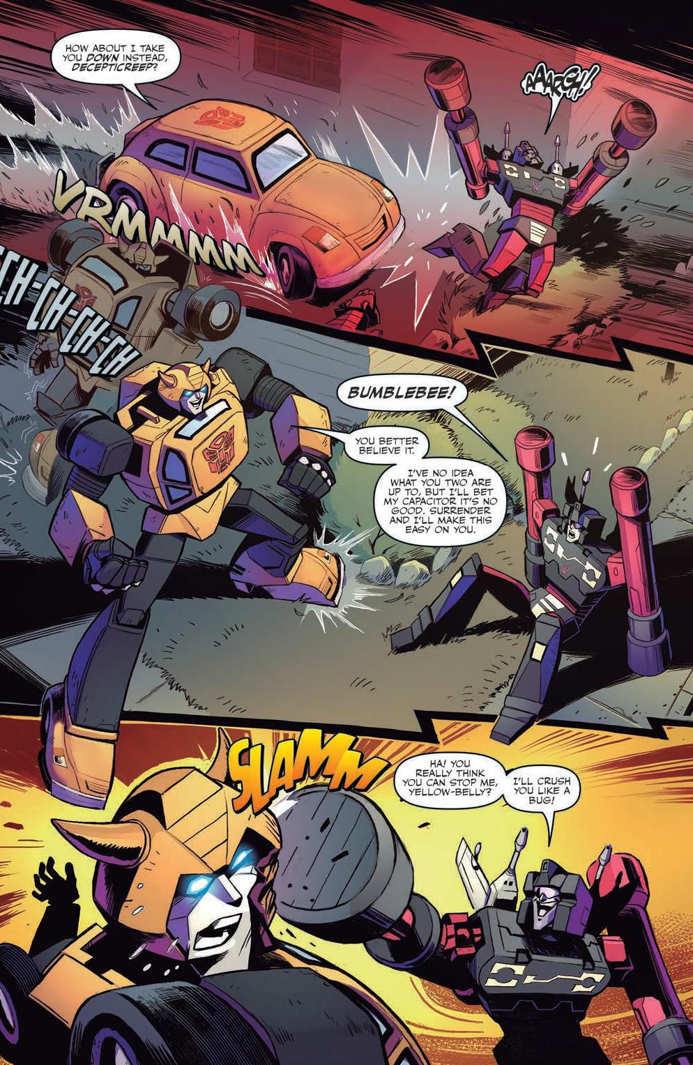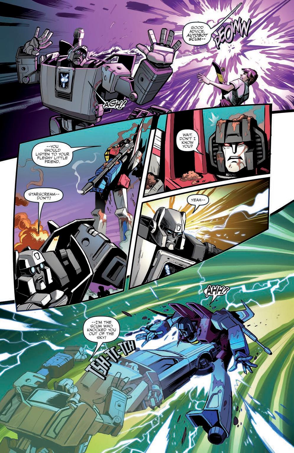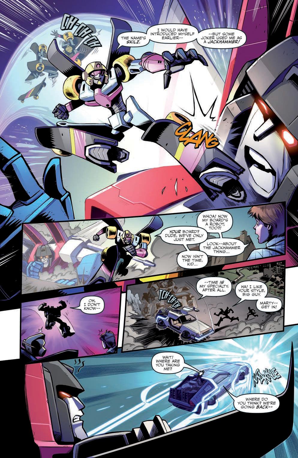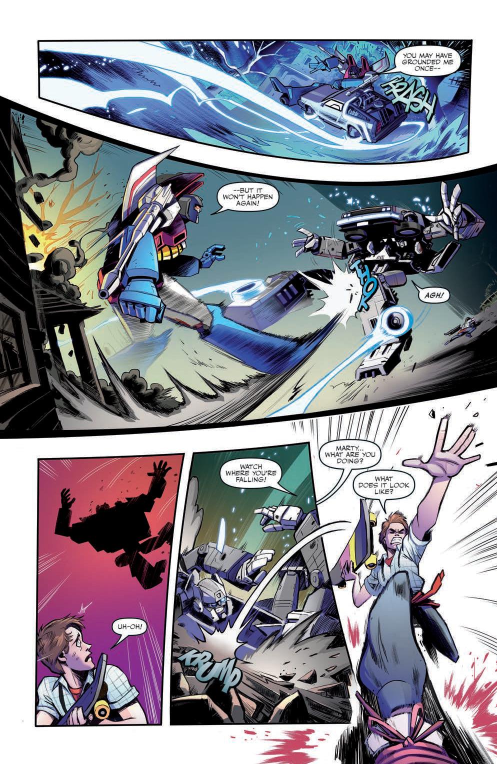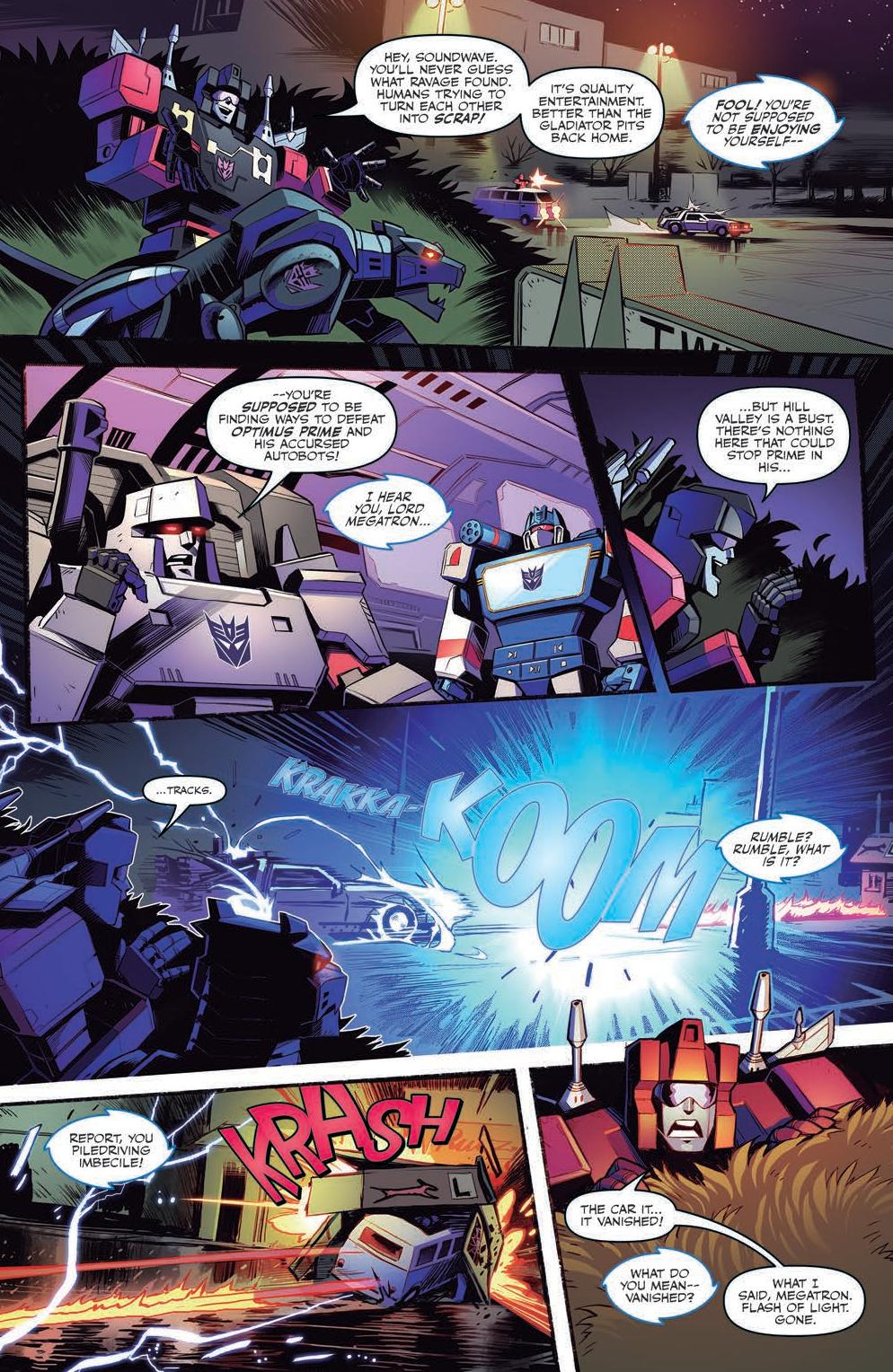 We are taken to 1985, where Doc Brown has just time traveled to 2015 in his DeLorean, but what make this time different is a pair of Decepticons, Starscream and Ravage, were spying on him, deducing that humans have figured out time travel through quantum physics. Eventually Megatron finds out, and so does the Autobots, thanks to Bumblebee, which changes everything in the future. As Doc Brown’s neighbor and protégé, Marty McFly, awakens the next morning after Doc Brown time traveled, to a world ran by Decepticons.as he finds a way to escape the prisoner camp that his family is in, and finds a new Autobot, Gigawatt, who just so happens to transform to a DeLorean. As Marty adjusts to this new reality, he even finds out that his skateboard is a Transformer named Skilz, and he also finds out how they came into power. As Rumble from the Decepticons followed him to 2015, and proceeded to take over Earth using technology from Cybertron. Eventually, Doc Brown reemerges, looking to liberate Earth from Decepticons, through inspiring others and by chance, runs into Marty and the Autobots with his parents. It would not be too long before Megatron’s spies come out of the woodwork, and a fight between the Autobots and Decepticons take place on Hill Valley’s town square, one that would reveal a Decepticon hiding in plain sight, The Clock Tower. As the Autobots fight the Clock Tower, Marty and Doc realize they must travel to 1985 to stop the Decepticons form the following them to the future. By Book’s end, Martyy awakens the Autobots before the Decepticons could sabotage them, Biff becomes the Autobots mechanic and everything is right in the world when he goes back to 1985.
